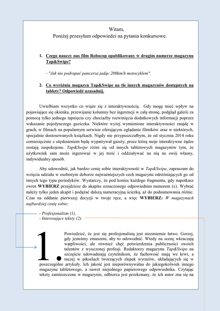Witam, Poniżej przesyłam odpowiedzi na pytania konkursowe. 1. Czego nauczy nas film Robocop opublikowany w drugim numerze magazynu Tap&Swipe? - "Jak nie podrapać pancerza jadąc 200km/h motocyklem". 2. Co wyróżnia magazyn Tap&Swipe na tle innych magazynów dostępnych na tablety? Odpowiedź uzasadnij. Uwielbiam wszystko co wiąże się z interaktywnością. Gdy mogę mieć wpływ na pojawiające się okienka, przewijanie kolumny bez ingerencji w całą stronę, podgląd galerii za pomocą tylko jednego tapnięcia czy chociażby rozwinięcia dodatkowych informacji poprzez wskazanie pojedynczego guziczka. Niektóre wyżej wymienione interaktywności znajdę w grach, w filmach na popularnym serwisie oferującym oglądanie filmików oraz w niektórych, specjalnie dostosowanych książkach. Nigdy nie przypuszczałbym, że od stycznia 2014 roku comiesięcznie z utęsknieniem będę wypatrywał gazety, przez którą moje interaktywne żądze zostają zaspokojone. Tap&Swipe różni się od innych tabletowych magazynów tym, że użytkownik sam może ingerować w jej treść i oddziaływać na nią na swój własny, indywidualny sposób. Aby udowodnić, jak bardzo cenię sobie interaktywność w Tap&Swipe, zapraszam do wzięcia udziału w osobistym doborze najważniejszych cech magazynu odróżniających go od innych tego typu periodyków. Wystarczy, że pod koniec każdego fragmentu, gdy napotkasz zwrot WYBIERZ przejdziesz do akapitu oznaczonego odpowiednim numerem (x). Wybrać należy tylko jeden akapit i podążać dalszą numeracyjną ścieżką, aż do podsumowania różnic. Czas na oddanie pierwszej decyzji w twoje ręce, a więc WYBIERZ: W magazynach najbardziej cenię sobie: - Profesjonalizm (1), - Interesujące teksty (2). Powiedzieć, że jest się profesjonalistą jest niezmiernie łatwo. Gorzej, gdy jesteśmy zmuszeni, aby to udowodnić. Wtedy na scenę wkraczają wątpliwości, ale również chęć potwierdzenia publiczności swoich talentów z wyuczonej profesji. Redaktorzy magazynu Tap&Swipe na szczęście udowadniają czytelnikom, że fachowość mają we krwi, a raczej w pikselach tworzących zlepek wyrazów, układających się w poszczególne artykuły. Ich jakość jest nieporównywalna do jakiegokolwiek innego magazynu tabletowego, a nawet niejednego papierowego odpowiednika. Czytając teksty zamieszczone w magazynie, odbiorca jest przekonany, że ich autor zna się na 1. rzeczy jak nikt inny i raczy go profesjonalną opinią, która napisana jest językiem zrozumiałym i melodyjnym. WYBIERZ: Lubię gdy…: - Cena magazynu jest przystępna (3), - Magazyn prezentuje aktualne treści (5). Tap&Swipe to nowoczesne czasopismo skierowane bardziej do mężczyzn, niżeli do płci piękniejszej. Nie odznacza to jednak, że kobiety nie znajdą w niej czegoś dla siebie. Całość prezentuje się wybornie i jest ucztą dla oka. Artykuły są frapujące i przykuwające uwagę czytelnika w taki sposób, że ten chce zostać z nimi na dłużej. Podział na działy był strzałem w dziesiątkę, dzięki czemu czytelnik może szybko znaleźć interesującego go teksty. Sama jakość tekstów jest wyborna – jest profesjonalnie, rzeczowo i na temat. Przy ich lekturze nie sposób się nudzić, czego nie można powiedzieć o tekstach konkurencji. Tap&Swipe gwarantuje, że podczas jego eksploracji nie wkradnie się nuda ani monotonia. WYBIERZ: Zwracam uwagę na…: 2. - Przejrzysty interfejs magazynu (4), - Oryginalność przedstawienia artykułów (7). Obawiałem się, że mój portfel schudnie po ściągnięciu aplikacji Tap&Swipe ze sklepu Google – nie lubię kupować kota w worku ani uczestniczyć w żadnych mikropłatnościach, które ostatnimi czasy są modne wśród programistów. Na szczęście spotkała mnie bardzo miła niespodzianka! Magazyn jest całkowicie darmowy i wolny od jakichkolwiek wydatków związanych z koniecznością użycia środków bankowych. Jest to kolejny, niewątpliwy atut czasopisma znajdującego się pod redakcją Pawła Paczuskiego. PRZEJDŹ DO ZAKOŃCZENIA (6). 3. Cenię sobie przejrzystość treści. Lubię gdy wszystko jest logicznie poukładane, kiedy czcionka jest idealnie wyważona, a szata graficzna nie odstrasza niczym kolejny film Uwe Bolla. Wygląd magazynu prezentuje naprawę wysoki poziom i wszystkie wcześniej wymienione cechy się w nim znajdują. Połączenie kafelek i niekiedy śmiałych, ale dobrze dobranych kolorów nadaje magazynowi nowoczesności i czytelności. Zdawać by się mogło, że każda kolejna strona jest inna, przez co odbiorca nie tonie w szarzyźnie i niezmienności. Dosyć mam nieczytelności i błędów w wyglądzie innych magazynów, więc tym bardziej doceniam wkład grafików w wygląd Tap&Swipe. PRZEJDŹ DO ZAKOŃCZENIA (9). 4. 5. Nie byłeś na targach technologicznych, które odbyły się miesiąc temu? Przegapiłeś ostatnie nowinki w dziedzinie komputerów, tabletów bądź smartfonów? Chciałeś przeczytać test nowego urządzenia, które jest na rynku dopiero od kilkudziesięciu dni? Nic bardziej prostszego! Wszystkie tego typu informacje znajdziesz w recenzowanym piśmie. Newsy są aktualne i powalają bogactwem materiałów – zarówno tych pisanych, jak i tych, które możemy odtworzyć bezpośrednio z gazety. Już nigdy nie będę musiał się martwić o swoje zacofanie z dziedzin technologicznych i nie tylko. PRZEJDŹ DO ZAKOŃCZENIA (8). A więc najbardziej w czasopismach cenisz sobie profesjonalizm i jego atrakcyjną cenę. To tak jak ja, więc nic dziwnego, że Tap&Swipe zagości w moim tablecie na dłużej. Lecz ten magazyn to nie tylko wcześniej wymienione cechy. To także aktualnie treści okraszone pięknym, przejrzystym interfejsem oraz oryginalnym sposobem przedstawiania treści. W żadnym innym tabletowym magazynie nie znalazłem wszystkich tych walorów, więc Tap&Swipe miażdży konkurencje w każdej dziedzinie. Oby trzymał dalej taki poziom jak dotychczasowe numery! 6. To co odróżnia T