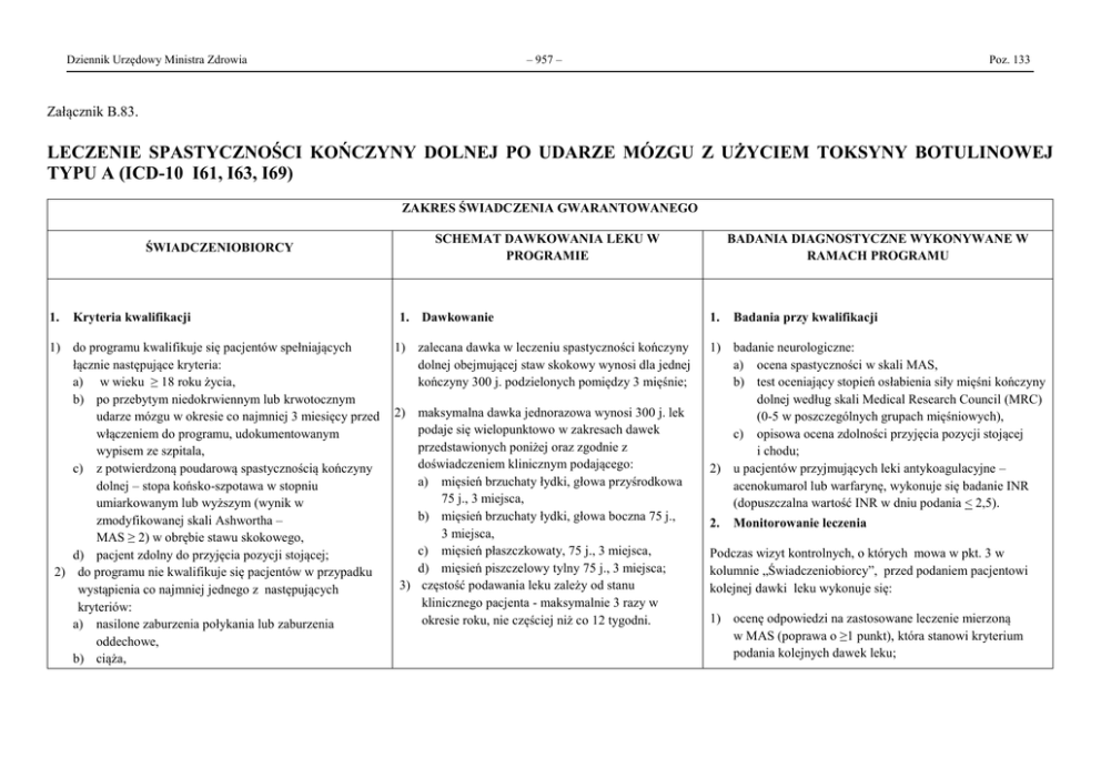 Dziennik Urzędowy Ministra Zdrowia – 957 – Poz. 133 Załącznik B.83. LECZENIE SPASTYCZNOŚCI KOŃCZYNY DOLNEJ PO UDARZE MÓZGU Z UŻYCIEM TOKSYNY BOTULINOWEJ TYPU A (ICD-10 I61, I63, I69) ZAKRES ŚWIADCZENIA GWARANTOWANEGO ŚWIADCZENIOBIORCY 1. Kryteria kwalifikacji 1) do programu kwalifikuje się pacjentów spełniających łącznie następujące kryteria: a) w wieku ≥ 18 roku życia, b) po przebytym niedokrwiennym lub krwotocznym udarze mózgu w okresie co najmniej 3 miesięcy przed włączeniem do programu, udokumentowanym wypisem ze szpitala, c) z potwierdzoną poudarową spastycznością kończyny dolnej – stopa końsko-szpotawa w stopniu umiarkowanym lub wyższym (wynik w zmodyfikowanej skali Ashwortha – MAS ≥ 2) w obrębie stawu skokowego, d) pacjent zdolny do przyjęcia pozycji stojącej; 2) do programu nie kwalifikuje się pacjentów w przypadku wystąpienia co najmniej jednego z następujących kryteriów: a) nasilone zaburzenia połykania lub zaburzenia oddechowe, b) ciąża, SCHEMAT DAWKOWANIA LEKU W PROGRAMIE 1. Dawkowanie 1) zalecana dawka w leczeniu spastyczności kończyny dolnej obejmującej staw skokowy wynosi dla jednej kończyny 300 j. podzielonych pomiędzy 3 mięśnie; 2) maksymalna dawka jednorazowa wynosi 300 j. lek podaje się wielopunktowo w zakresach dawek przedstawionych poniżej oraz zgodnie z doświadczeniem klinicznym podającego: a) mięsień brzuchaty łydki, głowa przyśrodkowa 75 j., 3 miejsca, b) mięsień brzuchaty łydki, głowa boczna 75 j., 3 miejsca, c) mięsień płaszczkowaty, 75 j., 3 miejsca, d) mięsień piszczelowy tylny 75 j., 3 miejsca; 3) częstość podawania leku zależy od stanu klinicznego pacjenta - maksymalnie 3 razy w okresie roku, nie częściej niż co 12 tygodni. BADANIA DIAGNOSTYCZNE WYKONYWANE W RAMACH PROGRAMU 1. Badania przy kwalifikacji 1) badanie neurologiczne: a) ocena spastyczności w skali MAS, b) test oceniający stopień osłabienia siły mięśni kończyny dolnej według skali Medical Research Council (MRC) (0-5 w poszczególnych grupach mięśniowych), c) opisowa ocena zdolności przyjęcia pozycji stojącej i chodu; 2) u pacjentów przyjmujących leki antykoagulacyjne – acenokumarol lub warfarynę, wykonuje się badanie INR (dopuszczalna wartość INR w dniu podania < 2,5). 2. Monitorowanie leczenia Podczas wizyt kontrolnych, o których mowa w pkt. 3 w kolumnie „Świadczeniobiorcy”, przed podaniem pacjentowi kolejnej dawki leku wykonuje się: 1) ocenę odpowiedzi na zastosowane leczenie mierzoną w MAS (poprawa o ≥1 punkt), która stanowi kryterium podania kolejnych dawek leku; Dziennik Urzędowy Ministra Zdrowia miastenia i zespół miasteniczny - na podstawie badania neurologicznego (wykonanie dodatkowych badań jedynie w uzasadnionych przypadkach), d) objawy uogólnionego zakażenia, e) obecność stanu zapalnego w obrębie planowanego miejsca podania, f) utrwalone przykurcze w tkankach miękkich i stawach; 3) kwalifikacja pacjenta do programu następuje kiedy pacjent ma wyznaczony termin rozpoczęcia rehabilitacji medycznej potwierdzony przez podmiot udzielający świadczeń rehabilitacyjnych; 4) rozpoczęcie rehabilitacji medycznej musi nastąpić najpóźniej do 4 tygodni od podania leku. c) 2. Określenie czasu leczenia w programie Czas leczenia w programie określa lekarz prowadzący leczenie pacjenta. Zalecany czas leczenia w ramach programu to dwa lata. Czas ten może zostać wydłużony, jednak nie więcej niż o kolejne dwa lata (łączny czas pozostawania pacjenta w programie nie może przekraczać czterech lat). W przypadku wystąpienia u pacjenta przynajmniej jednego z kryteriów wyłączenia z programu, pacjent zostaje wyłączony z programu bez zbędnej zwłoki. 3. Podawanie leku w ramach programu 1) leczenie w programie obejmuje maksymalnie do 6 podań leku w okresie do 2 lat (lub do 12 podań w okresie do 4 lat); 2) o liczbie podań, jaką otrzyma pacjent, decyduje lekarz prowadzący. Liczba podań leku zależy od uzyskania przez pacjenta dobrej odpowiedzi na leczenie, która będzie weryfikowana podczas wizyt kontrolnych: – 958 – W wyjątkowo trudnych przypadkach możliwe jest podawanie leku pod kontrolą elektromiografii (EMG), stymulacji elektrycznej mięśnia lub ultrasonografii. Poz. 133 2) ocenę efektu podania leku według lekarza i według pacjenta oceniana za pomocą skali CGI – IS (Clinical Global Imperssion – Improvement Scale); 3) test oceniający stopień osłabienia siły mięśni kończyny dolnej według skali Medical Research Council (MRC) (0-5 w poszczególnych grupach mięśniowych); 4) opisową ocenę czynności stania i chodu; 5) w dokumentacji medycznej pacjenta zamieszcza się informację o rodzaju i formie prowadzonej u pacjenta rehabilitacji. 3. Monitorowanie programu 1) gromadzenie w dokumentacji medycznej pacjenta danych dotyczących monitorowania leczenia i każdorazowe ich przedstawianie na żądanie kontrolerów Narodowego Funduszu Zdrowia; 2) uzupełnienie danych zawartych w rejestrze (SMPT) dostępnym za pomocą aplikacji internetowej udostępnionej przez OW NFZ, z częstotliwością zgodną z opisem programu oraz na zakończenie leczenia; 3) przekazywanie informacji sprawozdawczorozliczeniowych do NFZ: informacje przekazuje się do NFZ w formie papierowej lub w formie elektronicznej, zgodnie z wymaganiami opublikowanymi przez Narodowy Fundusz Zdrowia. Dziennik Urzędowy Ministra Zdrowia wizyta kontrolna powinna odbyć się po 4-8 tygodniach po każdorazowym podaniu leku, b) kolejna wizyta kontrolna bezpośrednio przed oczekiwanym kolejnym podaniem leku – najwcześniej po 12 tygodniach od podania poprzedniej dawki leku. a) 4. Kryteria wyłączenia z programu 1) nadwrażliwość na kompleks neurotoksyny lub którykolwiek ze składników leku; 2) utrwalony przykurcz kończyny dolnej w zakresie stawu skokowego; 3) potwierdzenie miastenii lub zespołu miastenicznego; 4) objawy uogólnionego zakażenia; 5) ciężkie zaburzenia połykania 
