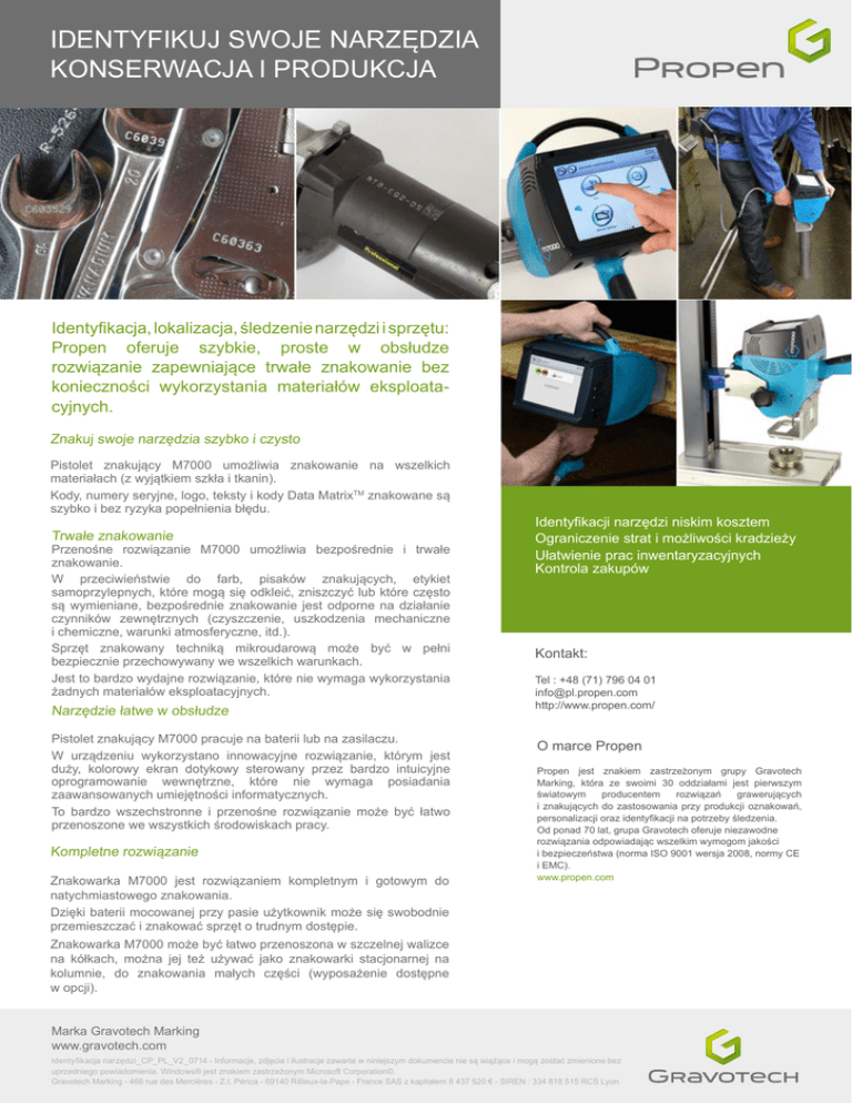 IDENTYFIKUJ SWOJE NARZĘDZIA KONSERWACJA I PRODUKCJA Identyfikacja, lokalizacja, śledzenie narzędzi i sprzętu: Propen oferuje szybkie, proste w obsłudze rozwiązanie zapewniające trwałe znakowanie bez konieczności wykorzystania materiałów eksploatacyjnych. Znakuj swoje narzędzia szybko i czysto Pistolet znakujący M7000 umożliwia znakowanie na wszelkich materiałach (z wyjątkiem szkła i tkanin). Kody, numery seryjne, logo, teksty i kody Data MatrixTM znakowane są szybko i bez ryzyka popełnienia błędu. Trwałe znakowanie Przenośne rozwiązanie M7000 umożliwia bezpośrednie i trwałe znakowanie. W przeciwieństwie do farb, pisaków znakujących, etykiet samoprzylepnych, które mogą się odkleić, zniszczyć lub które często są wymieniane, bezpośrednie znakowanie jest odporne na działanie czynników zewnętrznych (czyszczenie, uszkodzenia mechaniczne i chemiczne, warunki atmosferyczne, itd.). Sprzęt znakowany techniką mikroudarową może być w pełni bezpiecznie przechowywany we wszelkich warunkach. Jest to bardzo wydajne rozwiązanie, które nie wymaga wykorzystania żadnych materiałów eksploatacyjnych. Narzędzie łatwe w obsłudze Pistolet znakujący M7000 pracuje na baterii lub na zasilaczu. W urządzeniu wykorzystano innowacyjne rozwiązanie, którym jest duży, kolorowy ekran dotykowy sterowany przez bardzo intuicyjne oprogramowanie wewnętrzne, które nie wymaga posiadania zaawansowanych umiejętności informatycznych. To bardzo wszechstronne i przenośne rozwiązanie może być łatwo przenoszone we wszystkich środowiskach pracy. Kompletne rozwiązanie Znakowarka M7000 jest rozwiązaniem kompletnym i gotowym do natychmiastowego znakowania. Dzięki baterii mocowanej przy pasie użytkownik może się swobodnie przemieszczać i znakować sprzęt o trudnym dostępie. Identyfikacji narzędzi niskim kosztem Ograniczenie strat i możliwości kradzieży Ułatwienie prac inwentaryzacyjnych Kontrola zakupów Kontakt: Tel : +48 (71) 796 04 01 [email protected] http://www.propen.com/ O marce Propen Propen jest znakiem zastrzeżonym grupy Gravotech Marking, która ze swoimi 30 oddziałami jest pierwszym światowym producentem rozwiązań grawerujących i znakujących do zastosowania przy produkcji oznakowań, personalizacji oraz identyfikacji na potrzeby śledzenia. Od ponad 70 lat, grupa Gravotech oferuje niezawodne rozwiązania odpowiadając wszelkim wymogom jakości i bezpieczeństwa (norma ISO 9001 wersja 2008, normy CE i EMC). www.propen.com Znakowarka M7000 może być łatwo przenoszona w szczelnej walizce na kółkach, można jej też używać jako znakowarki stacjonarnej na kolumnie, do znakowania małych części (wyposażenie dostępne w opcji). Marka Gravotech Marking www.gravotech.com Identyfikacja narzędzi_CP_PL_V2_0714 - Informacje, zdjęcia i ilustracje zawarte w niniejszym dokumencie nie są wiążące i mogą zostać zmienione bez uprzedniego powiadomienia. Windows® jest znakiem zastrzeżonym Microsoft Corporation©. Gravotech Marking - 466 rue des Mercières - Z.I. Périca - 69140 Rillieux-la-Pape - France SAS z kapitałem 8 437 520 € - SIREN : 334 818 515 RCS Lyon.