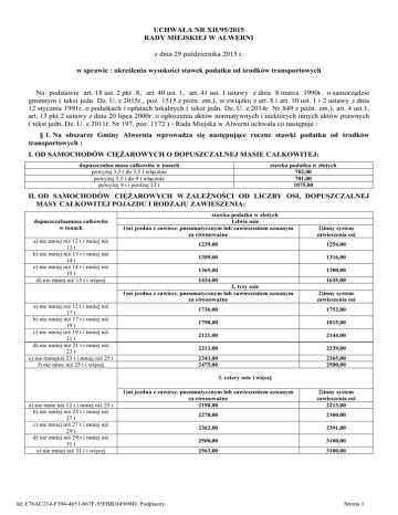 UCHWAŁA NR XII/95/2015 RADY MIEJSKIEJ W ALWERNI z dnia 29 października 2015 r. w sprawie : określenia wysokości stawek podatku od środków transportowych Na podstawie art. 18 ust. 2 pkt 8, art. 40 ust. 1, art. 41 ust. 1 ustawy z dnia 8 marca 1990r. o samorządzie gminnym ( tekst jedn. Dz. U. z 2015r., poz. 1515 z późn. zm.), w związku z art. 8 i art. 10 ust. 1 i 2 ustawy z dnia 12 stycznia 1991r. o podatkach i opłatach lokalnych ( tekst jedn. Dz. U. z 2014r. Nr 849 z późn. zm.), art. 4 ust.1, art. 13 pkt 2 ustawy z dnia 20 lipca 2000r. o ogłoszeniu aktów normatywnych i niektórych innych aktów prawnych ( tekst jedn. Dz. U. z 2011r. Nr 197, poz. 1172 ) - Rada Miejska w Alwerni uchwala co następuje : § 1. Na obszarze Gminy Alwernia wprowadza się następujące roczne stawki podatku od środków transportowych : I. OD SAMOCHODÓW CIĘŻAROWYCH O DOPUSZCZALNEJ MASIE CAŁKOWITEJ: dopuszczalna masa całkowita w tonach powyżej 3,5 t do 5,5 t włącznie powyżej 5,5 t do 9 t włącznie powyżej 9 t i poniżej 12 t stawka podatku w złotych 702,00 781,00 1075,00 II. OD SAMOCHODÓW CIĘŻAROWYCH W ZALEŻNOŚCI OD LICZBY OSI, DOPUSZCZALNEJ MASY CAŁKOWITEJ POJAZDU I RODZAJU ZAWIESZENIA: dopuszczalnamasa całkowita w tonach stawka podatku w złotych 1.dwie osie 1)oś jezdna z zawiesz. pneumatycznym lub zawieszeniem uznanym za równoważne 2)inny system zawieszenia osi 1239,00 1254,00 1309,00 1316,00 1365,00 1380,00 1434,00 1635,00 2. trzy osie 1)oś jezdna z zawiesz. pneumatycznym lub zawieszeniem uznanym za równoważne 2)inny system zawieszenia osi 1736,00 1752,00 1798,00 1815,00 2121,00 2144,00 2213,00 2239,00 2343,00 2475,00 2365,00 2500,00 a) nie mniej niż 12 t i mniej niż 13 t b) nie mniej niż 13 t i mniej niż 14 t c) nie mniej niż 14 t i mniej niż 15 t d) nie mniej niż 15 t i więcej a) nie mniej niż 12 t i mniej niż 17 t b) nie mniej niż 17 t i mniej niż 19 t c) nie mniej niż 19 t i mniej niż 21 t d) nie mniej niż 21 t i mniej niż 23 t e) nie mniejniż 23 t i mniej niż 25 t f) nie mnie niż 25 t i więcej 3. cztery osie i więcej a) nie mnie niż 12 t i mniej niż 25 t b) nie mniej niż 25 t i mniej niż 27 t c) nie mniej niż 27 t i mniej niż 29 t d) nie mniej niż 29 t i mniej niż 31 t e) nie mniej niż 31 t i więcej 1)oś jezdna z zawiesz. pneumatycznym lub zawieszeniem uznanym za równoważne 2190,00 2)inny system zawieszenia osi 2213,00 2278,00 2300,00 2362,00 2391,00 2500,00 3100,00 2563,00 3100,00 Id: E76AC214-F394-4651-867F-55FBB36F698D. Podpisany Strona 1 III. OD CIĄGNIKA SIODŁOWEGO LUB BALASTOWEGO PRZYSTOSOWANEGO DO UŻYWANIA ŁĄCZNIE Z NACZEPĄ LUB PRZYCZEPĄ O DOPUSZCZALNEJ MASIE CAŁKOWITEJ ZESPOŁU POJAZDÓW: dopuszczalna masa całkowitaw tonach od 3,5 t i poniżej 12 t stawka podatku w złotych 1105,00 IV. OD CIĄGNIKA SIODŁOWEGO LUB BALASTOWEGO PRZYSTOSOWANEGO DO UŻYWANIA ŁĄCZNIE Z NACZEPĄ LUB PRZYCZEPĄ O DOPUSZCZALNEJ MASIE CAŁKOWITEJ ZESPOŁU POJAZDÓW: dopuszczalna masa całkowita zespołu pojazdów w tonach stawka podatku w złotych 1.dwie osie 1)oś jezdna z zawiesz. pneumatycznym lub zawieszeniem uznanym za równoważne 2)inny system zawieszenia osi 1261,00 1302,00 1340,00 1357,00 1417,00 1434,00 1845,00 2396,00 1849,00 2540,00 2. trzy osie i więcej 1) oś jezdna z zawiesz. pneumatycznym lub zawieszeniem uznanym za równoważne 2) inny system zawieszenia osi 1627,00 2250,00 1630,00 2250,00 2252,00 3100,00 a) nie mniej niż 12 t i mniej niż 18 t b) nie mniej niż 18 t i mniej niż 25 t c) nie mniej niż 25 t i mniej niż 31 t d) nie mniej niż 31 t do 36 t włącznie e) powyżej 36 t a) nie mniej niż 12 t do 36 t włącznie b) powyżej 36 t i mniej niż 40 t c) nie mniej niż 40 t i więcej V. OD PRZYCZEP I NACZEP, Z WYJĄTKIEM ZWIĄZANYCH WYŁĄCZNIE Z DZIAŁALNOŚCIĄ ROLNICZĄ PROWADZONĄ PRZEZ PODATNIKA PODATKU ROLNEGO, UŻYWANYCH ŁĄCZNIE Z POJAZDEM SILNIKOWYM O DOPUSZCZALNEJ MASIE CAŁKOWITEJ ZESPOŁU POJAZDÓW: dopuszczalna masa całkowitaw tonach od 7 t i poniżej 12 t stawka podatku w złotych 217,00 VI. OD PRZYCZEP I NACZEP, Z WYJĄTKIEM ZWIĄZANYCH WYŁĄCZNIE Z DZIAŁALNOŚCIĄ ROLNICZĄ PROWADZONĄ PRZEZ PODATNIKA PODATKU ROLNEGO, UŻYWANYCH ŁĄCZNIE Z POJAZDEM SILNIKOWYM O DOPUSZCZALNEJ MASIE CAŁKOWITEJ ZESPOŁU POJAZDÓW, LICZBIE OSI I RODZAJU ZAWIESZENIA: stawka podatku w złotych dopuszczalna masa całkowita zespołu pojazdów w tonach 1. jedna oś 1) oś jezdna z zawiesz. pneumatycznym lub zawieszeniem uznanym za równoważne 2) inny system zawieszenia osi 313,00 324,00 472,00 480,00 664,00 733,00 765,00 830,00 2. dwie osie 1)oś jezdna z zawiesz. pneumatycznym lub zawieszeniem uznanym za równoważne 2)inny system zawieszenia osi 692,00 718,00 800,00 1109,00 1109,00 1684,00 a) nie mniej niż 12 t i mniej niż 18 t b) nie mniej niż 18 t i mniej niż 25 t c) nie mniej niż 25 t do 36 t włącznie d) powyżej 36 t a) nie mniej niż 12 t i mniej niż 28 t b) nie mniej niż 28 t i mniej niż 33 t c) nie mniej niż 33 t do 36 t włącznie Id: E76AC214-F394-4651-867F-55FBB36F698D. Podpisany Strona 2 d) powyżej 36 t i mniej niż 38 t 1111,00 1693,00 e) nie mniej niż 38 t i powyżej 1502,00 2221,00 3. trzy osie i więcej 1) oś jezdna z zawiesz. pneumatycznym lub zawieszeniem uznanym za równoważne 2) inny system zawieszenia osi a) nie mniej niż 12 t do 36 t włącznie 884,00 1232,00 b) powyżej 36 t i mniej niż 38 t 885,00 1239,00 c) nie mniej niż 38 t i powyżej 1232,00 1674,00 VII. OD AUTOBUSU, W ZALEŻNOŚCI OD LICZBY MIEJSC DO SIEDZENIA POZA MIEJSCEM KIEROWCY: liczba miejsc do siedzenia mniejsza niż 22 miejsca równa lub wyższa niż 22 miejsca stawka podatku w złotych 798,00 1778,00 § 2. Traci moc uchwała Nr XII/82/2013 Rady Miejskiej w Alwerni, z dnia 6 grudnia 2013r. w sprawie określenia wysokości stawek podatku od środków transportowych. § 3. Uchwała podlega ogłoszeniu w Dzienniku Urzędowym Województwa Małopolskiego oraz na tablicy ogłoszeń w budynku Urzędu Miejskiego w Alwerni