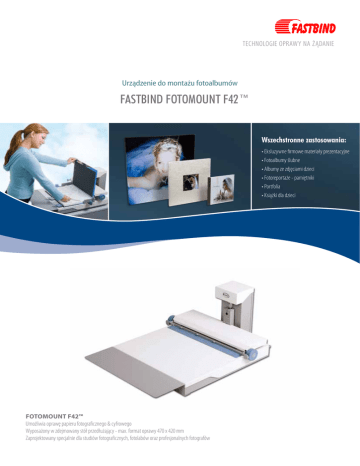 technologie oprawy na żądanie Urządzenie do montażu fotoalbumów Fastbind FotoMount F42™ Wszechstronne zastosowania: • Eksluzywne firmowe materiały prezentacyjne • Fotoalbumy ślubne • Albumy ze zdjęciami dzieci • Fotoreportaże - pamiętniki • Portfolia • Książki dla dzieci FotoMount F42™ Umożliwia oprawę papieru fotograficznego & cyfrowego Wyposażony w zdejmowany stół przedłużający - max. format oprawy 470 x 420 mm Zaprojektowany specjalnie dla studiów fotograficznych, fotolabów oraz profesjonalnych fotografów Fastbind FotoMount F42™ Stwórz luksusowe fotoalbumy Fastbind FotoMount F42™ to ręczne urządzenie do montażu fotoalbumów w dużych formatach, oparte na nowatorskim systemie Mountinglift™ (system opatentowany). Urządzenie wyposażone jest w zdejmowany stół przedłużający, zapewniający maksymalnie ergonomiczną pracę. Po zamontowaniu stołu możesz tworzyć fotoalbumy o maksymalnym formacie 470 x 420 mm, używając papieru fotograficznego, kartonu, materiału laminowanego lub dowolnego papieru drukarskiego do swoich zdjęć. Okładka książki – albumu może być standardowa lub w pełni personalizowana, wykonana na zamówienie w postaci wydruku cyfrowego*. W ciągu kilku minut możesz samodzielnie stworzyć profesjonalny, otwierający się płasko fotoalbum, oszczędzając czas i zwiększając zysk. Dla profesjonalnych fotografów i drukarni cyfrowych Fastbind FotoMount F42™ jest najlepszym rozwiązaniem, zaprojektowanym z myślą nie tylko o studio fotograficznym, pracowni fotograficznej, czy o profesjonalnych fotografach. Urządzenie doskonale spełnia też oczekiwania drukarni cyfrowych, punktów ksero, małych wydawnictw, które również mogą zaoferować tego typu książki swoim klientom. Zdejmowany stół przedłużający umożliwia umieszczenie urządzenia w dowolnym miejscu biura lub pracowni. Max. format oprawy przy zastosowaniu stołu: 470x420 mm. Tylko dwa typy materiałów eksploatacyjnych Linia produktów Fastbind FotoMount™ dostarcza wszystkie potrzebne do stworzenia fotoksiążki materiały eksploatacyjne. Za pomocą zaledwie dwóch rodzajów takich materiałów możesz stworzyć wszystkie dostępne rozmiary albumów (max. 470 x 420 mm, grubość 60 mm): Kartony montażowe (Fastbind PhotoBook Mounting Sheets™) umożliwiają montaż wewnętrznych kart książki, podczas gdy kartony - wyklejki (Fastbind PhotoBook End Sheets™) służą do sklejania bloku kart z okładką. Magnetyczne uchwyty pozycjonujące znajdują się w zestawie. Dane techniczne Max obszar zadruku (szer. x dł.) 426 x 946 mm Min rozmiar albumu (szer. x dł.) 50 x 50 mm Max rozmiar albumu ze stołem przedłużającym (szer. x dł.) 470 x 420 mm Max rozmiar albumu bez stołu przedłużającego (szer. x dł.) 310 x 420 mm Max grubość oprawy 60 mm Wymiary maszyny ze stołem przedł. (szer. x dł. x wys.) 540 x 790 x 320 mm Wymiary maszyny bez stołu przedł. (szer. x dł. x wys.) 540 x 610 x 320 mm Waga netto / brutto 21 / 24 kg Certyfikaty CE Obsługa manualna (nie wymaga zasilania elektrycznego). W zestawie stół przedłużający oraz prowadnica okładki. Magnetyczne uchwyty pozycjonujące znajdują się w zestawie. System Fastbind Mountinglift jest objęty patentem. Ukończona książka otwiera się płasko pod kątem 180 stopni. Kompatybilny z foto-bigówkami oraz z Fastbind Casematic™ Aby móc pracować z Fastbind FotoMount F42 potrzebujesz zbigowanych zdjęć lub wydruków. Zastosuj maszyny bigujące Fastbind, dzięki czemu Twoje materiały będą zbigowane perfekcyjnie. Twoje fotoalbumy będą otwierały się idealnie płasko i będą wyglądały doskonale, nawet w miejscu zagięcia! Aby otrzymać okładki twarde najwyższej jakości, zalecamy stosowanie maszyn Fastbind Casematic. Po prostu zaprojektuj swoją okładkę, a jej produkcja potrwa zaledwie kilka minut! Fastbind FotoMount F42 posiada specjalną prowadnicę do twardych okładek, a także magnetyczne uchwyty pozycjonujące, które niezwykle upraszczają montaż okładki z blokiem fotoalbumu, a także czynią ten proces bardzo precyzyjnym. Fastbind Casematic H32 Pro™ Aby stworzyć unikalne, najwyższej jakości okładki albumu, zalecamy zastosowanie jednej z maszyn do montażu personalizowanych okładek Fastbind (poza zestawem). * Informacje o produkcie aktualne na miesiąc październik 2008 – mogą ulec zmianie bez uprzedniego powiadomienia. Przedstawiciel w Polsce: TOMACO-INTRO 97-500 Radomsko, ul. Krasickiego 108 Tel: 044 6821600 • Fax: 044 6821019 [email protected] • www.fastbindpolska.pl Producent: Maping Co Kuusiniemi 10, 02710 Espoo, FINLAND Tel: +358 9 562 6022 • Fax: +358 9 562 6215 [email protected] • www.fastbind.com