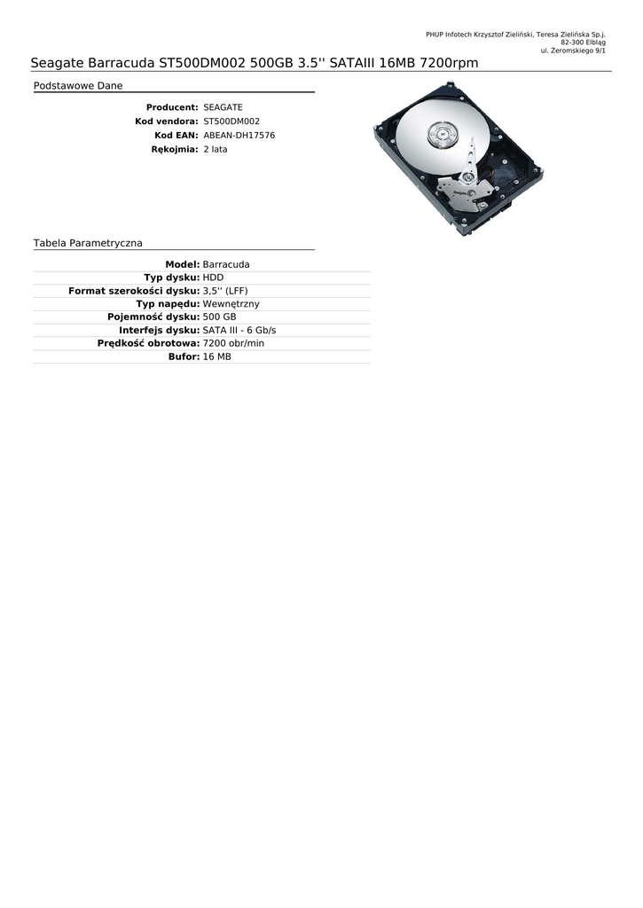 PHUP Infotech Krzysztof Zieliński, Teresa Zielińska Sp.j. 82-300 Elbląg ul. Żeromskiego 9/1 Seagate Barracuda ST500DM002 500GB 3.5'' SATAIII 16MB 7200rpm Podstawowe Dane Producent: SEAGATE Kod vendora: ST500DM002 Kod EAN: ABEAN-DH17576 Rękojmia: 2 lata Tabela Parametryczna Model: Barracuda Typ dysku: HDD Format szerokości dysku: 3,5'' (LFF) Typ napędu: Wewnętrzny Pojemność dysku: 500 GB Interfejs dysku: SATA III - 6 Gb/s Prędkość obrotowa: 7200 obr/min Bufor: 16 MB Powered by TCPDF (www.tcpdf.org)
