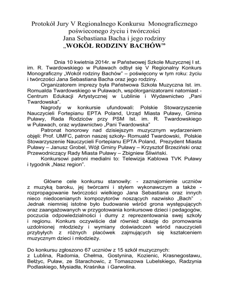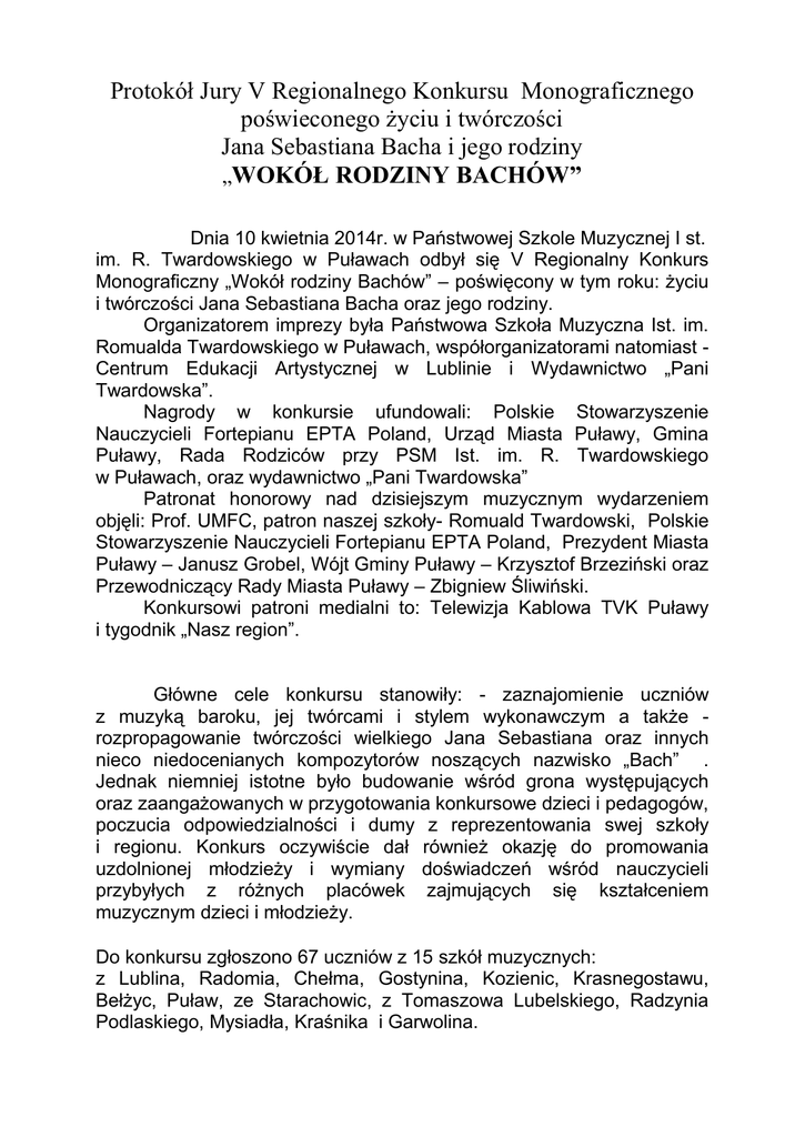 Protokół Jury V Regionalnego Konkursu Monograficznego poświeconego życiu i twórczości Jana Sebastiana Bacha i jego rodziny „WOKÓŁ RODZINY BACHÓW” Dnia 10 kwietnia 2014r. w Państwowej Szkole Muzycznej I st. im. R. Twardowskiego w Puławach odbył się V Regionalny Konkurs Monograficzny „Wokół rodziny Bachów” – poświęcony w tym roku: życiu i twórczości Jana Sebastiana Bacha oraz jego rodziny. Organizatorem imprezy była Państwowa Szkoła Muzyczna Ist. im. Romualda Twardowskiego w Puławach, współorganizatorami natomiast Centrum Edukacji Artystycznej w Lublinie i Wydawnictwo „Pani Twardowska”. Nagrody w konkursie ufundowali: Polskie Stowarzyszenie Nauczycieli Fortepianu EPTA Poland, Urząd Miasta Puławy, Gmina Puławy, Rada Rodziców przy PSM Ist. im. R. Twardowskiego w Puławach, oraz wydawnictwo „Pani Twardowska” Patronat honorowy nad dzisiejszym muzycznym wydarzeniem objęli: Prof. UMFC, patron naszej szkoły- Romuald Twardowski, Polskie Stowarzyszenie Nauczycieli Fortepianu EPTA Poland, Prezydent Miasta Puławy – Janusz Grobel, Wójt Gminy Puławy – Krzysztof Brzeziński oraz Przewodniczący Rady Miasta Puławy – Zbigniew Śliwiński. Konkursowi patroni medialni to: Telewizja Kablowa TVK Puławy i tygodnik „Nasz region”. Główne cele konkursu stanowiły: - zaznajomienie uczniów z muzyką baroku, jej twórcami i stylem wykonawczym a także rozpropagowanie twórczości wielkiego Jana Sebastiana oraz innych nieco niedocenianych kompozytorów noszących nazwisko „Bach” . Jednak niemniej istotne było budowanie wśród grona występujących oraz zaangażowanych w przygotowania konkursowe dzieci i pedagogów, poczucia odpowiedzialności i dumy z reprezentowania swej szkoły i regionu. Konkurs oczywiście dał również okazję do promowania uzdolnionej młodzieży i wymiany doświadczeń wśród nauczycieli przybyłych z różnych placówek zajmujących się kształceniem muzycznym dzieci i młodzieży. Do konkursu zgłoszono 67 uczniów z 15 szkół muzycznych: z Lublina, Radomia, Chełma, Gostynina, Kozienic, Krasnegostawu, Bełżyc, Puław, ze Starachowic, z Tomaszowa Lubelskiego, Radzynia Podlaskiego, Mysiadła, Kraśnika i Garwolina. Konkurs podzielony został na 2 kategorie: instrumentalną oraz teoretyczną. W kategorii instrumentalnej zostały wydzielone grupy: grupa I : soliści z klas I- III cyklu 6-letniego oraz I – II cyklu 4-letniego, grupa II : soliści z klas IV –VI cyklu 6-letniego oraz III –IV cyklu 4- letniego, grupa III – zespoły. Do oceny uczestników powołano 2 odrębne składy jury. W kategorii instrumentalnej, JURY w składzie: - przewodniczący: prof. Romuald Twardowski- kompozytor, patron PSM Ist. w Puławach, wykładowca UMFC w Warszawie; - dr Aleksandra Kowalik-Burdzy – adiunkt UMFC w Warszawie; - dr Ewelina Zawiślak – adiunkt AM w Łodzi, podczas przesłuchań otwartych, oceniało prezentacje 31 solistów oraz 2 zespołów instrumentalnych i postanowiło przyznać następujące nagrody: w grupie I przyznano: I miejsce: Sandra Wesołowska kl II cyklu 6 letniego (fortepian) ZSM im. Oskara Kolberga w Radomiu naucz. Tomasz Szczepanowski II miejsce: (ex aequo) Agata Rejczak kl.II cykl 6letni (fortepian) ZSM im. Oskara Kolberga w Radomiu naucz. Tomasz Szczepanowski Daria Bednarska kl.III cyklu 6 letniego (flet) PSM Ist. im. Romualda Twardowskiego w Puławach naucz. Maria Grabiec III miejsce: (ex aequo) Jan Rozmanowski kl. II cyklu 4 letniego (fortepian) SM Ist. w Garwolinie naucz. Beata Nowicka Maciej Wachowiec kl. III cyklu 6 letniego PSM Ist. Im. Romualda Twardowskiego w Puławach naucz. Elżbieta Sokół WYRÓŻNIENIA: Katarzyna Poździk kl. III cyklu 6 letniego (fortepian) SM Ist. w Kozienicach naucz. Karolina Garbalska Hanna Kopeć kl. II cyklu 6 letniego(fortepian) PSM Ist. Im. Romualda Twardowskiego w Puławach naucz. Elżbieta Sokół Kornelia Filip kl. III cyklu 6 letniego (fortepian) PSM Ist. Im. Romualda Twardowskiego w Puławach naucz. Rafał Maciąg Kinga Filip kl. II cyklu 4 letniego (fortepian) PSM Ist. Im. Romualda Twardowskiego w Puławach naucz. Magdalena Strońska Jakub Zaremba kl. II cyklu 4 letniego (fortepian) Miejska Szkoła Muzyczna Ist. w Gostyninie naucz. Piotr Wołowicz Mateusz Wachowiec kl. III cyklu 6 letniego (fortepian) PSM Ist. Im. Romualda Twardowskiego w Puławach naucz. Elżbieta Sokół w grupie II: I miejsca: nie przyznano II miejsce: (ex aequo) Krzysztof Goliszek z kl. IV cyklu 4 letniego (fortepian) SSM Ist. im. H. wieniawskiego w Bełżycach naucz. Zuzanna Boń Agata Krześniak z kl. IV cyklu 6 letniego (fortepian) SM Ist. w Kozienicach naucz. Teresa Makowiecka III miejsce: Tomasz Kotłowski z kl. Vi cykl 6 letni (fortepian) Społeczna SM Ist. im. Henryka wieniawskiego w Bełżycach naucz. Jerzy Boń WYRÓŻNIENIA: Sebastian Piędzia kl. IV cyklu 4 letniego (ksylofon) PSM I i IIst. im. I.J.Paderewskiego w Chełmie naucz. Piotr Wróblewski Julia Górecka kl. III cyklu 4 letniego (fortepian) PSM Ist. Im. Romualda Twardowskiego w Puławach naucz. Kamil Węgorek Mateusz Bąkała kl. III cyklu 4 letniego (fortepian) PSM Ist. Im. Romualda Twardowskiego w Puławach naucz. Magdalena Strońska w grupie III – zespołów instrumentalnych przyznano: I miejsca nie przyznano II miejsce: dla Duetu perkusyjnego „Kacper2” w składzie: Kacper Matejek kl. IV cyklu 6 letniego (ksylofon) Kacper Chmielewski kl. III cyklu 4 letniego (wibrafon) PSM Ist. Im. Romualda Twardowskiego w Puławach naucz. Piotr Wróblewski III miejsce: dla Duetu gitarowego w składzie: Daniel Banasiewicz kl. I cyklu 4 letniego Bartosz Rogoża kl. V cyklu 6 letniego PSM Ist. Im. Romualda Twardowskiego w Puławach naucz. Magdalena Błażejczyk ` Jury przyznało również „Dyplom Uznania” dla pana Piotra Wróblewskiego za twórcze opracowania utworów Jana Sebastiana Bacha Na V Regionalnym Konkursie Monograficznym „Wokół rodziny Bachów”, w kategorii teoretycznej, JURY w składzie: - przewodnicz