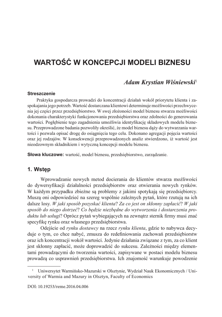WARTOŚĆ W KONCEPCJI MODELI BIZNESU Adam Krystian Wiśniewski1 Streszczenie Praktyka gospodarcza prowadzi do koncentracji działań wokół priorytetu klienta i zaspokajania jego potrzeb. Wartość dostarczana klientowi determinuje możliwości przechwycenia jej części przez przedsiębiorstwo. W swej złożoności model biznesu stwarza możliwości dokonania charakterystyki funkcjonowania przedsiębiorstwa oraz zdolności do generowania wartości. Pogłębienie tego zagadnienia umożliwia identyfikację składowych modelu biznesu. Przeprowadzone badania pozwoliły określić, że model biznesu dąży do wytwarzania wartości i pozwala opisać drogę do osiągnięcia tego celu. Dokonano agregacji pojęcia wartości oraz jej rodzajów. W konsekwencji przeprowadzonych analiz stwierdzono, iż wartość jest nieodzownym składnikiem i wytyczną koncepcji modelu biznesu. Słowa kluczowe: wartość, model biznesu, przedsiębiorstwo, zarządzanie. 1.Wstęp Wprowadzanie nowych metod docierania do klientów stwarza możliwości do dywersyfikacji działalności przedsiębiorstw oraz otwierania nowych rynków. W każdym przypadku zbieżne są problemy z jakimi spotykają się przedsiębiorcy. Muszą oni odpowiedzieć na szereg wspólnie zależnych pytań, które rzutują na ich dalsze losy. W jaki sposób pozyskać klienta? Za co jest on skłonny zapłacić? W jaki sposób do niego dotrzeć? Co będzie niezbędne do wytworzenia i dostarczenia produktu lub usługi? Oprócz pytań wybiegających na zewnątrz sternik firmy musi znać specyfikę rynku oraz własnego przedsiębiorstwa. Odejście od rynku dostawcy na rzecz rynku klienta, gdzie to nabywca decyduje o tym, co chce nabyć, zmusza do redefiniowania zachowań przedsiębiorstw oraz ich koncentracji wokół wartości. Jedynie działania związane z tym, za co klient jest skłonny zapłacić, może doprowadzić do sukcesu. Zależności między elementami prowadzącymi do tworzenia wartości, zapisywane w postaci modelu biznesu prowadzą co usprawnień przedsiębiorstwa. Ich znajomość warunkuje powodzenie Uniwersytet Warmińsko-Mazurski w Olsztynie, Wydział Nauk Ekonomicznych / University of Warmia and Mazury in Olsztyn, Faculty of Economics 1 DOI: 10.19253/reme.2016.04.006 78 Adam Krystian Wiśniewski i sukces. Organizacje podejmują często świadome decyzje ukierunkowane na stworzenie możliwie wielu, jak największych strumieni dostarczanej i przechwytywanej wartości. Problemy pojawiają się przy niewłaściwym dopasowaniu proponowanej wartości do oczekiwań klienta lub niedostatecznej wielkości przechwytywanej wartości, która warunkuje przetrwanie i rynkowy rozwój. Celem artykułu jest dokonanie analizy dotychczasowego dorobku naukowego z zakresu modeli biznesu oraz wyłonienie zbieżnych elementów je charakteryzujących. Przedstawiono także pojęcie wartości w koncepcji modelu biznesu oraz jego znaczenia dla przedsiębiorstwa i sposobów jej wyłaniania. 2.Model biznesu Koncepcja modelu biznesu zyskuje w ostatnich latach na znaczeniu zarówno w środowisku naukowym, jak i biznesowym. Praktycy stosują ją do próby usprawnienia działań swoich przedsiębiorstw. Rozbieżność oczekiwań z osiąganymi rezultatami ich stosowania powiązana jest z ugruntowaniem naukowym tego pojęcia. Pierwsze wzmianki teoretyków odnośnie modelu biznesu należy odnotować już w roku 1957. W artykule pod redakcją R. Bellmana (Bellman i in. 1957) omawiano konstrukcję gier biznesowych dla celów szkoleniowych. O modelu biznesu wspomniano jedynie raz, w odniesieniu do wyzwań i problemów jakie napotykają inżynierowie w funkcjonowaniu przedsiębiorstw. Już to odniesienie było związane z prezentacją rzeczywistości i jej symulacją w postaci modelu. Temat ten nie został jednak szerzej podjęty przez innych badaczy aż do lat dziewięćdziesiątych ubiegłego wieku. Wówczas nastąpił rozwój przedsiębiorstw koncentrujących swe działania za pomocą kanałów elektronicznych oraz z wykorzystaniem Internetu. Rozwój tego medium pozwolił wygenerować nowe rynki, otwierając szanse przed przedsiębiorcami do budowy innowacyjnych organizacji. Ich funkcjonowanie bazowało na wirtualnych nośnikach, programach i formularzach. Również w ten sposób podejmowano próby agregowania ich specyfiki. Analogicznie do stosowanej terminologii uznać można, iż były to działania prowadzące do wytwarzania modelu ich działalności. Zgodnie z definicją rozumiany on jest jako „odzwierciedlenie interesującego nas fragmentu rzeczywistości z pominięciem mniej istotnych elementów tej rzeczywistości” (Sadowski 1964). Stało się to „punktem zapalnym” do powstania idei modelu biznesu. Rozwój spółek giełdowych opierających swą działalność na platformie internetowej był katalizatorem stosowania modeli biznesu (business models). Mimo kryzysu spekulacyjnego z 2001 roku, koncepcja ta nie straciła na popularności a w ostatnich latach jest coraz chętniej stosowana i poddawana analizie. Zgodnie z panującymi poglądami badaczy model biznesu można rozpatrywać w trzech aspektach (Falencikowski 2012): semantycznym, konceptualnym i rodzajowym. Podejście semantyczne mówi, że modelem biznesu nazywany jest uproszczony układ prowadzenia pojedynczej działalności gospodarczej w celu osiągania zysku. Drugi skupia się wokół kierunków i priorytetów funkcjonowania przedsięPrzedsiębiorstwo we współczesnej gospodarce / Research on enterprise in modern economy 79 Wartość w koncepcji modeli biznesu biorstwa. W trzecim przypadku można przywołać klasyfikację Ch. Baden-Fullera i M.S. Morgana, którzy wymienili cztery rodzaje (Baden-Fuller, Morgan 2010): —— skali – w sposób dokładny odwzorowują przedstawiane obiekty. Działają analogicznie do pierwowzorów, lecz w pomniejszonej skali; —— roli – powielają rolę odgrywaną przez oryginał w biznesie. Uwypuklają sens i ideę funkcjonowania danego obiektu lub jego położ