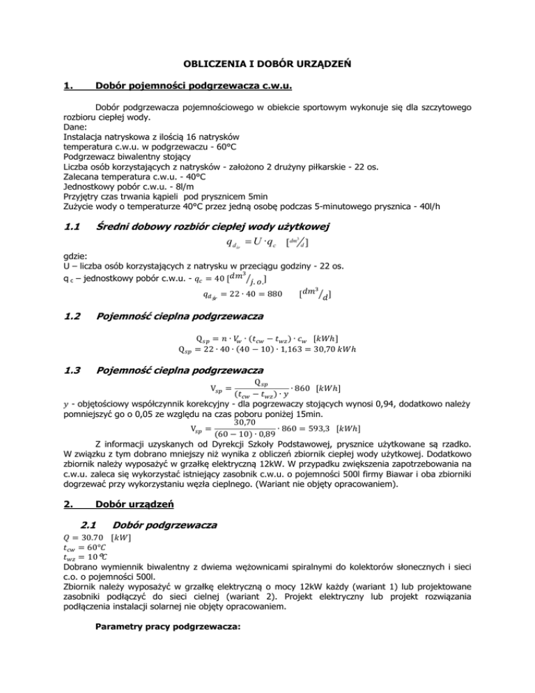 OBLICZENIA I DOBÓR URZĄDZEŃ 1. Dobór pojemności podgrzewacza c.w.u. Dobór podgrzewacza pojemnościowego w obiekcie sportowym wykonuje się dla szczytowego rozbioru ciepłej wody. Dane: Instalacja natryskowa z ilością 16 natrysków temperatura c.w.u. w podgrzewaczu - 60°C Podgrzewacz biwalentny stojący Liczba osób korzystających z natrysków - założono 2 drużyny piłkarskie - 22 os. Zalecana temperatura c.w.u. - 40°C Jednostkowy pobór c.w.u. - 8l/m Przyjętry czas trwania kąpieli pod prysznicem 5min Zużycie wody o temperaturze 40°C przez jedną osobę podczas 5-minutowego prysznica - 40l/h 1.1 Średni dobowy rozbiór ciepłej wody użytkowej q d śr = U · qc [dm d ] 3 gdzie: U – liczba osób korzystających z natrysku w przeciągu godziny - 22 os. = 40[ q c – jednostkowy pobór c.w.u. . .] ] = 22 ∙ 40 = 880 [ ś 1.2 Pojemność cieplna podgrzewacza Q Q = ∙ ∙( − ) ∙ [!"ℎ] = 22 ∙ 40 ∙ (40 − 10) ∙ 1,163 = 30,70!"ℎ 1.3 Pojemność cieplna podgrzewacza 2. Dobór urządzeń Q ∙ 860[!"ℎ] ( − )∙* * - objętościowy współczynnik korekcyjny - dla pogrzewaczy stojących wynosi 0,94, dodatkowo należy pomniejszyć go o 0,05 ze względu na czas poboru poniżej 15min. 30,70 V = ∙ 860 = 593,3[!"ℎ] (60 − 10) ∙ 0,89 Z informacji uzyskanych od Dyrekcji Szkoły Podstawowej, prysznice użytkowane są rzadko. W związku z tym dobrano mniejszy niż wynika z obliczeń zbiornik ciepłej wody użytkowej. Dodatkowo zbiornik należy wyposażyć w grzałkę elektryczną 12kW. W przypadku zwiększenia zapotrzebowania na c.w.u. zaleca się wykorzystać istniejący zasobnik c.w.u. o pojemności 500l firmy Biawar i oba zbiorniki dogrzewać przy wykorzystaniu węzła cieplnego. (Wariant nie objęty opracowaniem). V 2.1 = Dobór podgrzewacza - = 30.70[!"] = 60°/ = 10°/ Dobrano wymiennik biwalentny z dwiema wężownicami spiralnymi do kolektorów słonecznych i sieci c.o. o pojemności 500l. Zbiornik należy wyposażyć w grzałkę elektryczną o mocy 12kW każdy (wariant 1) lub projektowane zasobniki podłączyć do sieci cielnej (wariant 2). Projekt elektryczny lub projekt rozwiązania podłączenia instalacji solarnej nie objęty opracowaniem. Parametry pracy podgrzewacza: Ilość zbiorników: 1 szt. Pojemność nominalna: 500 l moc wymiennika solarnego (80/10/45°C): 64 kW moc wymiennika c.o.: 35,2 kW grzałka elektryczna: 12 kW wysokość z izolacją: 1890mm średnica: 700mm średnica z izolacją: 900mm (miękka pianka poliuretanowa 100mm – rozbieralna) Uwaga: Grzałkę elektryczną należy wmontować w otworze rewizyjnym na dole zbiornika, przygotowanym odpowiednio przez producenta zbiornika. 2.2 Dobór kolektorów na cele ciepłej wody użytkowej sali gimnastycznej dobrano 2 szt. kolektorów próżniowych o łącznej powierzchni 6m2. Typ: kolektor próżniowy Powierzchnia kolektora: 3,03m2 Ilość: 2 szt. Pojemność: 1,55 l Wymagany przepływ jednostkowy przez kolektor: 40 l/hm2 Wymagany przepływ przez pole: 240 l/h Opór jednostkowy kolektora: 50mbar 2.3 Przepływ w obiegu solarnym Powierzchnia kolektora: Ilość kolektorów: Przepływ jednostkowy: Przepływ całkowity: 2.4 4∙ [ ] 7∙8∙9 Średnica wewnętrzna rury: Przyjęta średnica rury: Rzeczywista prędkość przepływu: Opory: Długość rurociągu: Opory całkowite rurociągu: 2.5 012 ∙ 3012 ∙ 4012 [5 ℎ] 3,03m2 2 szt. 40 l/hm2 240 l/h Dobór średnicy rur Wymagany przepływ: Zalecana prędkość przepływu: =6 = 240 l/h 0,4-0,7 m/s 0,013032704 m Dn16 w=0,58 m/s R=0,35kPa/m L=60,0m Rc=21,0kPa = 210 mbar Określenie oporów w instalacji – dobór pompy solarnej Opór pola kolektorów: Opór wężownicy podgrzewacza: Opór rurociągów: Łączne opory instalacji: 100 mbar 15 mbar 210 mbar 325 mbar 3,25 mH2O Dobrano zestaw pompowy z pompa solarną Grundfos Solar 15-65 lub Wilo Stratos TEC ST 15/7 PWM, zaworem bezpieczeństwa (6 bar) armaturą odcinająca i kontrolną, separatorem powietrza oraz sterownikiem solarnym. 2.6 Dobór naczynia wzbiorczego do instalacji solarnej 2.7 Dobór zaworu bezpieczeństwa