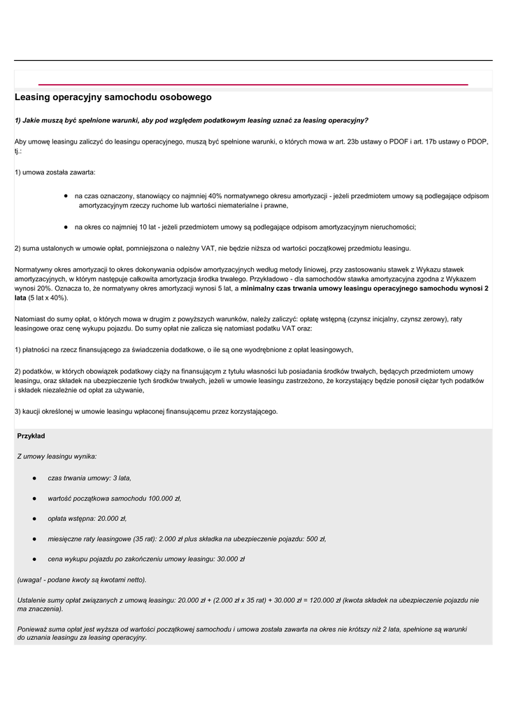 Leasing operacyjny samochodu osobowego 1) Jakie muszą być spełnione warunki, aby pod względem podatkowym leasing uznać za leasing operacyjny? Aby umowę leasingu zaliczyć do leasingu operacyjnego, muszą być spełnione warunki, o których mowa w art. 23b ustawy o PDOF i art. 17b ustawy o PDOP, tj.: 1) umowa została zawarta: na czas oznaczony, stanowiący co najmniej 40% normatywnego okresu amortyzacji - jeżeli przedmiotem umowy są podlegające odpisom amortyzacyjnym rzeczy ruchome lub wartości niematerialne i prawne, na okres co najmniej 10 lat - jeżeli przedmiotem umowy są podlegające odpisom amortyzacyjnym nieruchomości; 2) suma ustalonych w umowie opłat, pomniejszona o należny VAT, nie będzie niższa od wartości początkowej przedmiotu leasingu. Normatywny okres amortyzacji to okres dokonywania odpisów amortyzacyjnych według metody liniowej, przy zastosowaniu stawek z Wykazu stawek amortyzacyjnych, w którym następuje całkowita amortyzacja środka trwałego. Przykładowo - dla samochodów stawka amortyzacyjna zgodna z Wykazem wynosi 20%. Oznacza to, że normatywny okres amortyzacji wynosi 5 lat, a minimalny czas trwania umowy leasingu operacyjnego samochodu wynosi 2 lata (5 lat x 40%). Natomiast do sumy opłat, o których mowa w drugim z powyższych warunków, należy zaliczyć: opłatę wstępną (czynsz inicjalny, czynsz zerowy), raty leasingowe oraz cenę wykupu pojazdu. Do sumy opłat nie zalicza się natomiast podatku VAT oraz: 1) płatności na rzecz finansującego za świadczenia dodatkowe, o ile są one wyodrębnione z opłat leasingowych, 2) podatków, w których obowiązek podatkowy ciąży na finansującym z tytułu własności lub posiadania środków trwałych, będących przedmiotem umowy leasingu, oraz składek na ubezpieczenie tych środków trwałych, jeżeli w umowie leasingu zastrzeżono, że korzystający będzie ponosił ciężar tych podatków i składek niezależnie od opłat za używanie, 3) kaucji określonej w umowie leasingu wpłaconej finansującemu przez korzystającego. Przykład Z umowy leasingu wynika: czas trwania umowy: 3 lata, wartość początkowa samochodu 100.000 zł, opłata wstępna: 20.000 zł, miesięczne raty leasingowe (35 rat): 2.000 zł plus składka na ubezpieczenie pojazdu: 500 zł, cena wykupu pojazdu po zakończeniu umowy leasingu: 30.000 zł (uwaga! - podane kwoty są kwotami netto). Ustalenie sumy opłat związanych z umową leasingu: 20.000 zł + (2.000 zł x 35 rat) + 30.000 zł = 120.000 zł (kwota składek na ubezpieczenie pojazdu nie ma znaczenia). Ponieważ suma opłat jest wyższa od wartości początkowej samochodu i umowa została zawarta na okres nie krótszy niż 2 lata, spełnione są warunki do uznania leasingu za leasing operacyjny. 2) Użytkujemy samochód osobowy na podstawie umowy leasingu operacyjnego. Czy mamy obowiązek prowadzenia ewidencji przebiegu pojazdu? Czy jeżeli wartość leasingowanego pojazdu przekracza 20.000 euro, zaliczenie wydatków do kosztów podatkowych podlega ograniczeniu? Podatnik, który użytkuje samochód osobowy na podstawie umowy leasingu operacyjnego, nie ma obowiązku prowadzenia ewidencji przebiegu pojazdu. W tym bowiem przypadku pomimo, że samochód nie jest zaliczony przez korzystającego do środków trwałych, nie obowiązuje limit zaliczania do kosztów kwoty wynikającej z przemnożenia liczby faktycznie przejechanych kilometrów przez obowiązujące stawki za 1 kilometr przebiegu (art. 23 ust. 3b ustawy o PDOF i art. 16 ust. 3b ustawy o PDOP). Nie ma również znaczenia, że wartość pojazdu przekracza 20.000 euro. Ograniczenie to bowiem dotyczy podmiotu, który dokonuje amortyzacji, czyli firmy leasingowej. Podobne stanowisko prezentują również organy podatkowe, np Izba Skarbowa w Warszawie w interpretacji indywidualnej z 13 maja 2008 r., nr IPPB1/415230/08-2/JK czy Pierwszy Urząd Skarbowy w Białymstoku w postanowieniu z 17 lipca 2007 r., nr RO-XV/415/PDOF-318/235/PL/07. WAŻNE: Jeżeli na potrzeby działalności gospodarczej podatnik użytkuje samochód osobowy na podstawie umowy leasingu operacyjnego, do kosztów podatkowych może zaliczyć wszystkie wydatki związane z zawartą umową leasingową, tj. zarówno opłaty wstępne, raty leasingowe, jak też inne wydatki eksploatacyjne, np. na zakup paliwa, części zamiennych (z wyjątkami, o których mowa poniżej). Od powyższej zasady są jednak pewne wyjątki. Jeden z nich dotyczy zaliczania do kosztów podatkowych składek na ubezpieczenie pojazdu. W tym bowiem przypadku zastosowanie znajdzie art. 23 ust. 1 pkt 47 ustawy o PDOF i art. 16 ust. 1 pkt 49 ustawy o PDOP, z którego wynika, że nie uważa się za koszty uzyskania przychodów składek na ubezpieczenie samochodu osobowego w tej części, która dotyczy wartości samochodu powyżej kwoty 20.000 euro. Przy czym przeliczenia powyższego limitu na złote dokonuje się według kursu: sprzedaży walut obcych ogłaszanego przez NBP z dnia zawarcia umowy ubezpieczenia - jeżeli podatnik stosuje przepisy ustawy o PDOF, średniego NPB z dnia zawarcia umowy ubezpieczenia - jeżeli podatnik stosuje przepisy ustawy o PDOP. Przykład W działalności gospodarczej podatnik wykorzystuje samochód osobowy na podstawie umowy leasingu. Do celów ubezpieczenia wartość samochodu określono na kwotę 160.000 zł, a składka na ubezpieczenie wynosiła 6.000 zł. Równowartość 20.000 euro na dzień zawarcia umowy ubezpieczenia wynosiła 80.000 zł (zastosowano kurs przykładowy). Obliczenie kwoty składek na ubezpieczenie pojazdu, które podatnik zaliczy do kosztów podatkowych: (80.000 zł : 160.000 zł) x 100% = 50% 6.000 zł x 50% = 3.000 zł Pozostała kwota ubezpieczenia (6.000 zł - 3.000 zł = 3.000 zł) nie będzie mogła być zaliczona do kosztów uzyskania przychodów. Warto również dodać, że kosztem podatkowym nie są również wydatki na remonty powypadkowe samochodu w przypadku braku ubezpieczenia dobrowolnego. Jednak w przypadku leasing
