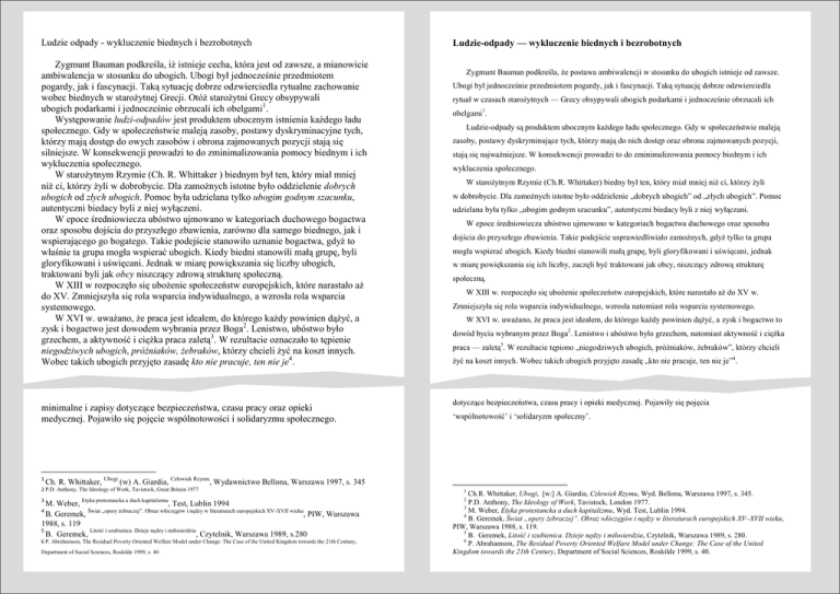 Zygmunt Bauman podkreśla, iż istnieje cecha, która jest od zawsze, a mianowicie ambiwalencja w stosunku do ubogich. Ubogi był jednocześnie przedmiotem pogardy, jak i fascynacji. Taką sytuację dobrze odzwierciedla rytualne zachowanie wobec biednych w starożytnej Grecji. Otóż starożytni Grecy obsypywali Ludzie odpady - wykluczenie biednych i bezrobotnych ubogich podarkami i jednocześnie obrzucali ich obelgami1. Występowanie ludzi-odpadów jest produktem ubocznym istnienia każdego ładu Zygmunt Bauman podkreśla, iż istnieje jest od zawsze, a mianowicie społecznego. Gdy w społeczeństwie maleją cecha, zasoby,która postawy dyskryminacyjne tych, ambiwalencja w stosunku do ubogich. byłzajmowanych jednocześnie pozycji przedmiotem którzy mają dostęp do owych zasobówUbogi i obrona stają się pogardy, fascynacji. Taką sytuację odzwierciedla rytualne silniejsze.jak W ikonsekwencji prowadzi to dobrze do zminimalizowania pomocy zachowanie biednym i ich wobec biednych w starożytnej Grecji. Otóż starożytni Grecy obsypywali wykluczenia społecznego. 1 ubogich podarkami Rzymie i jednocześnie obelgamibył . ten, który miał mniej W starożytnym (Ch. R.obrzucali Whittakerich ) biednym jestzamożnych produktemistotne ubocznym każdego ładu niż Występowanie ci, którzy żyli wludzi-odpadów dobrobycie. Dla było istnienia oddzielenie dobrych społecznego. Gdy w społeczeństwie maleją zasoby, postawy dyskryminacyjne tych, ubogich od złych ubogich. Pomoc była udzielana tylko ubogim godnym szacunku, którzy mają biedacy dostęp do owych i obrona zajmowanych pozycji stają się autentyczni byli z niejzasobów wyłączeni. silniejsze. Wśredniowiecza konsekwencji prowadzi to do zminimalizowania biednym i ich W epoce ubóstwo ujmowano w kategoriach pomocy duchowego bogactwa wykluczenia oraz sposobu społecznego. dojścia do przyszłego zbawienia, zarówno dla samego biednego, jak i W starożytnym Rzymie (Ch. Whittakerstanowiło ) biednym był ten,bogactwa, który miał mniej wspierającego go bogatego. TakieR.podejście uznanie gdyż to niż ci, którzy żylimogła w dobrobycie. zamożnych było oddzielenie dobrych właśnie ta grupa wspierać Dla ubogich. Kiedy istotne biedni stanowili małą grupę, byli ubogich od złych ubogich. Pomoc udzielana tylko ubogim godnym szacunku, gloryfikowani i uświęcani. Jednak była w miarę powiększania się liczby ubogich, autentyczni biedacy byli niszczący z niej wyłączeni. traktowani byli jak obcy zdrową strukturę społeczną. W epoce w kategoriach duchowego bogactwa XIII wśredniowiecza rozpoczęło sięubóstwo ubożenieujmowano społeczeństw europejskich, które narastało aż orazXV. sposobu dojścia się do rola przyszłego zbawienia, zarównoadla samego do Zmniejszyła wsparcia indywidualnego, wzrosła rolabiednego, wsparciajak i wspierającego go bogatego. Takie podejście stanowiło uznanie bogactwa, gdyż to systemowego. właśnie ta grupa mogła wspierać Kiedy stanowili małą grupę, bylia W XVI w. uważano, że praca ubogich. jest ideałem, dobiedni którego każdy powinien dążyć, 2 gloryfikowani i uświęcani. Jednak w miarę powiększania się liczby ubogich, zysk i bogactwo jest dowodem wybrania przez Boga . Lenistwo, ubóstwo było 3 traktowani abyli jak obcyi niszczący zdrową społeczną. grzechem, aktywność ciężka praca zaletąstrukturę . W rezultacie oznaczało to tępienie W XIII w rozpoczęło się ubożenie społeczeństw które narastało niegodziwych ubogich, próżniaków, żebraków, którzyeuropejskich, chcieli żyć na koszt innych.aż do XV. takich Zmniejszyła sięprzyjęto rola wsparcia a wzrosła Wobec ubogich zasadęindywidualnego, kto nie pracuje, ten nie je4.rola wsparcia systemowego. W początkowym etapie kapitalizmu (XVIII i XIX w.) biednych zaczęto W XVIjako w. uważano, żerobotników. praca jest ideałem, do do którego każdy dążyć, a traktować przyszłych Robotnik połowy XIXpowinien był jednocześnie 2 zysk i bogactwo dowodem wybrania stanowili przez Boga . Lenistwo, ubóstwo było biedny i ubogi. Wjest tym okresie robotnicy największą grupę pośród 3 grzechem,5. aDopiero aktywność i ciężka zaletą . W rezultacie to tępienie biednych w 1795 r., wpraca czasach ogromnej inflacji,oznaczało ustanowiono system niegodziwych ubogich, próżniaków, żebraków, którzy Speenhamland, chcieli żyć na koszt innych. pomocy dla rodzin biednych pracujących tzw. system nazwany tak 4 Wobec takich ubogich przyjęto zasadę kto nie pracuje, ten nie je . od hrabstwa, w którym po raz pierwszy wprowadzono pomoc dla pracujących 6 W początkowym etapie kapitalizmu (XVIII i XIX w.) biednych zaczęto robotników . traktować jakoiprzyszłych Robotnik do połowy XIX był jednocześnie Wiek XIX XX to wiekrobotników. nasilonej działalności związków zawodowych. Ich biedny i ubogi. W tym okresie robotnicy stanowili największą grupępłace pośród działania sprawiły, iż w wielu krajach zagwarantowano robotnikom 5 biednych w 1795 r.,bezpieczeństwa, w czasach ogromnej ustanowiono minimalne. iDopiero zapisy dotyczące czasuinflacji, pracy oraz opieki system pomocy dla Pojawiło rodzin biednych pracujących tzw. system Speenhamland, nazwany tak medycznej. się pojęcie wspólnotowości i solidaryzmu społecznego. od hrabstwa, w którym po raz pierwszy wprowadzono pomoc dla pracujących robotników6. Wiek XIX i XX to wiek nasilonej działalności związków zawodowych. Ich działania sprawiły, iż w wielu krajach zagwarantowano robotnikom płace minimalne i zapisy dotyczące bezpieczeństwa, czasu pracy oraz opieki 1 Ubogi Człowiek Rzymu Ch. R. Whittaker, Giardia,wspólnotowości , Wydawnictwo Bellona,społecznego. Warszawa 1997, s. 345 medycznej. Pojawiło(w) sięA.pojęcie i solidaryzmu 2 P.D. Anthony, The Ideology of Work, Tavistock, Great Britain 1977 3 Etyka protestancka a duch kapitalizmu M. Weber, , Test, Lublin 1994 4 Świat „opery żebraczej”. Obraz włóczęgó