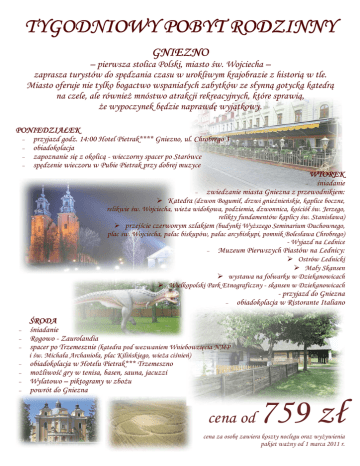 TYGODNIOWY POBYT RODZINNY GNIEZNO – pierwsza stolica Polski, miasto św. Wojciecha – zaprasza turystów do spędzania czasu w urokliwym krajobrazie z historią w tle. Miasto oferuje nie tylko bogactwo wspaniałych zabytków ze słynną gotycką katedrą na czele, ale równieŜ mnóstwo atrakcji rekreacyjnych, które sprawią, Ŝe wypoczynek będzie naprawdę wyjątkowy. PONIEDZIAŁEK − − − − przyjazd godz. 14:00 Hotel Pietrak**** Gniezno, ul. Chrobrego 3 obiadokolacja zapoznanie się z okolicą - wieczorny spacer po Starówce spędzenie wieczoru w Pubie Pietrak przy dobrej muzyce WTOREK śniadanie zwiedzanie miasta Gniezna z przewodnikiem: − − Katedra (dzwon Bogumił, drzwi gnieźnieńskie, kaplice boczne, relikwie św. Wojciecha, wieŜa widokowa, podziemia, dzwonnica, kościół św. Jerzego, relikty fundamentów kaplicy św. Stanisława) przejście czerwonym szlakiem (budynki WyŜszego Seminarium Duchownego, plac św. Wojciecha, pałac biskupów, pałac arcybiskupi, pomnik Bolesława Chrobrego) - Wyjazd na Lednice − Muzeum Pierwszych Piastów na Lednicy: Ostrów Lednicki Mały Skansen wystawa na folwarku w Dziekanowicach Wielkopolski Park Etnograficzny - skansen w Dziekanowicach − - przyjazd do Gniezna obiadokolacja w Ristorante Italiano ŚRODA − − − śniadanie Rogowo - Zaurolandia spacer po Trzemesznie (katedra pod wezwaniem Wniebowzięcia NMP i św. Michała Archanioła, plac Kilińskiego, wieŜa ciśnień) − − − − obiadokolacja w Hotelu Pietrak*** Trzemeszno moŜliwość gry w tenisa, basen, sauna, jacuzzi Wylatowo – piktogramy w zboŜu powrót do Gniezna cena od 759 zł cena za osobę zawiera koszty noclegu oraz wyŜywienia pakiet waŜny od 1 marca 2011 r. CZWARTEK − − śniadanie wyjazd do Poznania – zwiedzanie miasta: − − Poznańska Bazylika Archikatedralna Muzeum Archeologiczne Ratuszowe Koziołki Recitale na cennych XIX-wiecznych organach Muzeum Motoryzacji Nowe ZOO, Palmiarnia powrót do Gniezna obiadokolacja PIĄTEK śniadanie wyjazd do Wągrowca – zwiedzanie miasta: − − późnogotycki Kościół Farny z dzwonnicą barokowy klasztor i kościół pocysterski piramida Łakońskiego – grobowiec rotmistrza wojsk napoleońskich Franciszka Łakińskiego w kształcie piramidy skrzyŜowanie rzek Nielby i Wełny - unikalne zjawisko hydrograficzne skorzystanie z zaprzyjaźnionego − ośrodka sportowo-rekreacyjnego - Aquapark obiadokolacja w hotelu Pietrak**** Wągrowiec − powrót do Gniezna SOBOTA − − śniadanie Wenecja / Biskupin: − − − ruiny zamku Mikołaja Nałęcza (Diabła Weneckiego) Muzeum Kolei Wąskotorowej Przejazd kolejką do Biskupina Muzeum Archeologiczne w Biskupinie powrót do Gniezna obiadokolacja wieczorny czas spędzony w ogródkach na deptaku przed hotelem NIEDZIELA − − śniadanie po wymeldowaniu z hotelu (do godz. 1200) proponujemy − wyjazd do Czerniejewa (zwiedzanie pałacu, spacer po parku, przejaŜdŜka bryczką) lub − spacer po Gnieźnie (Dolina Pojednania, Kościół i Klasztor o.o. Franciszkanów, Rynek, kościół Farny Trójcy Świętej, mury miejskie, ul. Tumska z kamienicami)