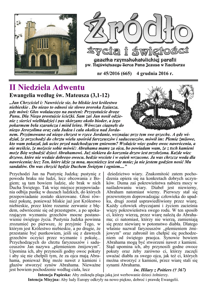 gazetka rzymskokatolickiej parafii pw. Najświętszego Serca Pana Jezusa w Raciborzu nr 45/2016 (665) 4 grudnia 2016 r. II Niedziela Adwentu Ewangelia według św. Mateusza (3,1-12) „Jan Chrzciciel i: Nawróćcie się, bo bliskie jest królestwo niebieskie . Do niego to odnosi się słowo proroka Izajasza, gdy mówi: Głos wołającego na pustyni: Przygotujcie drogę Panu, Dla Niego prostujcie ścieŜki. Sam zaś Jan nosił odzienie z sierści wielbłądziej i pas skórzany około bioder, a jego pokarmem była szarańcza i miód leśny. Wówczas ciągnęły do niego Jerozolima oraz cała Judea i cała okolica nad Jordanem. Przyjmowano od niego chrzest w rzece Jordanie, wyznając przy tym swe grzechy. A gdy widział, Ŝe przychodzi do chrztu wielu spośród faryzeuszów i saduceuszów, mówił im: Plemię Ŝmijowe, kto wam pokazał, jak uciec przed nadchodzącym gniewem? Wydajcie więc godny owoc nawrócenia, a nie myślcie, Ŝe moŜecie sobie mówić: Abrahama mamy za ojca, bo powiadam wam, Ŝe z tych kamieni moŜe Bóg wzbudzić dzieci Abrahamowi. JuŜ siekiera do korzenia drzew jest przyłoŜona. KaŜde więc drzewo, które nie wydaje dobrego owocu, będzie wycięte i w ogień wrzucone. Ja was chrzczę wodą dla nawrócenia; lecz Ten, który idzie za mną, mocniejszy jest ode mnie; ja nie jestem godzien nosić Mu sandałów. On was chrzcić będzie Duchem Świętym i ogniem....” Przychodzi Jan na Pustynię Judzką: pustynię z powodu braku nie ludzi, lecz obcowania z Bogiem; są tam bowiem ludzie, ale brak w nich Ducha Świętego. Tak więc miejsce przepowiadania odbija pustkę w duszach ludzkich, do których przepowiadanie zostało skierowane. Głosi równieŜ pokutę, poniewaŜ bliskie juŜ jest Królestwo niebieskie, przez które rozumie zerwanie z błędem, odwrócenie się od przestępstw, a po upokarzającym wyznaniu grzechów mocne postanowienie świętego Ŝycia. Pustynia Judzka powinna zrozumieć po pierwsze, Ŝe przyjmie Tego, w którym jest Królestwo niebieskie, a po drugie, Ŝe przestanie być pustkowiem, jeśli się z dawnych grzechów oczyści przez wyznanie i pokutę... Przychodzących do chrztu faryzeuszów i saduceuszów Jan nazywa „plemieniem Ŝmijowym”. Upomina ich, aby przynosili godny owoc pokuty i aby się nie chełpili tym, Ŝe za ojca mają Abrahama, poniewaŜ Bóg moŜe nawet z kamieni i głazów stworzyć synów Abrahama. NiewaŜne jest bowiem pochodzenie według ciała, lecz dziedzictwo wiary. Znakomitość zatem pochodzenia opiera się na konkretach dobrych uczynków. Duma zaś pokrewieństwa nabiera mocy w naśladowaniu wiary. Diabeł jest niewierny, Abraham natomiast wierny. Pierwszy stał się przewrotnym doprowadzając człowieka do upadku, drugi został usprawiedliwiony przez wiarę. KaŜdy człowiek obyczajami i Ŝyciem zacieśnia więzy pokrewieństwa swego rodu. W ten sposób ci, którzy wierzą, przez wiarę naleŜą do Abrahama; ci natomiast, którzy nie wierzą, zamieniają się przez niewiarę w potomstwo diabła. Dlatego właśnie nazwał faryzeuszów „plemieniem Ŝmijowym” oraz zabronił im chełpić się pochodzeniem od świętego praojca. Synowie bowiem Abrahama mogą być stworzeni nawet z kamieni. Stąd upomina ich, aby przynosili godne owoce pokuty oraz Ŝeby zarówno ci, którzy zaczęli uwaŜać diabła za swego ojca, jak teŜ ci, których moŜna stworzyć z kamieni, przez wiarę stali się synami Abrahama. św. Hilary z Poitiers († 367) Intencja Papieska: Aby zniknęła plaga jaką jest werbowanie dzieci Ŝołnierzy. Intencja Misyjna: Aby ludy Europy odkryły na nowo piękno, dobroć i prawdę Ewangelii. 2 Źródło - gazetka Poniedziałek – 5 grudnia 2016 Łk 5,17-26 630 W dniu urodzin męŜa Józefa o zdrowie i BoŜe błogosławieństwo 900 Do Miłosierdzia BoŜego za † Marię Paskuda w rocznicę urodzin 1730 Roraty dla dzieci 1. Za †† Marię Zuber, Piotra Zuber oraz †† pokrewieństwo Zuber i Matuszek 2. Za † mamę Emilię Wieczorek w 12. rocznicę śmierci Wtorek – 6 grudnia 2016 Mt 18,12-14 630 Do Miłosierdzia BoŜego za † męŜa i ojca Eugeniusza, † syna Jana oraz †† rodziców i rodzeństwo z obu stron 800 W j. niemieckim: Do BoŜego Miłosierdzia za † matkę Monikę Mroźla w 3. rocznicę śmierci 1730 Roraty dla dzieci 1. Za † mamę Marię śukowską w 35. rocznicę śmierci, za †† męŜa Stefana Nowakowskiego, brata Romualda, Józefa śukowskiego, Gertrudę i Józefa Nowakowskich, szwagra Jana Majer i dusze w czyśćcu cierpiące 2. W intencji córek Barbary i GraŜyny z podziękowaniem za otrzymane łaski, z prośbą o zdrowie i BoŜe błogosławieństwo dla całej rodziny 3. Za † Henryka Marczak (od współlokatorów z ulicy Katowickiej 1) Środa – 7 grudnia 2016 – św. AmbroŜego, biskupa i doktora Kościoła Mt 11,28-30 630 Za †† rodziców 900 Za †† rodziców Johannę i Atanazego Bugla i syna Fridolina 1730 Roraty dla dzieci 1. Z okazji 50. rocznicy urodzin Krystyny Cyfka z podziękowaniem za otrzymane łaski, z prośbą o BoŜe błogosławieństwo dla całej rodziny oraz o Ŝycie wieczne dla †† z rodziny 2. Za † Piotra Szumacher w 1. rocznicę śmierci i †† z pokrewieństwa z obu stron Czwartek – 8 grudnia 2016 – Niepokalane Poczęcie NMP Łk 1,26-38 630 Za †† Helenę i Tadeusza Michalik, Jadwigę i Tomasza Leśniak i dusze w czyśćcu cierpiące 1630 Szkolna (Roraty): Za † męŜa Franciszka w 11. rocznicę śmierci, †† rodziców z obu stron, siostrę Wandę, bratową Danielę i dusze w czyśćcu cierpiące 1800 1. W intencji Dzieci Maryi oraz Rycerstwa Niepokalanej (od Rycerstwa Niepokalanej) 2. Do Miłosierdzia BoŜego za † męŜa Romana Zdrzałek i †† rodziców z obu stron Piątek – 9 grudnia 2016 Mt 11,16-19 630 Za † Stanisławę Starościak w 3. rocznicę śmierci 900 Do Miłosierdzia BoŜego za †† rodziców Genowefę i Filipa, siostrę Pelagię, braci Jana i Zdzisława, pokrewieństwo z obu stron oraz dusze w czyśćcu 