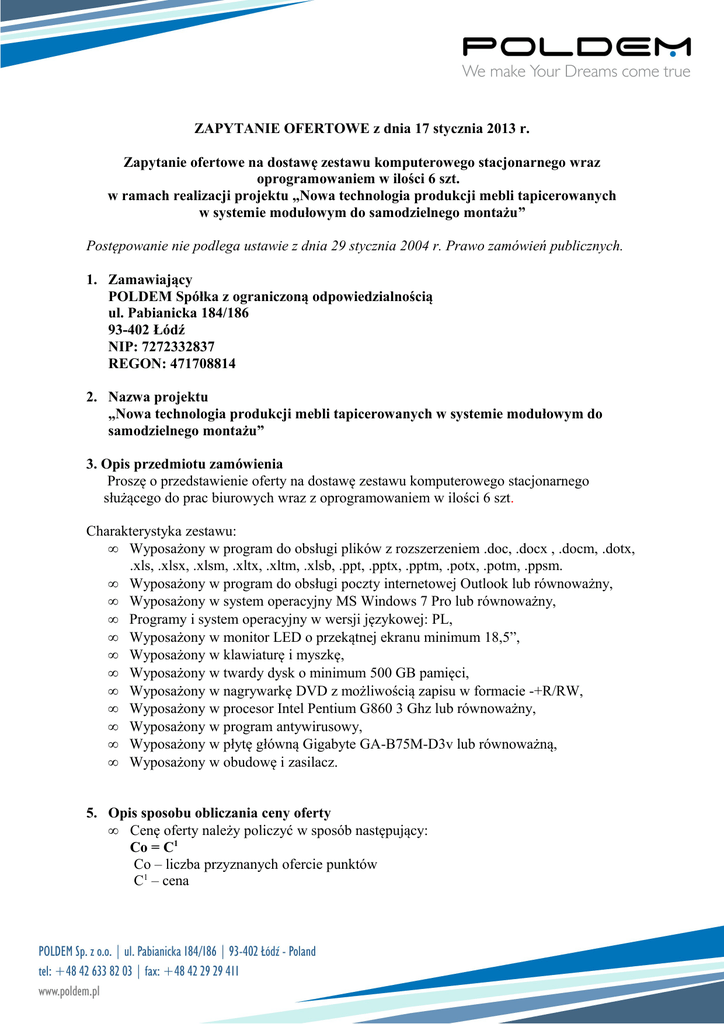 ZAPYTANIE OFERTOWE z dnia 17 stycznia 2013 r. Zapytanie ofertowe na dostawę zestawu komputerowego stacjonarnego wraz oprogramowaniem w ilości 6 szt. w ramach realizacji projektu „Nowa technologia produkcji mebli tapicerowanych w systemie modułowym do samodzielnego montażu” Postępowanie nie podlega ustawie z dnia 29 stycznia 2004 r. Prawo zamówień publicznych. 1. Zamawiający POLDEM Spółka z ograniczoną odpowiedzialnością ul. Pabianicka 184/186 93-402 Łódź NIP: 7272332837 REGON: 471708814 2. Nazwa projektu „Nowa technologia produkcji mebli tapicerowanych w systemie modułowym do samodzielnego montażu” 3. Opis przedmiotu zamówienia Proszę o przedstawienie oferty na dostawę zestawu komputerowego stacjonarnego służącego do prac biurowych wraz z oprogramowaniem w ilości 6 szt. Charakterystyka zestawu: • Wyposażony w program do obsługi plików z rozszerzeniem .doc, .docx , .docm, .dotx, .xls, .xlsx, .xlsm, .xltx, .xltm, .xlsb, .ppt, .pptx, .pptm, .potx, .potm, .ppsm. • Wyposażony w program do obsługi poczty internetowej Outlook lub równoważny, • Wyposażony w system operacyjny MS Windows 7 Pro lub równoważny, • Programy i system operacyjny w wersji językowej: PL, • Wyposażony w monitor LED o przekątnej ekranu minimum 18,5”, • Wyposażony w klawiaturę i myszkę, • Wyposażony w twardy dysk o minimum 500 GB pamięci, • Wyposażony w nagrywarkę DVD z możliwością zapisu w formacie -+R/RW, • Wyposażony w procesor Intel Pentium G860 3 Ghz lub równoważny, • Wyposażony w program antywirusowy, • Wyposażony w płytę główną Gigabyte GA-B75M-D3v lub równoważną, • Wyposażony w obudowę i zasilacz. 5. Opis sposobu obliczania ceny oferty • Cenę oferty należy policzyć w sposób następujący: Co = C1 Co – liczba przyznanych ofercie punktów C1 – cena - Oferta musi zawierać ostateczną, sumaryczną cenę obejmującą wszystkie koszty (także koszty dostawy i inne) z uwzględnieniem wszystkich opłat i podatków (także podatku od towarów i usług) oraz ewentualnych upustów i rabatów. - Cena musi być podana w złotych polskich. - Jeżeli w ofercie zostanie podana cena w innej walucie niż PLN, to zostanie ona przeliczona po średnim kursie NBP danej waluty na dzień wpłynięcia oferty. - Jeżeli złożono ofertę, której wybór prowadziłby do powstania obowiązku podatkowego zamawiającego zgodnie z przepisami o podatku od towarów i usług w zakresie dotyczącym wewnątrzwspólnotowego nabycia towarów, zamawiający w celu oceny takiej oferty dolicza do przedstawionej w niej ceny podatek od towarów i usług, który miałby obowiązek wpłacić zgodnie z obowiązującymi przepisami. 6. Opis kryteriów, którymi zamawiający będzie kierował się przy wyborze najkorzystniejszej oferty wraz z podaniem znaczenia tych kryteriów i sposobu oceny ofert Opis kryteriów wraz z podaniem znaczenia Zamawiający wyznaczył następujące kryteria i ich znaczenie: a. w przypadku kryterium cena oferty 100% Sposób oceny ofert Kryterium: cena ofertowa brutto (określona do dwóch miejsc po przecinku) zostanie ocenione przy zastosowaniu następującego wzoru: najniższa cena C1 = ---------------------------- x 100% oferowana cena 7. Termin wykonania zamówienia Zamówienie ma zostać zrealizowane do dnia 28 luty 2013r. 8. Miejsce i termin składania ofert Ofertę należy przesłać do firmy POLDEM Spółka z ograniczoną odpowiedzialnością, ul. Pabianicka 184/186, 93-402 Łódź w terminie do dnia: 28 stycznia 2013 r.