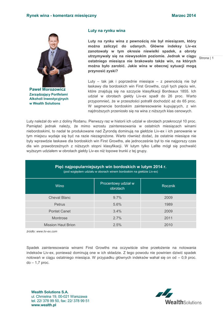 Rynek wina - komentarz miesięczny Marzec 2014 Luty na rynku wina Luty na rynku wina z pewnością nie był miesiącem, który można zaliczyć do udanych. Główne indeksy Liv-ex zanotowały w tym okresie niewielki spadek, a obroty utrzymywały się na niewysokim poziomie. Jednak w ciągu Strona | 1 ostatniego miesiąca nie brakowało także win, na których można było zarobić. Jakie wina w obecnej sytuacji mogą przynosić zyski? Paweł Morozowicz Zarządzający Portfelami Alkoholi Inwestycyjnych w Wealth Solutions Luty – tak jak i poprzednie miesiące – z pewnością nie był łaskawy dla bordoskich win First Growths, czyli tych pięciu win, które znajdują się na szczycie klasyfikacji Bordeaux 1855. Ich udział w obrotach giełdy Liv-ex spadł do 26 proc. Warto przypomnieć, że w przeszłości potrafił dochodzić aż do 65 proc. W segmencie bordoskim zainteresowanie kupujących, z win najdroższych przeniosło się na wina z niższych klas cenowych. Luty należał do win z doliny Rodanu. Pierwszy raz w historii ich udział w obrotach przekroczył 10 proc. Pamiętać jednak należy, że mimo wzrostu zainteresowania w ostatnich miesiącach winami niebordoskimi, to nadal te produkowane nad Żyrondą dominują na giełdzie Liv-ex i ich panowanie w tym miejscu wydaje się być na razie niezagrożone. Warto również dodać, że ostatnie miesiące nie były wprawdzie łaskawe dla bordoskich win First Growths, ale jednocześnie był to nie najgorszy czas dla win prawobrzeżnych z niższych stopni klasyfikacji. W lutym tylko Lafite mógł się pochwalić wyższym udziałem w obrotach giełdy Liv-ex niż topowe trunki z tej grupy. Pięć najpopularniejszych win bordoskich w lutym 2014 r. (pod względem udziału w oborach winem bordoskim na giełdzie Liv-ex) Wino Procentowy udział w obrotach Rocznik Cheval Blanc 9.7% 2009 Petrus 5.6% 1989 Pontet Canet 3.4% 2009 Montrose 2.7% 2011 Mission Haut Brion 2.5% 2010 źródło: www.liv-ex.com Spadek zainteresowania winami First Growths ma oczywiście silne przełożenie na notowania indeksów Liv-ex, ponieważ dominują one w ich składzie. Z tego powodu nie powinien dziwić spadek notowań w ciągu ostatniego miesiąca. W przypadku głównych indeksów wahał się on od – 0,9 proc. do – 1,7 proc. Wealth Solutions S.A. ul. Chmielna 19, 00-021 Warszawa tel. 22/ 378 99 50, fax: 22/ 378 99 51 www.wealth.pl Rynek wina - komentarz miesięczny Marzec 2014 Zmiany wartości indeksów Liv-ex w ciągu ostatniego miesiąca (stan na 28.02.2014 r.) Nazwa indeksu Zmiana miesięczna Liv-ex Fine Wine 50 -1,7% Liv-ex Fine Wine 100 -0,9% Liv-ex Bordeaux 500 -1,7% Liv-ex Fine Wine Investables -1,4% Strona | 2 źródło: www.liv-ex.com Obserwowane w ostatnich miesiącach tendencje są również widoczne w zestawieniu najszybciej drożejących win. Znajdują się na nim jeden Szampan, dwa wina z prawego brzegu Żyrondy, jedno wino z doliny Rodanu oraz jedno z Kalifornii. Pięć najszybciej drożejących win w lutym 2014 r. Wino Rocznik Średnia cena w lutym 2014 r. (GBP)* Wzrost ceny Krug, Brut 1989 3 174 10,8% Evangile 1998 1 653 10,2% Guigal, Cote Rotie La Turque 2000 1 745 6,7% Vieux Chateau Certan 2010 2 325 5,7% Opus One 2009 1 880 5,5% źródło: www.liv-ex.com *za 12-butelkową skrzynkę En primeur Obecna sytuacja na rynku jest również rezultatem zbliżającej się kampanii en primeur bordoskiego rocznika 2013. Z pewnością będzie to jedna z ciekawych kampanii ostatnich lat, w związku z tym nie można się dziwić atmosferze nerwowego wyczekiwania, jaka obecnie panuje na rynku. Rok 2013 z pewnością nie był szczególnie łaskawy dla producentów wina. Trudne warunki pogodowe jakie panowały w tym czasie, z pewnością nie ułatwiały im pracy. Wprawdzie na beczkowe oceny zeszłorocznego rocznika musimy jeszcze poczekać (np. Robert Parker przedstawi je dopiero w czerwcu), ale już obecnie możemy powiedzieć, że będzie to rocznik „winiarzy”. Charakteryzować się będzie małą ilością wina oraz zróżnicowaną jakością, która zależna będzie od umiejętności pracowników każdego chateau. Ogólna jakość tego rocznika nie będzie mogła się równać z wybitymi rocznikami 2009 oraz 2010, ale nie oznacza to, że nie będzie można w nim znaleźć win znakomitych. Obecnie trwa w związku z tym wyczekiwanie zarówno na ogłoszenie not, jak również cen bordoskiego rocznika 2013. Wskaźniki rynkowe świadczą o tym, że to właśnie trudne dla winiarzy roczniki, wychodzące w formie przedpremierowej w następnych latach drożały najszybciej. Wealth Solutions S.A. ul. Chmielna 19, 00-021 Warszawa tel. 22/ 378 99 50, fax: 22/ 378 99 51 www.wealth.pl Rynek wina - komentarz miesięczny Marzec 2014 Wino miesiąca Chateau Montrose Historia chateau sięga drugiej połowy XVIII w. Wtedy to Nicolas de Ségur dzięki swemu małżeństwu stał się właścicielem Château de Calon. Warto dodać, że był on synem Aleksandra, zwanego księciem winorośli, który w spadku przekazał Strona | 3 Nicolasowi takie posiadłości jak Latour, Lafite i Mouton. Nicolas, który posiadał już tak uznane winnice, zdecydował się na sprzedaż Colon. Dzięki tej transakcji powstało właśnie Chateau Montrose. W 1778 r. Theodore Dumoulin – nowy właściciel posiadłości – odkrył, że część nieużytków należących do Calon, pokrytych jest różowymi, polnymi kwiatami. Działka ta posiadała także sprzyjające dla uprawy winorośli położenie względem słońca. W związku z tym spostrzegawczy pan Dumoulin postanowił obsadzić ten teren winnymi krzewami i wybudować w tym miejscu nowe chateau. Tak właśnie powstało Montrose, które na stałe wpisało się w kanon win regionu Bordeaux. W 1824 r. Dumoulin zdecydował się na sprzedaż Calon, z wyjątkiem założonego przez siebie Montrose. Te pozostało w rękach jego rodziny. Trzydzieści lat później posiadłość i jej pierwsze wino zostały sklasyfikowane jako 2eme Grand Cru Classe – cz