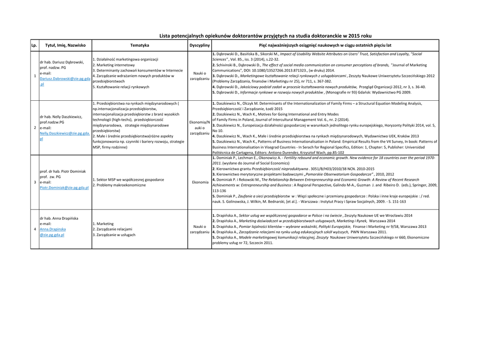 lista potencjalnych opiekunów słuchaczy studiów doktoranckich
