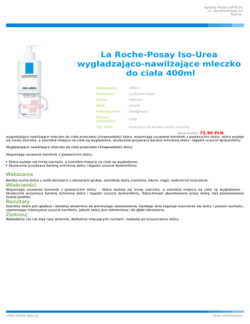 Apteka Polska APTE.PL ul. Derdowskiego 21 Rumia La Roche-Posay Iso-Urea wygładzająco-nawilżające mleczko do ciała 400ml Opakowanie: 400ml Producent: La Roche-Posay Postać: mleczko Wiek: dorośli Przeznaczenie: pielęgnacja Miejsce stosowania: ciało Typ skóry: łuszcząca się,bardzo sucha,szorstka Cena brutto: 75,90 PLN wygładzające nawilżające mleczko do ciała przeciwko chropowatości skóry, wspomaga usuwanie komórek z powierzchni skóry, skóra wydaje się mniej ziarnista, a szorstkie miejsca na ciele są wygładzone, skutecznie przywraca barierę ochronną skóry i łagodzi uczucie dyskomfortu Wygładzające nawilżające mleczko do ciała przeciwko chropowatości skóry Wspomaga usuwanie komórek z powierzchni skóry: Skóra wydaje się mniej ziarnista, a szorstkie miejsca na ciele są wygładzone, Skutecznie przywraca barierę ochronną skóry i łagodzi uczucie dyskomfortu. Wskazania Bardzo sucha skóra u osób dorosłych z obszarami grubej, szorstkiej skóry (ramiona, łokcie, nogi), nadmierne łuszczenie. Właściwości Wspomaga usuwanie komórek z powierzchni skóry: - Skóra wydaje się mniej ziarnista, a szorstkie miejsca na ciele są wygładzone, Skutecznie przywraca barierę ochronną skóry i łagodzi uczucie dyskomfortu. Natychmiast absorbowane przez skórę, bez pozostawiania tłustej powłoki. Rezultaty Szorstka skóra jest gładsza i bardziej aksamitna od pierwszego zastosowania. Każdego dnia reguluje łuszczenie się skóry i poziom suchości, zapewniając intensywne uczucie komfortu. Jakość skóry jest odmieniona i do głębi odnowiona. Zastosuj Nakładamy raz lub dwa razy dziennie, delikatnie masującymi ruchami, najlepiej po oczyszczeniu skóry. http://www.apte.pl sklep internetowy