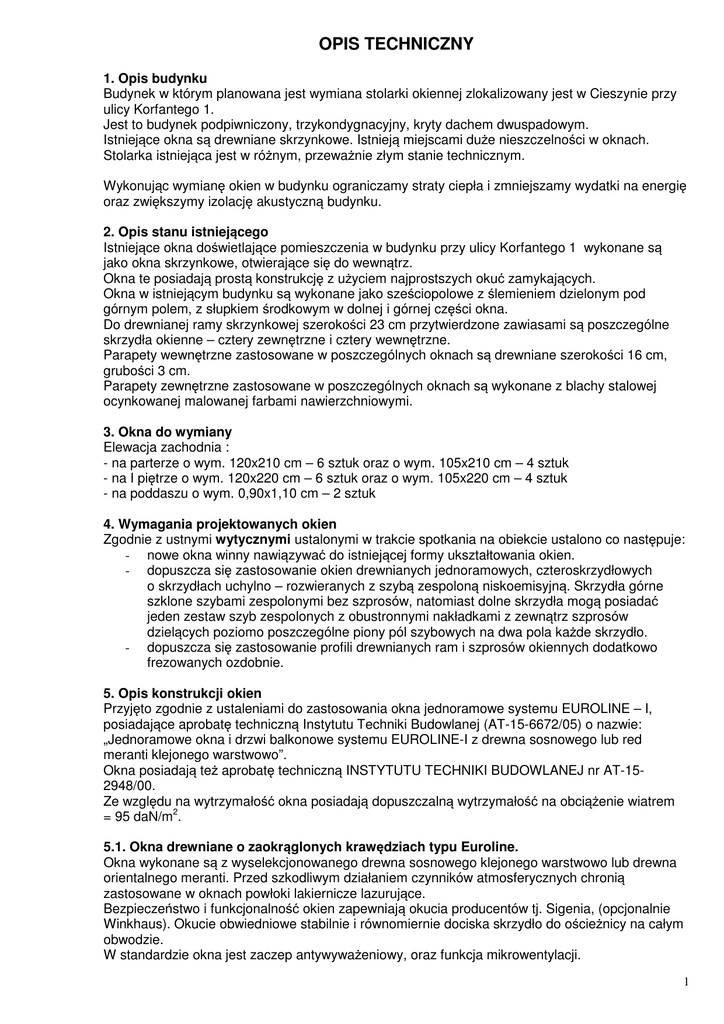 OPIS TECHNICZNY 1. Opis budynku Budynek w którym planowana jest wymiana stolarki okiennej zlokalizowany jest w Cieszynie przy ulicy Korfantego 1. Jest to budynek podpiwniczony, trzykondygnacyjny, kryty dachem dwuspadowym. Istniejące okna są drewniane skrzynkowe. Istnieją miejscami duże nieszczelności w oknach. Stolarka istniejąca jest w różnym, przeważnie złym stanie technicznym. Wykonując wymianę okien w budynku ograniczamy straty ciepła i zmniejszamy wydatki na energię oraz zwiększymy izolację akustyczną budynku. 2. Opis stanu istniejącego Istniejące okna doświetlające pomieszczenia w budynku przy ulicy Korfantego 1 wykonane są jako okna skrzynkowe, otwierające się do wewnątrz. Okna te posiadają prostą konstrukcję z użyciem najprostszych okuć zamykających. Okna w istniejącym budynku są wykonane jako sześciopolowe z ślemieniem dzielonym pod górnym polem, z słupkiem środkowym w dolnej i górnej części okna. Do drewnianej ramy skrzynkowej szerokości 23 cm przytwierdzone zawiasami są poszczególne skrzydła okienne – cztery zewnętrzne i cztery wewnętrzne. Parapety wewnętrzne zastosowane w poszczególnych oknach są drewniane szerokości 16 cm, grubości 3 cm. Parapety zewnętrzne zastosowane w poszczególnych oknach są wykonane z blachy stalowej ocynkowanej malowanej farbami nawierzchniowymi. 3. Okna do wymiany Elewacja zachodnia : - na parterze o wym. 120x210 cm – 6 sztuk oraz o wym. 105x210 cm – 4 sztuk - na I piętrze o wym. 120x220 cm – 6 sztuk oraz o wym. 105x220 cm – 4 sztuk - na poddaszu o wym. 0,90x1,10 cm – 2 sztuk 4. Wymagania projektowanych okien Zgodnie z ustnymi wytycznymi ustalonymi w trakcie spotkania na obiekcie ustalono co następuje: - nowe okna winny nawiązywać do istniejącej formy ukształtowania okien. - dopuszcza się zastosowanie okien drewnianych jednoramowych, czteroskrzydłowych o skrzydłach uchylno – rozwieranych z szybą zespoloną niskoemisyjną. Skrzydła górne szklone szybami zespolonymi bez szprosów, natomiast dolne skrzydła mogą posiadać jeden zestaw szyb zespolonych z obustronnymi nakładkami z zewnątrz szprosów dzielących poziomo poszczególne piony pól szybowych na dwa pola każde skrzydło. - dopuszcza się zastosowanie profili drewnianych ram i szprosów okiennych dodatkowo frezowanych ozdobnie. 5. Opis konstrukcji okien Przyjęto zgodnie z ustaleniami do zastosowania okna jednoramowe systemu EUROLINE – I, posiadające aprobatę techniczną Instytutu Techniki Budowlanej (AT-15-6672/05) o nazwie: „Jednoramowe okna i drzwi balkonowe systemu EUROLINE-I z drewna sosnowego lub red meranti klejonego warstwowo”. Okna posiadają też aprobatę techniczną INSTYTUTU TECHNIKI BUDOWLANEJ nr AT-152948/00. Ze względu na wytrzymałość okna posiadają dopuszczalną wytrzymałość na obciążenie wiatrem = 95 daN/m2. 5.1. Okna drewniane o zaokrąglonych krawędziach typu Euroline. Okna wykonane są z wyselekcjonowanego drewna sosnowego klejonego warstwowo lub drewna orientalnego meranti. Przed szkodliwym działaniem czynników atmosferycznych chronią zastosowane w oknach powłoki lakiernicze lazurujące. Bezpieczeństwo i funkcjonalność okien zapewniają okucia producentów tj. Sigenia, (opcjonalnie Winkhaus). Okucie obwiedniowe stabilnie i równomiernie dociska skrzydło do ościeżnicy na całym obwodzie. W standardzie okna jest zaczep antywyważeniowy, oraz funkcja mikrowentylacji. 1 Okna wyposażone są w termookapnik aluminiowy z wkładką termoizolacyjną oraz okapnik przyszybowy. Wysokie właściwości termoizolacyjne okna są zapewnione poprzez zastosowanie zestawów szybowych o współczynniku K=1,0 oraz listwy przyszybowej fajkowej. Parapety okienne wewnętrzne wykonane są z klejonych elementów drewna sosnowego lub meranti. Grubość parapetów wynosi 30 mm, a głębokość wg dołączonych rysunków. 6. Opis projektowanych okien i robót Projektuje się okna drewniane jednoramowe, czteroskrzydłowe, ze słupkiem środkowym, otwierane do środka. - Dolne skrzydło posiadać będzie drewniane szprosy poziome dzielące obustronnie szybę zespoloną każdego skrzydła na dwa pola. - Szyba montowana w każdym skrzydle okiennym w całości - bez podziałów wewnętrznych. Podziały te imitować będą nakładane obustronnie szprosy okienne. - Zastosować okucia obwiedniowe: uchylno – rozwierane - Parapety zewnętrzne z blachy stalowej ocynkowanej malowanej w kolorze zgodnym z kolorystyką istniejących obróbek blacharskich. - Parapety wewnętrzne: drewniane z drewna klejonego z powłoką lakierniczą szerokości 31 cm i grubości 3 cm. - Stolarka okienna w kolorze – mahoń lub w nawiązaniu do wymienionej wcześniej stolarki. 7. Czynności związanych z wymianą stolarki okiennej: - wykonanie zabezpieczeń przed rozpoczęciem robót budowlanych związanych z zachowaniem czystości pomieszczeń – zabezpieczenie podłóg. - demontaż sukcesywny istniejącej stolarki okiennej z zachowaniem zasad bezpieczeństwa osób postronnych przebywających na zewnętrz budynku (właściwe odgrodzenie i oznakowanie ostrzegawcze placu budowy) - zamocowanie haków montażowych, osadzenie i wypoziomowanie ramy okiennej, - wypełnienie pianką uszczelniającą szczeliny, - obróbka tzw. szpalet wokół okiennych z zamontowaniem parapetów: zewnętrznego z blachy stalowej ocynkowanej malowanej, dostosowanej kolorystycznie do koloru istniejących obróbek blacharskich, - montaż parapetu wewnętrznego, drewnianego. - malowanie szpalet zewnętrznych w kolorach nawiązujących do brudnej obecnie kolorystyki elewacji, - malowanie szpalet wewnętrznych w kolorach nawiązujących do kolorystyki danego pomieszczenia, malowanie z uprzednim przygotowaniem podłoża. 8. Wyszczególnienie prac towarzyszących Przed przystąpieniem prac należy wykonać harmonogram robót w związku z wykonaniem robót. Przed przystąpieniem do robót podstawowych należy wykonać następujące roboty towarzyszące i 