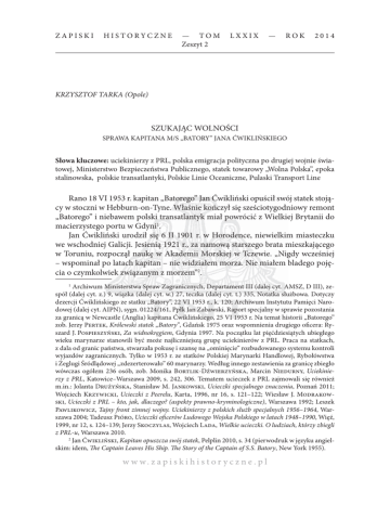 ZAPISKI HISTORYCZNE — TOM Zeszyt 2 LXXIX — ROK 2014 KRZYSZTOF TARKA (Opole) SZUKAJĄC WOLNOŚCI SPRAWA KAPITANA M/S „BATORY” JANA ĆWIKLIŃSKIEGO Słowa kluczowe: uciekinierzy z PRL, polska emigracja polityczna po drugiej wojnie światowej, Ministerstwo Bezpieczeństwa Publicznego, statek towarowy „Wolna Polska”, epoka stalinowska, polskie transatlantyki, Polskie Linie Oceaniczne, Pulaski Transport Line Rano 18 VI 1953 r. kapitan „Batorego” Jan Ćwikliński opuścił swój statek stojący w stoczni w Hebburn-on-Tyne. Właśnie kończył się sześciotygodniowy remont „Batorego” i niebawem polski transatlantyk miał powrócić z Wielkiej Brytanii do macierzystego portu w Gdyni1. Jan Ćwikliński urodził się 6 II 1901 r. w Horodence, niewielkim miasteczku we wschodniej Galicji. Jesienią 1921 r., za namową starszego brata mieszkającego w Toruniu, rozpoczął naukę w Akademii Morskiej w Tczewie. „Nigdy wcześniej – wspominał po latach kapitan – nie widziałem morza. Nie miałem bladego pojęcia o czymkolwiek związanym z morzem”2. 1 Archiwum Ministerstwa Spraw Zagranicznych, Departament III (dalej cyt. AMSZ, D III), zespół (dalej cyt. z.) 9, wiązka (dalej cyt. w.) 27, teczka (dalej cyt. t.) 335, Notatka służbowa. Dotyczy dezercji Ćwiklińskiego ze statku „Batory”, 22 VI 1953 r., k. 120; Archiwum Instytutu Pamięci Narodowej (dalej cyt. AIPN), sygn. 01224/161, Ppłk Jan Zabawski, Raport specjalny w sprawie pozostania za granicą w Newcastle (Anglia) kapitana Ćwiklińskiego, 25 VI 1953 r. Na temat historii „Batorego” zob. Jerzy Pertek, Królewski statek „Batory”, Gdańsk 1975 oraz wspomnienia drugiego oficera: Ryszard J. Pospieszyski, Za widnokręgiem, Gdynia 1997. Na początku lat pięćdziesiątych ubiegłego wieku marynarze stanowili być może najliczniejszą grupę uciekinierów z PRL. Praca na statkach, z dala od granic państwa, stwarzała pokusę i szansę na „ominięcie” rozbudowanego systemu kontroli wyjazdów zagranicznych. Tylko w 1953 r. ze statków Polskiej Marynarki Handlowej, Rybołówstwa i Żeglugi Śródlądowej „zdezerterowało” 60 marynarzy. Według innego zestawienia za granicę zbiegło wówczas ogółem 236 osób, zob. Monika Bortlik-Dwierzyska, Marcin Niedurny, Uciekinierzy z PRL, Katowice–Warszawa 2009, s. 242, 306. Tematem ucieczek z PRL zajmowali się również m.in.: Jolanta Druyska, Stanisław M. Jankowski, Ucieczki specjalnego znaczenia, Poznań 2011; Wojciech Krzywicki, Ucieczki z Peerelu, Karta, 1996, nr 16, s. 121–122; Wiesław J. Modrakowski, Ucieczki z PRL – kto, jak, dlaczego? (aspekty prawno-kryminologiczne), Warszawa 1992; Leszek Pawlikowicz, Tajny front zimnej wojny. Uciekinierzy z polskich służb specjalnych 1956–1964, Warszawa 2004; Tadeusz Pióro, Ucieczki oficerów Ludowego Wojska Polskiego w latach 1948–1990, Więź, 1999, nr 12, s. 124–139; Jerzy Skoczylas, Wojciech Lada, Wielkie ucieczki. O ludziach, którzy zbiegli z PRL-u, Warszawa 2010. 2 Jan Ćwikliski, Kapitan opuszcza swój statek, Pelplin 2010, s. 34 (pierwodruk w języku angielskim: idem, The Captain Leaves His Ship. The Story of the Captain of S.S. Batory, New York 1955). w w w. z a p i s k i h i s t o r y c z n e . p l 98 K r z y s z t o f Ta r k a [258] Nauka w akademii trwała trzy lata. W 1926 r. młody porucznik żeglugi został oficerem na statku towarowym „Wilno”. W następnych latach pływał na kilku różnych jednostkach jako trzeci, drugi i pierwszy oficer. W 1934 r., w wieku 33 lat, awansował na stopień kapitana i objął dowództwo na parowcu „Puck”. W końcu lat trzydziestych pływał na statkach towarowych „Lwów”, a później „Warszawa”. Tuż przed wybuchem drugiej wojny światowej kapitan Ćwikliński wypłynął w kolejny rejs do Londynu i Hawru. Podczas pierwszej wojennej zimy „Warszawa” krążyła między Pireusem a Marsylią, przewożąc tysiące uchodźców, którzy przez Rumunię wydostali się z okupowanej Polski. Na początku maja 1940 r. J. Ćwikliński został wysłany do Rotterdamu, gdzie miał odebrać budowany przez Holendrów statek pasażerski „Warszawa II”. Nie spodziewał się, że w Holandii, którą kilka dni później zaatakowały Niemcy, spędzi pięć długich lat. Po zakończeniu wojny J. Ćwikliński wyjechał do Londynu, gdzie znalazł zatrudnienie w Polsko-Brytyjskich Liniach Żeglugowych. Został kapitanem na frachtowcu „Białystok”, a w kwietniu 1946 r. objął ster na „Batorym”. Ten zbudowany w 1935 r. statek pasażerski przed drugą wojną obsługiwał linię transatlantycką z Gdyni do Nowego Jorku. Na pokład mógł zabrać ponad 800 pasażerów. Podczas wojny „Batory” wykorzystywany był przez Brytyjczyków do transportu żołnierzy. Po remoncie w Antwerpii statek ponownie został przystosowany do przewozów transatlantyckich. W kwietniu 1947 r. „Batory” pod polską banderą wyruszył w pierwszy rejs do Nowego Jorku. W drodze powrotnej statek przybył do Gdyni. Również kapitan J. Ćwikliński, po blisko ośmiu latach tułaczki, wrócił do kraju3. Razem z żoną i dziećmi ponownie zamieszkał w Gdyni. Odwiedzał dawnych przyjaciół. Niebawem wyruszył też w kolejny rejs przez Atlantyk. Po pierwszej wizycie w ojczyźnie z zadowoleniem odnotował, że rządy komunistyczne wywarły tylko „niewielki” wpływ na sytuację w Polsce. Sam, do czasu, nie odczuwał również presji ze strony komunistycznych władz. Kilka lat później wspominał: „Wyobrażałem sobie, że w Gdyni poddany będę indoktrynacji, zmuszony do wstąpienia do partii [komunistycznej – K.T.] i tym podobne. Nic takiego jednak się nie stało, nikt nie próbował nawet na mnie wpływać”4. Każdego miesiąca „Batory” wyruszał w nowy rejs. Kapitan pochłonięty pracą i dumny ze „swojego” statku nie miał wiele czasu na przemyślenia i obserwowanie zmian zachodzących w Polsce. Z czasem J. Ćwikliński coraz bardziej odczuwał jednak, że b