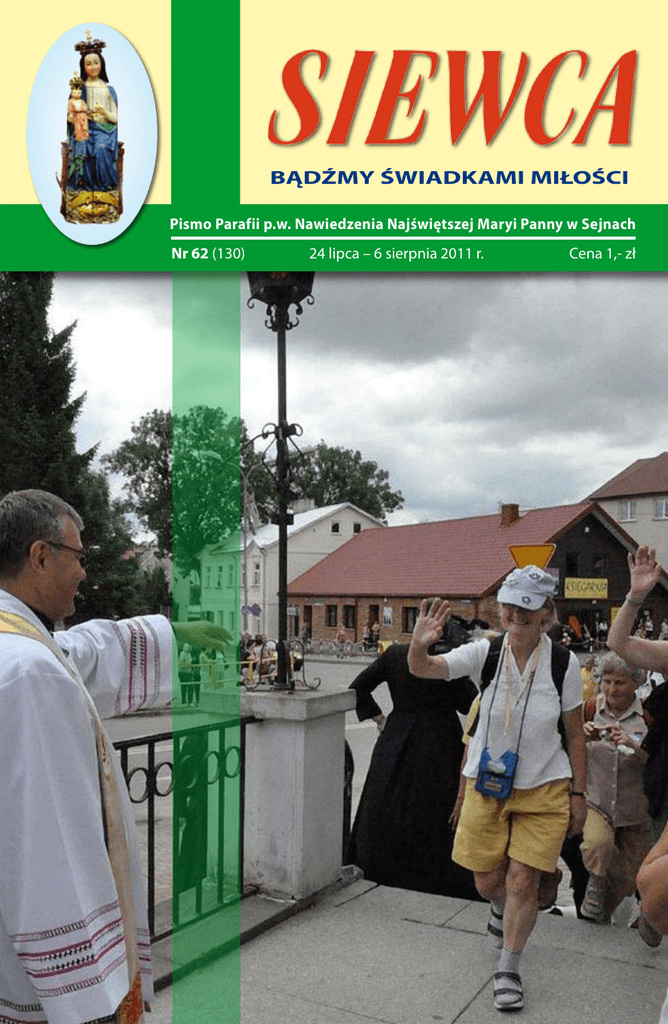 BĄDŹMY ŚWIADKAMI MIŁOŚCI Pismo Parafii p.w. Nawiedzenia Najświętszej Maryi Panny w Sejnach Nr 62 (130) 24 lipca – 6 sierpnia 2011 r. Cena 1,- zł MOC SŁOWA Niedziela XVII Zwykła W Ciągu Roku – 24 lipca 2011 Mt 13,44-52 J ezus opowiedział tłumom taką przypowieść: „Królestwo niebieskie podobne jest do skarbu ukrytego w roli. Znalazł go pewien człowiek i ukrył ponownie. Uradowany poszedł, sprzedał wszystko, co miał, i kupił tę rolę. Dalej, podobne jest królestwo niebieskie do kupca, poszukującego pięknych pereł. Gdy znalazł jedną drogocenną perłę, poszedł, sprzedał wszystko, co miał, i kupił ją”. „Dalej, podobne jest królestwo niebieskie do sieci, zarzuconej w morze i zagarniającej ryby wszelkiego rodzaju. Gdy się napełniła, wyciągnęli ją na brzeg i usiadłszy, dobre zebrali w naczynia, a złe odrzucili. Tak będzie przy końcu świata: wyjdą aniołowie, wyłączą złych spośród sprawiedliwych i wrzucą w piec rozpalony; tam będzie płacz i zgrzytanie zębów. Zrozumieliście to wszystko?” Odpowiedzieli Mu: „Tak jest”. A On rzekł do nich: „Dlatego każdy uczony w Piśmie, który stal się uczniem królestwa niebieskiego, podobny jest do ojca rodziny, który ze swego skarbca wydobywa rzeczy nowe i stare”. Refleksja niedzielna: Tematem dzisiejszego fragmentu Ewangelii jest królestwo niebieskie. Jakże często Jezus wykorzystuje krótkie historie, przypowieści i porównania, by pomóc swym słuchaczom pojąć, o co tak naprawdę chodzi, gdy mówi się o królestwie niebieskim. Ma się wrażenie, że nawet dla Jezusa zadanie przybliżenia słuchaczom rzeczywistości królestwa niebieskiego nie było łatwe. Gdyby było inaczej, nie musiałby tłumaczyć im, czym jest królestwo niebieskie, tak często i jakby wciąż od nowa, i za pomocą tak wielu słów i obrazów. Przypowieść z dzisiejszej Ewangelii opowiada o szukaniu i znajdowaniu, i o szczęściu znalezienia czegoś tak drogocennego, że wszystko inne wydaje się relatywnie mało warte – czymś, z czego można bez żalu zrezygnować, by zdobyć to, co najcenniejsze, i by tego nie utracić. Dzisiejsza Ewangelia mówi też o rozróżnianiu – najpierw „tylko” o odróżnianiu ryb, ale zaraz także o odróżnianiu ludzi, l w tym przypadku chodzi o królestwo niebieskie – o nic więcej, ale też o nic mniej, l dlatego słowa Jezusa stają się tak radykalne, gdy wyjaśnia, że chodzi o odróżnianie dobrych i złych ryb, złych i sprawiedliwych ludzi, tego, co sprzyja życiu, i tego, co je tłamsi. l wreszcie pyta: „Zrozumieliście to wszystko?” Czy i my możemy odpowiedzieć Mu: „Tak jest!” Jeśli tak, to owo rozróżnienie muszę też zastosować do samego siebie – do wszystkiego, co jest we mnie i wokół mnie, i przeze mnie. Gdyby choć przez najbliższy tydzień udało mi się poćwiczyć w rozróżnianiu tego, co dobre a co złe, to być może dałbym szansę, by we mnie i w otaczającym mnie świecie było trochę więcej tego, co sprzyja prawdziwemu życiu. Niedziela XVIII Zwykła W Ciągu Roku – 31 lipca 2011 Mt 14,13–21 G dy Jezus usłyszał o śmierci Jana Chrzciciela, oddalił się stamtąd w łodzi na miejsce pustynne, osobno. Lecz tłumy zwiedziały się o tym i z miast poszły za Nim pieszo. Gdy wysiadł, ujrzał wielki tłum. Zlitował się nad nimi i uzdrowił ich chorych. A gdy nastał wieczór, przystąpili do Niego uczniowie i rzekli: „Miejsce tu jest puste i pora już spóźniona. Każ więc rozejść się tłumom: niech idą do wsi i zakupią sobie żywności”. Lecz Jezus im odpowiedział: „Nie potrzebują odchodzić; wy dajcie im jeść”. Odpowiedzieli Mu: „Nie mamy tu nic prócz pięciu chlebów i dwóch ryb”. On rzekł: „Przynieście mi je tutaj”. Kazał tłumom usiąść na trawie, następnie wziął te pięć chlebów i dwie ryby, spojrzał w niebo, odmówił błogosławieństwo i połamawszy chleby, dał je uczniom, uczniowie zaś tłumom. Jedli wszyscy do sytości i zebrano z tego, co pozostało, dwanaście pełnych koszy ułomków. Tych zaś, którzy jedli, było około pięciu tysięcy mężczyzn, nie licząc kobiet i dzieci. Refleksja niedzielna: Cud, o którym dowiadujemy się z dzisiejszej Ewangelii, streszcza się w trzech słowach: cudowne rozmnożenie chleba. Nie zaznacza się w nich, jak wielki był to cud. O ile w ogóle można porównywać cuda pod względem ich wielkości? Jak cud, to cud. W każdym razie wielkość tego cudu polega między innymi na tym, że po nakarmieniu pięcioma chlebami i dwiema rybami pięciu tysięcy głodnych ludzi pozostało więcej, niż było na początku – dwanaście koszów ułomków. Jak wielu głodnych mogłoby się jeszcze najeść do syta tym, co pozostało?! Gdyby ktoś chciał zająć się pytaniem, jak Jezus tego dokonał, że kilkoma chlebami i rybami nakarmił rzesze głodnych słuchaczy, to śmiało można powieSIEWCA KALENDARZ LITURGICZNY Modlitwa Matki Teresy z Kalkuty Życie jest błogosławieństwem - przyjmij je Życie jest szansą - korzystaj z niej Życie jest pięknem - podziwiaj je Życie jest laurem - osiągnij je Życie jest szczęściem - skosztuj go Życie jest snem - uczyń z niego rzeczywistość Życie jest wyzwaniem - sprostaj mu Życie jest walką - podejmij ją Życie jest przygodą - ośmiel się na nią Życie jest zadaniem - wypełnij je Życie jest grą - zabaw się nią Życie jest drogocenne - strzeż go Życie jest miłością - ciesz się nią Życie jest smutkiem - pokonaj go Życie jest hymnem - śpiewaj go Życie jest tajemnicą - przeniknij ją Życie jest obietnicą - wypełnij ją Życie jest bogactwem -zachowaj je Życie jest życiem - obroń je. dzieć, że niezależnie, jak długo by dociekał przyczyn, nigdy nie dojdzie do zadowalającej odpowiedzi, chyba że w wierze uzna w Jezusie Boga. Sensowniej jest postawić pytanie: Dlaczego Jezus uczynił ten cud? Nasuwa się właściwie tylko jeden powód: chciał do s
