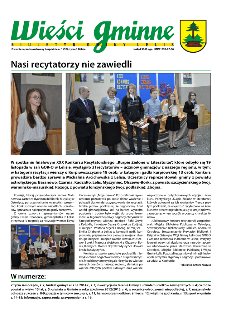 Dwumiesięcznik rozdawany bezpłatnie nr 1 (52) styczeń 2014 r. nakład 3000 egz. ISNN 1895-07-60 Nasi recytatorzy nie zawiedli 1 W spotkaniu finałowym XXX Konkursu Recytatorskiego ,,Kurpie Zielone w Literaturze’’, które odbyło się 19 listopada w sali GOK-O w Lelisie, wystąpiło 31recytatorów – uczniów gimnazjów z naszego regionu, w tym: w kategorii recytacji wierszy o Kurpiowszczyźnie 18 osób, w kategorii gadki kurpiowskiej 13 osób. Konkurs prowadziła bardzo sprawnie Michalina Arcichowska z Lelisa. Uczestnicy reprezentowali gminy z powiatu ostrołęckiego: Baranowo, Czarnia, Kadzidło, Lelis, Myszyniec, Olszewo-Borki, z powiatu szczycieńskiego (woj. warmińsko-mazurskie): Rozogi, z powiatu łomżyńskiego (woj. podlaskie): Zbójna. Komisja, której przewodniczyła Sabina Malinowska, zastępca dyrektora Biblioteki Miejskiej w Ostrołęce, po przesłuchaniu wszystkich prezentacji konkursowych oceniła wszystkich uczestników i przyznała najlepszym nagrody rzeczowe. Z grona czworga reprezentantów naszej gminy Emilia Chaberek, gimnazjalistka z Lelisa otrzymała IV nagrodę za recytację wiersza Edyty Kaczmarczyk ,,Moja ziemia’’. Pozostali nasi reprezentanci pozostawili po sobie dobre wrażenie i pokazali doskonałe przygotowanie do recytacji. Trzeba jednak podkreślić, że tegoroczny finał wśród gimnazjalistów stał na bardzo wysokim poziomie i trudno było wejść do grona laureatów. W tegorocznej edycji nagrody otrzymali: w kategorii recytacji wiersza; I miejsce – Rafał Grzyb z Kadzidła, II miejsce- Cezary Orzołek ze Zbójnej, III miejsce- Wiktoria Stęcel z Rozóg, IV miejsce Emilia Chaberek z Lelisa; w kategorii gadki kurpiowskiej przyznano dwa pierwsze miejsca i dwa drugie miejsca: I miejsce-Natalia Trzaska z Olszewo- Borek i Mateusz Wojtkowski z Olszewo- Borek, II miejsce- Dorota Drężek z Myszyńca i Dawid Brodzik z Myszyńca. Komisja w swoim protokole podkreśliła niezwykle cenne bogactwo wierszy o Kurpiowszczyźnie. Młodzi recytatorzy sięgają nie tylko po wiersze znanych poetów z naszego regionu, ale także po wiersze młodych poetów ludowych oraz wiersze nagrodzone w dotychczasowych edycjach Konkursu Poetyckiego „Kurpie Zielone w literaturze”, których autorami są ich rówieśnicy. Trzeba przy tym podkreślić, że większość recytatorów na konkursowe prezentacje ubierała się w stroje ludowe, zaznaczając w ten sposób uroczysty charakter finałów . Jubileuszowy konkurs recytatorski zorganizowali: Miejska Biblioteka Publiczna w Ostrołęce, Stowarzyszenie Bibliotekarzy Polskich, oddział w Ostrołęce, Stowarzyszenie Przyjaciół Bibliotek i Książki w Ostrołęce, Wójt Gminy Lelis oraz GOK-O i Gminna Biblioteka Publiczna w Lelisie. Wszyscy laureaci otrzymali dyplomy oraz nagrody rzeczowe ufundowane przez Starostwo Powiatowe w Ostrołęce, Miejską Bibliotekę Publiczną i Wójta Gminy Lelis. Pozostali uczestnicy eliminacji finałowych otrzymali dyplomy i nagrody upominkowe za udział w Konkursie. Tekst i fot. Antoni Kustusz W numerze: Z życia samorządu, s. 2; budżet gminy Lelis na 2014 r., s. 3; inwestycje na terenie Gminy z udziałem środków zewnętrznych, s. 4; co może powiat w wieku 15 lat, s. 5; oświata w Gminie w roku szkolnym 2012/2013, s. 6; w rocznice odrodzonej i niepodległej, s. 7; nasze szkoły odnoszą sukcesy, s. 8-9; poezja o tym co w sercu gra, s. 11; harmonogram odbioru śmieci s. 12; wigilijne spotkania, s. 13; sport w gminie s. 14-15; informacje, zaproszenia, przypomnienia s. 16, Z życia samorządu XXV sesja Rady Gminy, która odbyła się 30 października 2013 r. w lokalu Urzędu Gminy w Lelisie rozpoczęła się od uczczenia minutą ciszy pamięci zmarłego premiera Tadeusza Mazowieckiego, jednego z inicjatorów reformy samorządowej. Następnie zapoznano się z informację o realizacji działań w zakresie promocji gminy i pozyskiwania środków zewnętrznych w roku 2013, a także przyjęto do wiadomości informacje przewodniczącego Rady Gminy Jana Mrozka o analizie oświadczeń majątkowych radnych oraz wójta gminy Stanisława Subdy o analizie oświadczeń majątkowych sekretarza gminy, skarbnika gminy, kierowników jednostek organizacyjnych i osoby wydającej decyzje administracyjne w imieniu wójta. W przedłożonych informacjach nie stwierdzono poważnych usterek, a zauważone drobne nieprawidłowości zostały poprawione. 2 Miłym akcentem było wręczenie wójtowi Stanisławowi Subdzie listu gratulacyjnego oraz bukietu kwiatów wraz z życzeniami z okazji 45-lecia pracy zawodowej wójta. Stanisław Subda, wyraźnie wzruszony podziękował radnym i sołtysom za wyrazy uznania i gratulacje i stwierdził, że najważniejszym zadaniem zarówno osobistym, jak i wszystkich pracowników Urzędu Gminy jest służenie mieszkańcom gminy oraz poprawa warunków ich życia. Następnie radni podjęli uchwały w sprawie przyjęcia ,,Programu współpracy Gminy Lelis z organizacjami pozarządowymi oraz z innymi podmiotami prowadzącymi działalność pożytku publicznego na rok 2013’’ oraz w sprawie utworzenia Punktu Przedszkolnego przy Szkole Podstawowej w Zespole Szkół im. Kardynała Stefana Wyszyńskiego w Lelisie, a także ustalenia odpłatności za korzystanie z usług Punktu Przedszkolnego przy Szkole Podstawowej w Zespole Szkół im. Kardynała Stefana Wyszyńskiego w Lelisie. Przyjęto także aktualny Gminny Program Profilaktyki i Rozwiązywania Problemów Alkoholowych. W wolnych wnioskach zwrócono się do wójta z prośbą dotyczącą oświetlenia drogi na tartak w Siemnosze oraz uszkodzenia asfaltu na drodze Siemnocha – Białobiel. W odpowiedzi wójt S. Subda zapewnił, że sprawy te będą rozpatrzone, a także dodał, że w kwestii nowych wiat przystankowych powstaną nowe w Łodziskach, Olszewce oraz na drodze koło zajazdu ,,Borowik’’. Zamówienie trzech sztuk pozwala bowiem uzyskać od firmy rabat w postaci darmowego dowozu i montażu. XXVI sesja Rady Gminy Lelis, która od