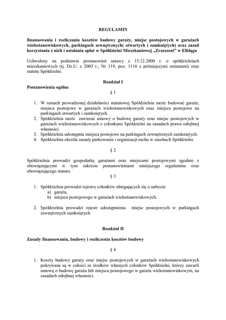 REGULAMIN finansowania i rozliczania kosztów budowy garaży, miejsc postojowych w garażach wielostanowiskowych, parkingach zewnętrznych( otwartych i zamkniętych) oraz zasad korzystania z nich i ustalania opłat w Spółdzielni Mieszkaniowej „Zrzeszeni” w Elblągu Uchwalony na podstawie postanowień ustawy z 15.12.2000 r. o spółdzielniach mieszkaniowych (tj. Dz.U. z 2003 r., Nr 119, poz. 1116 z późniejszymi zmianami) oraz statutu Spółdzielni. Rozdział I Postanowienia ogólne §1 1. W ramach prowadzonej działalności statutowej Spółdzielnia może budować garaże, miejsca postojowe w garażach wielostanowiskowych oraz miejsca postojowe na parkingach otwartych i zamkniętych. 2. Spółdzielnia może zawierać umowy o budowę garaży oraz miejsc postojowych w garażach wielostanowiskowych z członkami Spółdzielni na zasadach prawa odrębnej własności. 3. Spółdzielnia udostępnia miejsca postojowe na parkingach zewnętrznych zamkniętych. 4. Spółdzielnia określa zasady parkowania i organizacji ruchu w zasobach Spółdzielni. §2 Spółdzielnia prowadzi gospodarkę garażami oraz miejscami postojowymi zgodnie z obowiązującymi w tym zakresie postanowieniami niniejszego regulaminu oraz obowiązującego statutu. §3 1. Spółdzielnia prowadzi rejestry członków ubiegających się o nabycie: a) garażu, b) miejsca postojowego w garażach wielostanowiskowych. 2. Spółdzielnia prowadzi rejestr udostępnienia zewnętrznych zamkniętych. miejsc postojowych w parkingach Rozdział II Zasady finansowania, budowy i rozliczenia kosztów budowy §4 1. Koszty budowy garaży oraz miejsc postojowych w garażach wielostanowiskowych pokrywane są w całości ze środków własnych członków Spółdzielni, którzy zawarli umowę o budowę garażu lub miejsca postojowego w garażu wielostanowiskowym, na zasadach odrębnej własności. 2. Koszty budowy miejsc postojowych w parkingach zewnętrznych (zamkniętych i otwartych) obciążają koszty ogólne inwestycji, przy których są realizowane, lub finansowane są ze środków własnych Spółdzielni. §5 1. Wysokość rat i termin wpłaty wkładu budowlanego na pokrycie kosztów budowy garażu lub miejsca postojowego w garażu wielostanowiskowym ustala Zarząd Spółdzielni. 2. Przyjmuje się, że koszt budowy metra kwadratowego powierzchni użytkowej garażu lub miejsca postojowego w garażu wielostanowiskowym, o których mowa w §6 ust. 1 regulaminu, wynosi 50% kosztu budowy metra kwadratowego powierzchni użytkowej lokalu mieszkalnego w realizowanej inwestycji. 3. Koszt budowy metra kwadratowego powierzchni użytkowej lokalu mieszkalnego w realizowanej inwestycji wymaga zatwierdzenia przez Radę Nadzorczą Spółdzielni . Rozdział III Nabycie i użytkowanie garażu lub miejsca postojowego w garażu wielostanowiskowym §6 1. Umowę o ustanowienie odrębnej własności garażu oraz ułamkowego udziału we współwłasności garażu wielostanowiskowego Spółdzielnia zawiera z członkami wyłonionymi w pierwszej kolejności w drodze losowania ograniczonego, spośród zainteresowanych członków zamieszkałych w nieruchomości, w której realizowana jest inwestycja. W przypadku niewyczerpania oferty losowanie przeprowadza się spośród pozostałych członków Spółdzielni. 2. O ustanowienie prawa do garażu, miejsca postojowego w garażu wielostanowiskowym realizowanych w ramach inwestycji w nieruchomościach niezabudowanych, garażowych oraz w nieruchomościach z budynkami użytkowymi mogą ubiegać się członkowie Spółdzielni wyłonieni w drodze losowania spośród zainteresowanych członków Spółdzielni. 3. Warunkiem zawarcia umowy o ustanowienie praw, o których mowa w ust. 1 i 2, jest posiadanie przez członka Spółdzielni na dzień zawierania umowy pojazdu mechanicznego lub właścicielem takiego pojazdu jest osoba bliska wspólnie zamieszkała z członkiem lub pojazd taki został im oddany do stałej dyspozycji. §7 1. Losowanie, o którym mowa w §6 ust. 1 regulaminu, przeprowadza się w trzech etapach: I etap – uczestniczą w nim zainteresowani członkowie Spółdzielni, którzy zawarli umowę o budowę lokalu o największej powierzchni użytkowej(powyżej 60 m2) w realizowanej inwestycji, II etap – uczestniczą w nim pozostali zainteresowani członkowie Spółdzielni, którzy zawarli umowę o budowę lokalu w realizowanej inwestycji, III etap – uczestniczą w nim pozostali zainteresowani członkowie Spółdzielni. W przypadku wyczerpania oferty w pierwszym etapie kolejne etapy losowania się pomija. 2. Terminy poszczególnych etapów losowania określa Zarząd w uzgodnieniu z Radą Nadzorczą. 3. Losowanie przeprowadza, powołana przez Zarząd, Komisja Losowania, licząca minimum 3 osoby. W posiedzeniu Komisji, jako obserwator, uczestniczy członek Rady Nadzorczej. Komisja ze swoich czynności sporządza protokół i przedstawia go do zatwierdzenia Zarządowi. §8 1. O nabycie garażu lub miejsca postojowego w garażu wielostanowiskowym mogą ubiegać się członkowie Spółdzielni, którzy złożyli pisemną deklarację oraz wpłacili 5% szacowanych kosztów budowy. 2. Spółdzielnia zobowiązuje się do zawarcia, w formie aktu notarialnego, umowy o ustanowienie na rzecz członka Spółdzielni odrębnej własności garażu lub miejsca postojowego w garażu wielostanowiskowym, będącego przedmiotem zawartej umowy o budowę, po wniesieniu przez niego wkładu budowlanego w wysokości odpowiadającej całości kosztów budowy przypadających na jego garaż lub miejsce postojowe w garażu wielostanowiskowym, nie później niż po trzech miesiącach od daty przekazania obiektu do użytkowania. 3. Koszty związane z ustanowieniem odrębnej własności garażu lub miejsca postojowego w garażu wielostanowiskowym ponosi członek Spółdzielni. 4. Osobie, która nie wylosuje prawa do nabycia własności garażu lub miejsca w garażu wielostanowiskowym, kwota wymieniona w ust 1 jest zwracana w terminie 7 dni od dnia ro