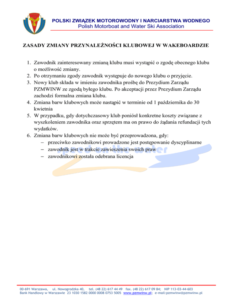 POLSKI ZWIĄZEK MOTOROWODNY I NARCIARSTWA WODNEGO Polish Motorboat and Water Ski Association ZASADY ZMIANY PRZYNALEŻNOŚCI KLUBOWEJ W WAKEBOARDZIE 1. Zawodnik zainteresowany zmianą klubu musi wystąpić o zgodę obecnego klubu o możliwość zmiany. 2. Po otrzymaniu zgody zawodnik występuje do nowego klubu o przyjęcie. 3. Nowy klub składa w imieniu zawodnika prośbę do Prezydium Zarządu PZMWINW ze zgodą byłego klubu. Po akceptacji przez Prezydium Zarządu zachodzi formalna zmiana klubu. 4. Zmiana barw klubowych może nastąpić w terminie od 1 października do 30 kwietnia 5. W przypadku, gdy dotychczasowy klub poniósł konkretne koszty związane z wyszkoleniem zawodnika oraz sprzętem ma on prawo do żądania refundacji tych wydatków. 6. Zmiana barw klubowych nie może być przeprowadzona, gdy: przeciwko zawodnikowi prowadzone jest postępowanie dyscyplinarne zawodnik jest w trakcie zawieszenia swoich praw zawodnikowi została odebrana licencja 00-691 Warszawa, ul. Nowogrodzka 40, tel. (48 22) 617 44 49 fax. (48 22) 617 09 84; NIP 113-03-44-603 Bank Handlowy w Warszawie 23 1030 1582 0000 0008 0753 5005 www.pzmwinw.pl; e-mail:[email protected]