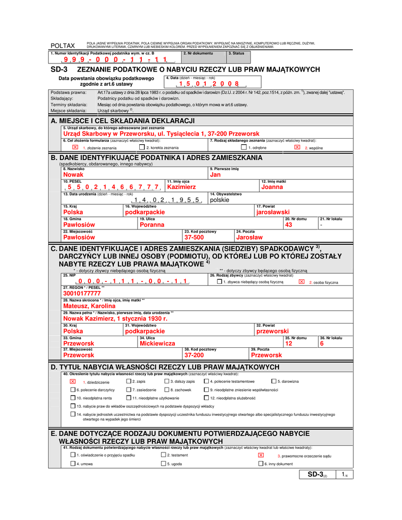 POLA JASNE WYPEŁNIA PODATNIK, POLA CIEMNE WYPEŁNIA ORGAN PODATKOWY. WYPEŁNIĆ NA MASZYNIE, KOMPUTEROWO LUB RĘCZNIE, DUŻYMI, DRUKOWANYMI LITERAMI, CZARNYM LUB NIEBIESKIM KOLOREM. PRZED WYPEŁNIENIEM ZAPOZNAĆ SIĘ Z OBJAŚNIENIAMI. POLTAX 1. Numer Identyfikacji Podatkowej podatnika wym. w cz. B 2. Nr dokumentu 3. Status 9 9 9 - 0 0 0 - 1 1 - 1 1 SD-3 ZEZNANIE PODATKOWE O NABYCIU RZECZY LUB PRAW MAJĄTKOWYCH Data powstania obowiązku podatkowego zgodnie z art.6 ustawy Podstawa prawna: Składający: Terminy składania: Miejsce składania: 4. Data (dzień - miesiąc - rok) 1 5 0 1 2 0 0 8 Art.17a ustawy z dnia 28 lipca 1983 r. o podatku od spadków i darowizn (Dz.U. z 2004 r. Nr 142, poz.1514, z późn. zm. 1)), zwanej dalej "ustawą". Podatnicy podatku od spadków i darowizn. Miesiąc od dnia powstania obowiązku podatkowego, o którym mowa w art.6 ustawy. Urząd skarbowy 2). A. MIEJSCE I CEL SKŁADANIA DEKLARACJI 5. Urząd skarbowy, do którego adresowane jest zeznanie Urząd Skarbowy w Przeworsku, ul. Tysiąclecia 1, 37-200 Przeworsk 6. Cel złożenia formularza (zaznaczyć właściwy kwadrat): ⌧ 7. Rodzaj składanego zeznania (zaznaczyć właściwy kwadrat): 2. korekta zeznania 1. złożenie zeznania ⌧ 1. odrębne 2. wspólne B. DANE IDENTYFIKUJĄCE PODATNIKA I ADRES ZAMIESZKANIA (spadkobiercy, obdarowanego, innego nabywcy) 8. Nazwisko 9. Pierwsze imię Nowak Jan 10. PESEL 5 5 0 2 1 4 6 6 7 7 7 13. Data urodzenia (dzień - miesiąc - rok) 1 4 11. Imię ojca 12. Imię matki Kazimierz 0 2 1 9 5 5 Joanna 14. Obywatelstwo polskie 15. Kraj 16. Województwo 17. Powiat Polska podkarpackie jarosławski 18. Gmina 19. Ulica Pawłosiów 20. Nr domu Poranna 21. Nr lokalu 43 22. Miejscowość 23. Kod pocztowy 24. Poczta Pawłosiów 37-500 Jarosław - C. DANE IDENTYFIKUJĄCE I ADRES ZAMIESZKANIA (SIEDZIBY) SPADKODAWCY 3), DARCZYŃCY LUB INNEJ OSOBY (PODMIOTU), OD KTÓREJ LUB PO KTÓREJ ZOSTAŁY NABYTE RZECZY LUB PRAWA MAJĄTKOWE 4) * - dotyczy zbywcy niebędącego osobą fizyczną 25. NIP 0 0 0 - 1 1 1 - 0 0 ** - dotyczy zbywcy będącego osobą fizyczną - 1 1 26. Rodzaj zbywcy (zaznaczyć właściwy kwadrat) ⌧ 1. zbywca niebędący osobą fizyczną 27. REGON * / PESEL ** 2. osoba fizyczna 30010177777 28. Nazwa skrócona * / Imię ojca, imię matki ** Mateusz, Karolina 29. Nazwa pełna * / Nazwisko, pierwsze imię, data urodzenia ** Nowak Kazimierz, 1 stycznia 1930 r. 30. Kraj 31. Województwo 32. Powiat Polska podkarpackie przeworski 33. Gmina 34. Ulica Przeworsk 35. Nr domu Mickiewicza 36. Nr lokalu 12 37. Miejscowość 38. Kod pocztowy 39. Poczta Przeworsk 37-200 Przeworsk 6 D. TYTUŁ NABYCIA WŁASNOŚCI RZECZY LUB PRAW MAJĄTKOWYCH 40. Określenie tytułu nabycia własności rzeczy lub praw majątkowych (zaznaczyć właściwy kwadrat): ⌧ 2. zapis 3. dalszy zapis 4. polecenie testamentowe 6. polecenie darczyńcy 7. zasiedzenie 8. zachowek 9. nieodpłatne zniesienie współwłasności 10. nieodpłatna renta 11. nieodpłatne użytkowanie 1. dziedziczenie 5. darowizna 12. nieodpłatna służebność 13. nabycie praw do wkładów oszczędnościowych na podstawie dyspozycji wkładcy 14. nabycie jednostek uczestnictwa na podstawie dyspozycji uczestnika funduszu inwestycyjnego otwartego albo specjalistycznego funduszu inwestycyjnego otwartego na wypadek jego śmierci E. DANE DOTYCZĄCE RODZAJU DOKUMENTU POTWIERDZAJĄCEGO NABYCIE WŁASNOŚCI RZECZY LUB PRAW MAJĄTKOWYCH 41. Rodzaj dokumentu potwierdzającego nabycie własności rzeczy lub praw majątkowych (zaznaczyć właściwy kwadrat lub właściwe kwadraty): 1. oświadczenie o przyjęciu spadku 2. testament 4. umowa 5. ugoda ⌧ 3. prawomocne orzeczenie sądu 6. inny dokument SD-3(2) 1/4 POLA JASNE WYPEŁNIA PODATNIK, POLA CIEMNE WYPEŁNIA ORGAN PODATKOWY. WYPEŁNIĆ NA MASZYNIE, KOMPUTEROWO LUB RĘCZNIE, DUŻYMI DRUKOWANYMI LITERAMI, CZARNYM LUB NIEBIESKIM KOLOREM. PRZED WYPEŁNIENIEM ZAPOZNAĆ SIĘ Z OBJAŚNIENIAMI. POLTAX F. DANE DOTYCZĄCE PRZEDMIOTU OPODATKOWANIA F.1. RZECZY LUB PRAWA MAJĄTKOWE BĘDĄCE PRZEDMIOTEM SPADKU, DAROWIZNY, ZASIEDZENIA LUB NABYTE INNYM TYTUŁEM Własność zbywcy Rzeczy lub prawa majątkowe według stanu w dniu nabycia Lp. Wyłączna a b c 42. 1 Współwłasność (wielkość udziału) Spóldzielcze własnościowe prawo do lokalu mieszkalnego o pow. użytk. d 44. 43. 47. Lokal mieszkalny stanowiący odrębną nieruchomość o pow. użytk. 60 m2 48. 49. 1/2 111111 oraz w nieruchomości gruntowej nr Kw 2222222 52. 3 Nieruchomość niezabudowana o powierzchni gruntu 45. 46. 50. 51. / wraz z udziałem w częściach wspólnych nieruchomości nr Kw e Wartość rynkowa rzeczy lub praw majątkowych (udziału spadkodawcy, darczyńcy lub innego zbywcy) w dniu powstania obowiązku podatkowego w zł f 2 m; nr Kw 2 Miejsce położenia rzeczy lub wykonywania praw majątkowych (adres) Przeworsk, ul. Mickiewicza 12/6 (mieszkanie położone na 4/4 pięter, do remontu, rok budowy bloku 1982 r.) 200 000 53. 54. 55. 56. 58. 59. 60. 61. m2; nr Kw 57. 4 Nieruchomość zabudowana budynkiem mieszkalnym o pow. użytk. 120 m2; 2 nr Kw 222221212 63. 5 64. Gospodarstwo rolne o łącznej pow. budynkiem mieszkalnym o pow. użytk. 65. 66. 62. (w tym wartość budynku mieszkalnego - udziału) 700 000 zł 67. / m2; 68. (w tym wartość budynku mieszkalnego - udziału) 70. 71. Samochód osobowy marka Daewoo typ Matiz model Life nr rejestracyjny RPR 1 000 000 zł ha, w tym działka zabudowana nr Kw 69. 6 / ⌧ powierzchnia gruntu 762 m ; Gniewczyna, ul. Krucza 30 (dom parterowy, rok budowy 2005 r., posiada wszystkie media, telefon, w pobliżu jeziora) 1/2 A 234 72. 73. Przeworsk (przebieg pojazdu 90 tys. km) 5 000 zł 77. Nazwa banku (SKOK) 78. 82. Nazwa towarzystwa funduszy inwestycyjnych 83. rok produkcji 2001 74. 7 75. 79. 8 76. Środki pieniężne 80. Jednostki uczestnictwa w funduszu Inwestycyjnym otwartym albo specjalistycznym funduszu inwestycyjnym otwartym SD-3(2) / 2/4 81. / POLTAX POLA JASNE WYPEŁNIA PODATNIK, POLA CIEMNE WYPEŁN