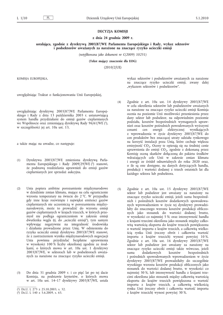 L 1/10 PL Dziennik Urzędowy Unii Europejskiej 5.1.2010 DECYZJA KOMISJI z dnia 24 grudnia 2009 r. ustalająca, zgodnie z dyrektywą 2003/87/WE Parlamentu Europejskiego i Rady, wykaz sektorów i podsektorów uważanych za narażone na znaczące ryzyko ucieczki emisji (notyfikowana jako dokument nr C(2009) 10251) (Tekst mający znaczenie dla EOG) (2010/2/UE) wykaz sektorów i podsektorów uważanych za narażone na znaczące ryzyko ucieczki emisji, zwany dalej „wykazem sektorów i podsektorów”. KOMISJA EUROPEJSKA, uwzględniając Traktat o funkcjonowaniu Unii Europejskiej, (4) Zgodnie z art. 10a ust. 14 dyrektywy 2003/87/WE w celu określenia sektorów lub podsektorów uważanych za narażone na znaczące ryzyko ucieczki emisji Komisja ocenia na poziomie Unii możliwości przeniesienia przez dany sektor lub podsektor, na odpowiednim poziomie podziału, kosztów bezpośrednich wymaganych upraw nień oraz kosztów pośrednich powodowanych wyższymi cenami cen energii elektrycznej wynikających z wprowadzenia w życie dyrektywy 2003/87/WE do cen produktów bez znaczącej utraty udziału rynkowego na korzyść instalacji poza Unią, które cechuje większa emisyjność CO2. Oceny te opierają się na średniej cenie uprawnienia do emisji CO2, zgodnie z dokonaną przez Komisję oceną skutków dołączoną do pakietu środków wdrażających cele Unii w zakresie zmian klimatu i energii ze źródeł odnawialnych do roku 2020 oraz, o ile są one dostępne, na danych dotyczących handlu, produkcji i wartości dodanej z trzech ostatnich lat dla każdego sektora lub podsektora. (5) Zgodnie z art. 10a ust. 15 dyrektywy 2003/87/WE sektor lub podsektor jest uważany za narażony na znaczące ryzyko ucieczki emisji, jeżeli suma bezpośred nich i pośrednich kosztów dodatkowych spowodowa nych wprowadzeniem w życie tej dyrektywy prowadzi łaby do znacznego wzrostu kosztów produkcji obliczo nych jako stosunek do wartości dodanej brutto, w wysokości co najmniej 5 %; oraz intensywność handlu z krajami trzecimi określona jako stosunek między całko witą wartością eksportu do krajów trzecich powiększona o wartość importu z krajów trzecich, a całkowitą wielko ścią rynku Unii (roczny obrót i całkowita wartość importu z krajów trzecich) wynosi powyżej 10 %. Zgodnie z art. 10a ust. 16 dyrektywy 2003/87/WE sektor lub podsektor jest uważany za narażony na znaczące ryzyko ucieczki emisji także wówczas, jeżeli suma dodatkowych kosztów bezpośrednich i pośrednich spowodowanych wprowadzeniem w życie dyrektywy 2003/87/WE prowadziłaby do szczególnie wysokiego wzrostu kosztów produkcji obliczonych jako stosunek do wartości dodanej brutto, w wysokości co najmniej 30 %, lub intensywność handlu z krajami trze cimi określona jako stosunek między całkowitą wartością eksportu do krajów trzecich powiększona o wartość importu z krajów trzecich, a całkowitą wielkością rynku Unii (roczny obrót i całkowita wartość importu z krajów trzecich) wynosi powyżej 30 %. uwzględniając dyrektywę 2003/87/WE Parlamentu Europej skiego i Rady z dnia 13 października 2003 r. ustanawiającą system handlu przydziałami do emisji gazów cieplarnianych we Wspólnocie oraz zmieniającą dyrektywę Rady 96/61/WE (1), w szczególności jej art. 10a ust. 13, a także mając na uwadze, co następuje: (1) Dyrektywa 2003/87/WE zmieniona dyrektywą Parla mentu Europejskiego i Rady 2009/29/WE (2) stanowi, że podstawą rozdzielania uprawnień do emisji gazów cieplarnianych jest sprzedaż aukcyjna. (2) Unia popiera ambitne porozumienie międzynarodowe w dziedzinie zmian klimatu, mające na celu ograniczenie wzrostu temperatury na świecie do 2 °C. W przypadku gdy inne kraje rozwinięte i najwięksi emitenci gazów cieplarnianych nie uczestniczą w porozumieniu między narodowym, może to prowadzić do wzrostu emisji gazów cieplarnianych w krajach trzecich, w których prze mysł nie podlega ograniczeniom w zakresie emisji dwutlenku węgla (tj. do „ucieczki emisji”), tym samym wpływając negatywnie na integralność środowiska i działania prowadzone przez Unię. W odniesieniu do ryzyka ucieczki emisji dyrektywa 2003/87/WE stanowi, że z zastrzeżeniem wyniku międzynarodowych negocjacji Unia powinna przydzielać bezpłatne uprawnienia w wysokości 100 % liczby określonej zgodnie ze środ kami, o których mowa w art. 10a ust. 1 dyrektywy 2003/87/WE, w sektorach lub w podsektorach uważa nych za narażone na znaczące ryzyko ucieczki emisji. (3) Do dnia 31 grudnia 2009 r. i co pięć lat po tej dacie Komisja, na podstawie kryteriów, o których mowa w art. 10a ust. 14–17 dyrektywy 2003/87/WE, ustala (1) Dz.U. L 275 z 25.10.2003, s. 32. (2) Dz.U. L 140 z 5.6.2009, s. 63. 5.1.2010 (6) PL Dziennik Urzędowy Unii Europejskiej W celu ustalenia wykazu sektorów i podsektorów uważa nych za narażone na znaczące ryzyko ucieczki emisji należy najpierw ocenić ryzyko ucieczki emisji na poziomie trzycyfrowym (poziom NACE-3) lub, w stosownych przypadkach i gdy dane są dostępne, na poziomie czterocyfrowym (poziom NACE-4). Sektory i podsektory należy umieszczać w wykazie sektorów i podsektorów z zastosowaniem najbardziej precyzyjnego opisu NACE. Niektóre sektory, których nie uznano za narażone na znaczące ryzyko ucieczki emisji na poziomie NACE-4 zostały podzielone, a następnie ocenie poddano szereg odpowiadających im podsektorów, w przypadku których pewne cechy wywoływały zasad niczo inne skutki niż pozostała część sektora. (7) Informacje niezbędne do dokonania ustaleń na podstawie kryteriów, o których mowa w art. 10a ust. 14–17 dyrek tywy 2003/87/WE zebrano do grudnia 2008 r. od państw członkowskich, Eurostatu, ze źródeł dostępnych publicznie i na rynku oraz od stowarzyszeń branżowych. Sprawdzono informacje, które nie pochodziły od państw członkowskich lub z innych oficjalnych źródeł. Korzys tano również z danych poufnych przetwarzanych przez Eu