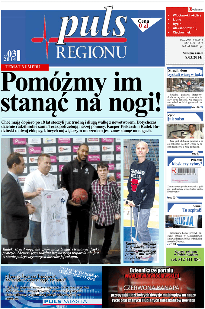 D ocieramy: Cena 0 zł • • • • • Włocławek i okolice Lipno Rypin Aleksandrów Kuj. Ciechocinek 14.02.2014- 8 03.2014 ISSN 1732 - 7873 Nakład: 10 000 egz. 03 2014 Następny numer Nr 8.03.2014r Pomóżmy im stanąć na nogi! TEMAT NUMERU Choć mają dopiero po 18 lat stoczyli już trudną i długą walkę z nowotworem. Dotychczas dzielnie radzili sobie sami. Teraz potrzebują naszej pomocy. Kacper Piekarski i Radek Budziński to dwaj chłopcy, których największym marzeniem jest znów stanąć na nogach. Stracili dom zyskali wiarę w ludzi Rodzina państwa Baranowskich w wyniku pożaru straciła cały swój dobytek. Na szczęście nie zabrakło ludzi gotowych im pomóc, str. 06 Zycie jak salsa Jaka jest ulubiona potrawa i za co pokochał Polskę? O tym w naczej rozmowie z Jose Torresem str. 07 Polecony kiosk czy rybny? Zmiana doręczyciela przesyłek z policji i prokuratury wciąż budzi wielkie kontrowersje str. 03 Alarm! Tu szpital! Radek stracił nogę, ale znów może biegać i trenować dzięki protezie. Niestety jego rodzina bez naszego wsparcia nie jest w stanie pokryć ogromnych kosztów jej zakupu. Kacper uwielbia koszykówkę. Tylko kosztowna operacja pozwoli mu wrócić na parkiet. Prawdziwy horror przeżyli pacjenci szpitala w Aleksandrowie Kujawskim na wieść że w budynku może być bomba. str. 10 Zamów reklamę w Pulsie Regionu tel. 512 111 884 02 Włocławek Puls Regionu 14 lutego 2014- 7 marca 2014 www.pulsregionu.com.pl Piętnaście tygodni Jest drogo, w australijskim raju czyli tanio? Wojciech Jaranowski, radny sejmiku kujawsko-pomorskieTak zapowiada się wyjazd Rafała Głowackiego na stypendium The Australian Natio- go, mówi o kolejowej dyskryminacji. Uważa, że bilety WiTCity i BiTCity to krzywda dla mieszkańców. nal College of English (ANCE) w Melbourne. - To dla mnie nade wszystko szansa na rozwój - podkreśla Rafał Głowacki, stypendysta ANCE.- Mam wykształcenie, pracę, a teraz czas na wyzwania. Melbourne kusi nie tylko kursem językowym, ale także szansą na poznanie ludzi z różnych zakątków świata, poznanie australijskich tradycji, zwyczajów, kuchni. Słowem Dane kontaktowe: 54 231 17 77 512 111 648 [email protected] - odkrycie nowego tajemniczego świata. Należę do osób, które nie lubią stać w miejscu. Potrzebuję nowych wyzwań, a te zapewnia mi szczęśliwie zdobyte australijskie stypendium. W konkursie wzięło udział ponad 80 osób z Polski. Mieli wspólne marzenie - studiować w najbardziej przyjaznym mieście na świecie Melbourne. - Pan Rafał bardzo mi zaimponował swoją postawą, odwagą i siłą - dodaje Sławomir Kopyść, radny sejmiku województwa kujawsko-pomorskiego.- Posiada wykształcenie wyższe na kierunku technicznym, a jego silna determinacja pozwala mu z małej miejscowości pod Choceniem podbić Australię. To było zawsze nasze jako nauczycieli języka obcego Redaktor naczelna: Redakcja: Joanna Lewandowska Barbara Szmejter Zastępca redaktora naczelnego: Monika Grzanka Renata Kończyńska Laura Nawrocka Marcin Kmieć Iwona Bluszcz marzenie sprawić, by młodzi ludzie kształcili umiejętności, zdobywali kompetencje, wyjeżdżali, a nade wszystko z tak wielkim bagażem doświadczeń wracali do nas. Do czerwca przez cztery dni w tygodniu Rafał będzie się uczyć, a weekend jak podkreśla poświęci na sport, turystykę i pracę dodatkową. - Spodziewam się poznać inne nowoczesne technologie, szczególnie w zakresie budownictwa - dodaje Rafał Głowacki, stypendysta ANCE.- Chcę nie tylko czerpać, ale i dzielić się. Dlatego też przygotowałem specjalna prezentację najpiękniejszych miejsc w Polsce, w moim regionie. Przekonam ich, że nie tylko australijczycy żyją w pięknym kraju. Reklama i ogłoszenia: [email protected] Ewa Śmigielska tel:512 111 884 Sławomir Mistera tel. 512 - 111 - 686 - Złożyłem stosowną interpelację w tej sprawie na ręce przewodniczącej sejmiku - podkreśla Wojciech Jaranowski.- Zbulwersował mnie fakt, że cena biletu miesięcznego z 240 złotych wzrosła, na tak ważnej dla nas trasie, do 300 złotych. To jawna dyskryminacja. Poza tym między Bydgoszczą a Toruniem połączenia są tańsze niż pomiędzy Włocławkiem i Toruniem, choć trasa krótsza. A jeszcze w 2013 roku było inaczej. - My jesteśmy drożsi, jeśli chodzi o ofertę promocyjną, jaką do momentu zawarcia przez nas stosownej umowy miały Przewozy Regionalne - podkreśla Joanna Parzniewska, rzecznik Zdjęcia: Arriva RP.- Połączenia w trybie WiT zachowaliśmy ze względu na zainteresowanie pasażerów, choć zgodnie z zawartą umową nie musieliśmy tego robić. Dlatego też doszło do porozumienia z władzami Włocławka i Torunia i ta cena biletów, którą oferujemy, jest najniższą z możliwych. Utrzymaliśmy WiTCity tak tanio, jak to tylko było możliwe. Nie wykluczamy jednak, że z czasem cena ulegnie zmianie. Przewozy Regionalne kontra Arriva RP - w ocenie pasażerów - to nierówna walka. Bilans zysków w postaci przywrócenia od 15 stycznia połączenia Włocławek-Kutno wyrównuje straty w wyższej cenie WiTCity. Wszyscy mają rację, a cierpią jak zawsze pasażerowie, którzy po prostu chcą dojechać do miejsca przeznaczenia na czas. Wydawca: Kasper Walczykowski Mariusz Szynkiewicz Piotr Kędzierski Skład i grafika: Milena Sudomir-Gordon Medialne Centrum Kujaw ul. Piaski 9 87 - 800 Włocławek Prezes zarządu: Waldemar Nowakowski Sąd Rejonowy w Toruniu, VII Wydz. Gospodarczy Krajowego Rejestru Sądowego KRS 0000306552 NIP 8882998854 REGON 340462591 Kapitał zakładowy: 467 500 zł www.pulsregionu.com.pl Puls Regionu Aktualności 14 lutego 2014- 7 marca 2014 Niech staną na nogi! Włocławek 03 TEMAT NUMERU Choć mają dopiero po 18 lat stoczyli już trudną i długą walkę z nowotworem. Dotychczas dzielnie radzili sobie sami. Teraz potrzebują naszej pomocy. Kacper Piekarski i Radek Budziński to dwaj chłopcy, których największym marzeniem jest znów stanąć na nogach. 
