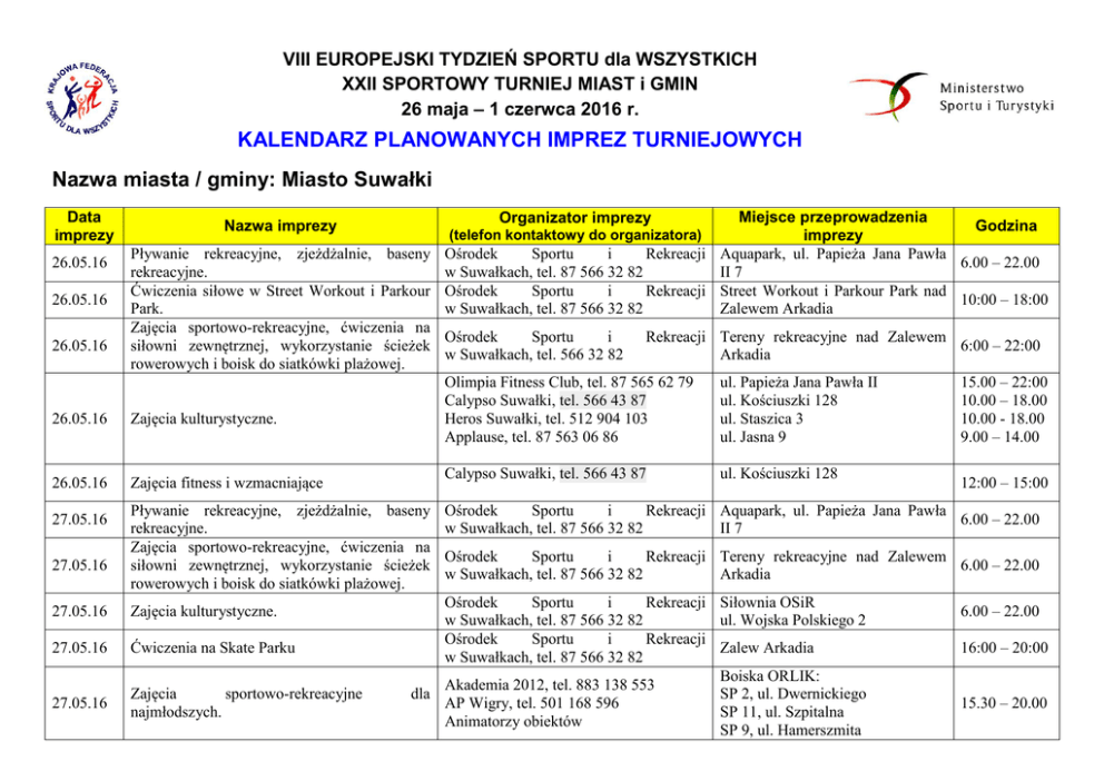 VIII EUROPEJSKI TYDZIEŃ SPORTU dla WSZYSTKICH XXII SPORTOWY TURNIEJ MIAST i GMIN 26 maja – 1 czerwca 2016 r. KALENDARZ PLANOWANYCH IMPREZ TURNIEJOWYCH Nazwa miasta / gminy: Miasto Suwałki Data imprezy 26.05.16 26.05.16 26.05.16 26.05.16 26.05.16 27.05.16 27.05.16 Miejsce przeprowadzenia Godzina imprezy Pływanie rekreacyjne, zjeżdżalnie, baseny Ośrodek Sportu i Rekreacji Aquapark, ul. Papieża Jana Pawła 6.00 – 22.00 rekreacyjne. w Suwałkach, tel. 87 566 32 82 II 7 Ćwiczenia siłowe w Street Workout i Parkour Ośrodek Sportu i Rekreacji Street Workout i Parkour Park nad 10:00 – 18:00 Park. w Suwałkach, tel. 87 566 32 82 Zalewem Arkadia Zajęcia sportowo-rekreacyjne, ćwiczenia na Ośrodek Sportu i Rekreacji Tereny rekreacyjne nad Zalewem siłowni zewnętrznej, wykorzystanie ścieżek 6:00 – 22:00 w Suwałkach, tel. 566 32 82 Arkadia rowerowych i boisk do siatkówki plażowej. Olimpia Fitness Club, tel. 87 565 62 79 ul. Papieża Jana Pawła II 15.00 – 22:00 Calypso Suwałki, tel. 566 43 87 ul. Kościuszki 128 10.00 – 18.00 Zajęcia kulturystyczne. Heros Suwałki, tel. 512 904 103 ul. Staszica 3 10.00 - 18.00 Applause, tel. 87 563 06 86 ul. Jasna 9 9.00 – 14.00 Organizator imprezy Nazwa imprezy (telefon kontaktowy do organizatora) Calypso Suwałki, tel. 566 43 87 Zajęcia fitness i wzmacniające Pływanie rekreacyjne, zjeżdżalnie, baseny rekreacyjne. Zajęcia sportowo-rekreacyjne, ćwiczenia na siłowni zewnętrznej, wykorzystanie ścieżek rowerowych i boisk do siatkówki plażowej. 27.05.16 Zajęcia kulturystyczne. 27.05.16 Ćwiczenia na Skate Parku 27.05.16 Zajęcia sportowo-rekreacyjne najmłodszych. ul. Kościuszki 128 12:00 – 15:00 Ośrodek Sportu i Rekreacji Aquapark, ul. Papieża Jana Pawła 6.00 – 22.00 w Suwałkach, tel. 87 566 32 82 II 7 Ośrodek Sportu i Rekreacji Tereny rekreacyjne nad Zalewem 6.00 – 22.00 w Suwałkach, tel. 87 566 32 82 Arkadia Ośrodek Sportu i Rekreacji Siłownia OSiR w Suwałkach, tel. 87 566 32 82 ul. Wojska Polskiego 2 Ośrodek Sportu i Rekreacji Zalew Arkadia w Suwałkach, tel. 87 566 32 82 Boiska ORLIK: Akademia 2012, tel. 883 138 553 dla SP 2, ul. Dwernickiego AP Wigry, tel. 501 168 596 SP 11, ul. Szpitalna Animatorzy obiektów SP 9, ul. Hamerszmita 6.00 – 22.00 16:00 – 20:00 15.30 – 20.00 SP 7, ul. Minkiewicza Boisko, ul. Północna Boisko, ul. Ogrodowa 49 27.05.16 27.05.16 27.05.16 27.05.16 27.05.16 27.05.16 27.05.16 28.05.16 28.05.16 28.05.16 28.05.16 Ośrodek Sportu i Rekreacji w Suwałkach, tel. 87 566 32 82 Ćwiczenia siłowe w Street Workout i Parkour Ośrodek Sportu i Rekreacji Park. w Suwałkach, tel. 87 566 32 82 Snap Fitness, tel. 600 606 061 Olimpia Fitness, tel. 87 565 62 79 Guarana Fitness, tel. 501 674 545 Stayfit Fitness, tel. 530 015 700 Szkoła Jogi i Tai – Chi , tel. 665 208 308 Afita Fitness, tel. 513 005 412 Calypso Suwałki, tel. 566 43 87 Zajęcia fitness, siłowe, zumba, joga. Heros Suwałki, tel. 512 904 103 Studio Dance Fit Lidia Kulik, tel. 511 481 335 Applause, tel. 87 563 06 86 Klub kulturystyczny OSKAR, tel. 600 606 061 Zajęcia z żeglarstwa. Zajęcia sportowo – rekreacyjne w ramach Klub Karate Kyokushin, tel. 501 559 451 sekcji Karate Kyokushin. Ośrodek Sportu i Rekreacji Pływanie rekreacyjne. w Suwałkach, tel. 87 566 32 82 Ośrodek Sportu i Rekreacji Zajęcia ogólnorozwojowe z elementami boksu w Suwałkach, tel. 87 566 32 82 Zajęcia terenowe Sekcji Modelarstwa Ośrodek Sportu i Rekreacji Lotniczego OSiR w Suwałkach – loty modeli w Suwałkach, tel. 87 566 32 82 klasy F1B RESO Suwałki 10,5 – Miejskie Święto Ośrodek Sportu i Rekreacji biegania. w Suwałkach, tel. 87 566 32 82 Pływanie rekreacyjne, zjeżdżalnie, baseny Ośrodek Sportu i Rekreacji rekreacyjne, siłownia w Suwałkach, tel. 87 566 32 82 Zajęcia sportowo-rekreacyjne, ćwiczenia na Ośrodek Sportu i Rekreacji siłowni zewnętrznej, wykorzystanie ścieżek w Suwałkach, tel. 87 566 32 82 rowerowych i boisk do siatkówki plażowej Zajęcia kulturystyczne. Ośrodek Sportu i Rekreacji 10.00 – 18.00 Zalew Arkadia Street Workout i Parkour Park nad 10:00 – 18:00 Zalewem Arkadia ul. Sejneńska 11 ul. Papieża Jana Pawła II ul. Dmowskiego 2 ul. Minkiewicza 50 ul. Falka 29 Szkoła Podstawowa nr ul. Kościuszki 128 ul. Staszica 3 ul. Antoniewicza 5 ul. Jasna 9 ul. Sejneńska 11 18.30 - 20.00 17.15 – 20.15 18.00 – 20.00 18.00 - 21.00 18.00 – 21.00 18.30 – 19.30 11 16.20 – 22.00 17.30 – 20.30 19:00 – 21:00 17:00 – 21:00 20:00 – 21:00 Szkoła Podstawowa nr 10 16.00 – 21.00 Pływalnia, ul. Wojska Polskiego 2 6.00 – 20.00 Zespół Szkół nr 8 w Suwałkach, ul. 17.30 – 19.30 Kościuszki 126 Lotnisko, ul. Kpt.M. Wojczyńskiego 16:00 – 19:00 Plac im. Marii Konopnickiej 16:00 – 22:30 Aquapark, ul. Papieża Jana Pawła 6.00 – 22.00 II 7 Tereny rekreacyjne nad Zalewem 6.00 – 22.00 Arkadia Siłownia OSiR 9.00 – 17.00 w Suwałkach, tel. 87 566 32 82 28.05.16 28.05.16 29.05.16 29.05.16 Zajęcia fitness, zumba, joga. Zajęcia sportowo – rekreacyjne w ramach sekcji Karate Kyokushin. Pływanie rekreacyjne, zjeżdżalnie, baseny rekreacyjne, siłownia. Zajęcia sportowo-rekreacyjne, ćwiczenia na siłowni zewnętrznej, wykorzystanie ścieżek rowerowych i boisk do siatkówki plażowej 29.05.16 Zajęcia kulturystyczne. 29.05.16 Zajęcia fitness, zumba, joga. 29.05.16 Ćwiczenia na Skate Parku 29.05.16 29.05.16 30.05.16 30.05.16 30.05.16 30.05.16 30.05.16 30.05.16 30.05.16 ul. Wojska Polskiego 2 Calypso Suwałki, tel. 566 43 87 ul. Kościuszki 128 Applause, tel. 87 563 06 86 ul. Jasna 9 Klub kulturystyczny OSKAR, tel. 600 ul. Sejneńska 11 606 061 10.30 - 17.00 11.00 – 17.70 10.00 – 17.00 Klub Karate Kyokushin, tel. 501 559 451 Szkoła Podstawowa nr 10 10.00 – 18.00 Ośrodek Sportu i Rekreacji Aquapark, ul. Papieża Jana Pawła 6.00 – 22.00 w Suwałkach, tel. 87 566 32 82 II 7 Ośrodek Sportu i Rekreacji Tereny rekreacyjne nad Zalewem 6.00 – 22.00 w Suwałkach, tel. 87 566 32 82 Arka