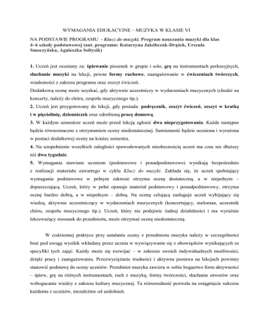 WYMAGANIA EDUKACYJNE – MUZYKA W KLASIE VI NA PODSTAWIE PROGRAMU - Klucz do muzyki. Program nauczania muzyki dla klas 4–6 szkoły podstawowej (aut. programu: Katarzyna Jakóbczak-Drążek, Urszula Smoczyńska, Agnieszka Sołtysik) 1. Uczeń jest oceniany za: śpiewanie piosenek w grupie i solo, grę na instrumentach perkusyjnych, słuchanie muzyki na lekcji, pewne formy ruchowe, zaangażowanie w ćwiczeniach twórczych, wiadomości z zakresu programu oraz zeszyt ćwiczeń. Dodatkową ocenę może uzyskać, gdy aktywnie uczestniczy w wydarzeniach muzycznych (chodzi na koncerty, należy do chóru, zespołu muzycznego itp.). 2. Uczeń jest przygotowany do lekcji, gdy posiada: podręcznik, zeszyt ćwiczeń, zeszyt w kratkę i w pięciolinię, dzienniczek oraz odrobioną pracę domową. 3. W każdym semestrze uczeń może przed lekcją zgłosić dwa nieprzygotowania. Każde następne będzie równoznaczne z otrzymaniem oceny niedostatecznej. Sumienność będzie oceniona i wyrażona w postaci dodatkowej oceny na koniec semestru. 4. Na uzupełnienie wszelkich zaległości spowodowanych nieobecnością uczeń ma czas nie dłuższy niż dwa tygodnie. 5. Wymagania stawiane uczniom (podstawowe i ponadpodstawowe) wynikają bezpośrednio z realizacji materiału zawartego w cyklu Klucz do muzyki. Zakłada się, że uczeń spełniający wymagania podstawowe w pełnym zakresie otrzyma ocenę dostateczną, a w niepełnym – dopuszczającą. Uczeń, który w pełni opanuje materiał podstawowy i ponadpodstawowy, otrzyma ocenę bardzo dobrą, a w niepełnym – dobrą. Na ocenę celującą zasługuje uczeń wybijający się wiedzą, aktywnie uczestniczący w wydarzeniach muzycznych (koncertujący, meloman, uczestnik chóru, zespołu muzycznego itp.). Uczeń, który nie podejmie żadnej działalności i ma wyraźnie lekceważący stosunek do przedmiotu, może otrzymać ocenę niedostateczną. W codziennej praktyce przy ustalaniu oceny z przedmiotu muzyka należy w szczególności brać pod uwagę wysiłek wkładany przez ucznia w wywiązywanie się z obowiązków wynikających ze specyfiki tych zajęć. Każdy może się rozwijać – w zakresie swoich indywidualnych możliwości, dzięki pracy i zaangażowaniu. Przezwyciężanie trudności i aktywna postawa na lekcjach powinny stanowić podstawę do oceny uczniów. Przedmiot muzyka zawiera w sobie bogactwo form aktywności – śpiew, grę na różnych instrumentach, ruch z muzyką, formy twórczości, słuchanie utworów oraz wzbogacanie wiedzy z zakresu kultury muzycznej. Ta różnorodność pozwala na osiągnięcie sukcesu każdemu z uczniów, niezależnie od uzdolnień. Wymagania podstawowe - uczeń: Wymienia odgłosy, które zapamiętał z wakacji Wymienia odgłosy otaczającego świata Wyjaśnia, czym są gestodźwięki Śpiewa gamę D-dur w górę i w dół solmizacją Śpiewa w grupie piosenki poznane w klasie VI Umie rozpoznać kilka głosów ptaków i właściwie je dopasować do ilustracji Bierze udział w akompaniowaniu do piosenek poznanych w klasie VI Zna podstawowe zasady higieny głosu i wie, jak wygląda aparat głosowy człowieka Umie powiedzieć, kim był S. Moniuszko i wymienia tytuły co najmniej dwóch jego kompozycji, w tym jednej opery Zna nazwy dwóch głosów męskich – tenoru i basu Potrafi wyjaśnić, co oznaczają określenia solo i tutti Wie, jaką rolę odgrywają w przedstawieniu operowym soliści, chór, orkiestra i balet Zna pojęcie ostinato Wie, co oznacza nazwa a cappella Dostrzega różnicę między śpiewem jedno- i wielogłosowym Wie, kiedy wybuchła II wojna światowa, umie powiedzieć parę zdań na temat działań partyzanckich i roli piosenek zakazanych Zna termin inspiracja i rozumie jego znaczenie, podaje przykład inspiracji przyrodą w muzyce Umie powiedzieć własnymi słowami, na czym polega praca kompozytora Zna nazwiska kilku największych kompozytorów Umie podać najważniejsze informacje o życiu i twórczości F. Chopina Wie, na czym polega konkurs chopinowski, zna co najmniej jedno nazwisko zwycięzcy konkursu Rozumie termin interpretacja Podaje nazwy poznanych dotąd instrumentów orkiestry symfonicznej oraz nazwy grup, do których te instrumenty należą Wie, co oznaczają terminy: orkiestra symfoniczna, strojenie instrumentów, batuta Wie, kim jest dyrygent Wie, co to jest partytura Orientuje się, jakie jest rozmieszczenie instrumentów w orkiestrze symfonicznej Wie, że baryton to nazwa głosu brzmiącego niżej od tenoru i wyżej od basu Wie, że koncert to nie tylko wydarzenie kulturalne, lecz także utwór wykonywany przez solistę-instrumentalistę z towarzyszeniem orkiestry Wie, kim jest wirtuoz Potrafi wyjaśnić termin aparat wykonawczy Wie, jakie są rodzaje chórów Wie, do jakiej grupy instrumentów należy gitara i jak jest zbudowana Zna wybrane przykłady polskiej muzyki rozrywkowej lat 60. i 70. Umie zatańczyć podstawowy krok rock and rolla Wie, że muzyka w filmie pełni różne funkcje Zna kilka faktów z początków historii kina Umie wymienić kliku znanych kompozytorów muzyki filmowej Zna najważniejsze etapy powstawania muzyki do filmu Wie, że współcześnie do komponowania muzyki filmowej często używa się komputera Wie, co to jest dżingiel radiowy Wymienia polskich kompozytorów, którzy otrzymali Oscary za muzykę filmową Zna kilka tytułów filmów, które otrzymały Oscary za muzykę filmową Wie, kim był W.A. Mozart Potrafi wymienić nazwy instrumentów smyczkowych, ma podstawowe wiadomości o ich budowie i zasadach gry Wie, czym zajmuje się lutnik Zna nazwisko J.S. Bacha, umie powiedzieć parę zdań o jego życiu i twórczości Potrafi przyporządkować organy do właściwej grupy instrumentów Potrafi znaleźć informacje o imprezach kulturalnych odbywających się w najbliższej okolicy Potrafi wymienić najważniejsze instytucje kultury muzycznej w Polsce (Filharmonia Narodowa i Opera Narodowa) oraz wie, gdzie się one znajdują Wie, gdzie jest naj