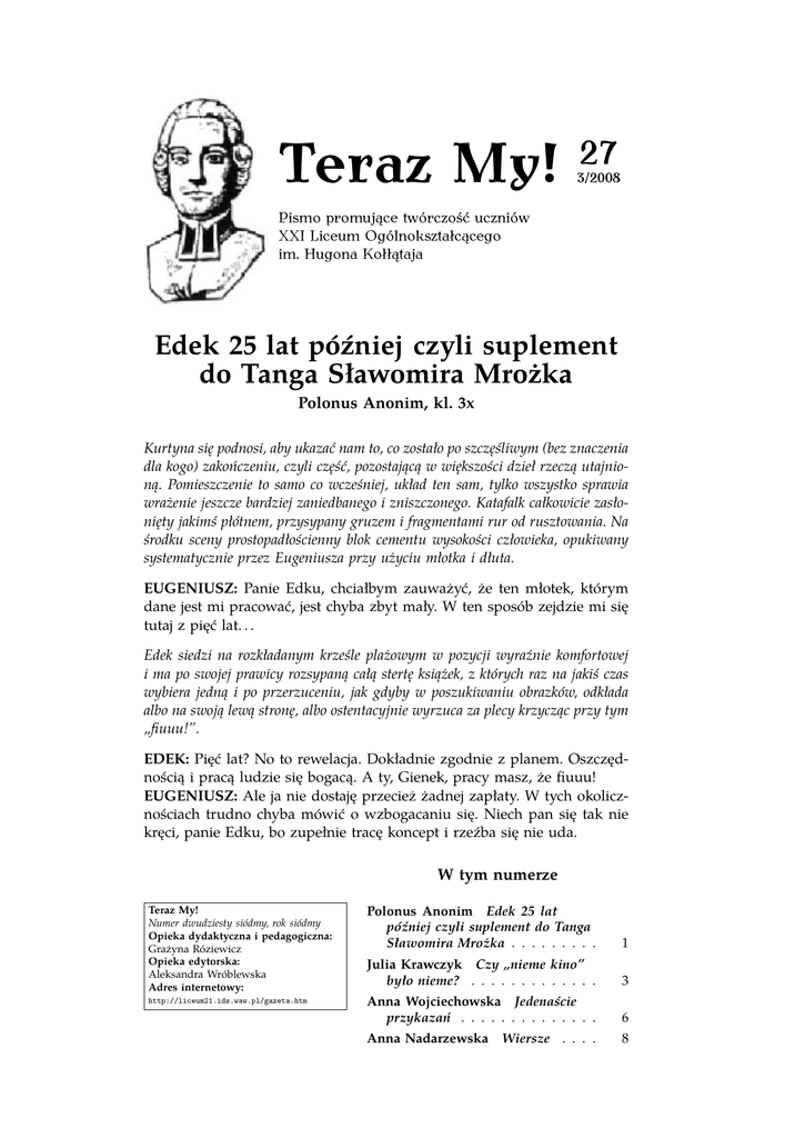 Teraz My! 27 3/2008 Pismo promujące twórczość uczniów XXI Liceum Ogólnokształcącego im. Hugona Kołłątaja Edek 25 lat później czyli suplement do Tanga Sławomira Mrożka Polonus Anonim, kl. 3x Kurtyna się podnosi, aby ukazać nam to, co zostało po szczęśliwym (bez znaczenia dla kogo) zakończeniu, czyli część, pozostającą w większości dzieł rzeczą utajnioną. Pomieszczenie to samo co wcześniej, układ ten sam, tylko wszystko sprawia wrażenie jeszcze bardziej zaniedbanego i zniszczonego. Katafalk całkowicie zasłonięty jakimś płótnem, przysypany gruzem i fragmentami rur od rusztowania. Na środku sceny prostopadłościenny blok cementu wysokości człowieka, opukiwany systematycznie przez Eugeniusza przy użyciu młotka i dłuta. EUGENIUSZ: Panie Edku, chciałbym zauważyć, że ten młotek, którym dane jest mi pracować, jest chyba zbyt mały. W ten sposób zejdzie mi się tutaj z pięć lat. . . Edek siedzi na rozkładanym krześle plażowym w pozycji wyraźnie komfortowej i ma po swojej prawicy rozsypaną całą stertę książek, z których raz na jakiś czas wybiera jedną i po przerzuceniu, jak gdyby w poszukiwaniu obrazków, odkłada albo na swoją lewą stronę, albo ostentacyjnie wyrzuca za plecy krzycząc przy tym „fiuuu!”. EDEK: Pięć lat? No to rewelacja. Dokładnie zgodnie z planem. Oszczędnością i pracą ludzie się bogacą. A ty, Gienek, pracy masz, że fiuuu! EUGENIUSZ: Ale ja nie dostaję przecież żadnej zapłaty. W tych okolicznościach trudno chyba mówić o wzbogacaniu się. Niech pan się tak nie kręci, panie Edku, bo zupełnie tracę koncept i rzeźba się nie uda. W tym numerze Teraz My! Numer dwudziesty siódmy, rok siódmy Opieka dydaktyczna i pedagogiczna: Grażyna Róziewicz Opieka edytorska: Aleksandra Wróblewska Adres internetowy: Polonus Anonim Edek 25 lat później czyli suplement do Tanga Sławomira Mrożka . . . . . . . . . 1 Julia Krawczyk Czy „nieme kino” było nieme? . . . . . . . . . . . . . 3 http://liceum21.ids.waw.pl/gazeta.htm Anna Wojciechowska Jedenaście przykazań . . . . . . . . . . . . . . 6 Anna Nadarzewska Wiersze . . . . 8 2 Teraz My, numer 27 — Dramat EDEK: (z rozmarzeniem, drapiąc się po karku) Uda, uda. . . Jak to nie dostaje pan zapłaty? A kto otrzymał prawo korzystania z węzła sanitarnego i regularne przydziały żywnościowe? Poza tym możliwość wykonywania pracy na rzecz ogółu społeczeństwa, w duchu braterskiej współpracy, jest najlepszą nagrodą za trudy dnia codziennego. EUGENIUSZ: Święte słowa panie Edku. Święte słowa. Tylko proszę się już nie ruszać, bo nic zupełnie z tego nie wyjdzie. Edek zamiera pozując, Eugeniusz nie przestaje stukać. Kurtyna nie opada. Lata lecą, Edek siedzi, Eugeniusz stuka. Publiczność nie wychodzi, bo nie może, powstrzymywana przez uzbrojonych strażników stojących przy wszystkich wejściach do sali. Widzowie nie mając innego wyjścia siedzą i patrzą, szepcząc tylko od czasu do czasu. Powoli, bez pośpiechu opada kurz. Czas mija w ten sposób. Trwa to około dekady, lub dwóch. Dla potrzeb teatru może to być około kwadransa. W gruncie rzeczy czas nie ma znaczenia. Chodzi od doprowadzenie do sytuacji, w której widzowie znudzeni i zirytowani, wyraźnie będą mieli wszystkiego serdecznie dosyć i zaczną się kręcić w fotelach, szepcząc coraz głośniej. Nawet najwięksi miłośnicy teatru eksperymentalnego. Na scenę wchodzi Waldemar, syn Edka i Ali, lat około 25, w towarzystwie Macieja. Edek wraca do życia niby nigdy nic. Jest ożywiony i aktywny. EDEK: Wróciło moje sreberko do domu? Syneczek mój? Walduś uściskaj tatę natychmiast! Waldemar nic nie robi. EDEK: Sam wróciłeś z przedszkola? Samiuśki? WALDEMAR: Tato, przestań. Mam już tego dosyć! Dosyć twojej ignorancji! Marazmu! I nieróbstwa! Tato, ja mam 25 lat, skończyłem studia, stałem się dorosły, poznałem świat i ludzi. Tato, ja wszystko zrobiłem, kiedy ty tak tu sobie siedziałeś! Wszystko! Mało tego! Maciej ma ci coś do powiedzenia. Macieju! Maciej, który do tej pory wałęsał się bez sensu po scenie, lekko zaniepokojony skupioną na nim uwagą, odchrząkuje kilkakrotnie jakby miał zaraz zacząć przemowę, ale nie robi tego, dopóki Waldemar nie szturchnie go w ramię. Po tym bodźcu zaczyna z patosem. MACIEJ: Drogi Panie Edwardzie! Basta! Skończyła się era Edka. W tym domu nie ma miejsca dla Pana. Będziemy budować nową społeczność ludzi wolnych i swobodnych. Otworzymy granice, otworzymy umysły, otworzymy sklepy z płytami Beatles’ów. . . Eugeniusz zaczyna słuchać z zainteresowaniem. WALDEMAR: Cicho! Chodzi o to, że potrzebujemy działania, motywacji. Potrzebujemy perspektyw. W twoim świecie nie można rozwinąć skrzydeł. Bezgraniczne samozadowolenie odebrało aktywności jakikolwiek sens. Twój stan to nie komfort psychiczny, ale komfort płynący z braku psychiki. MACIEJ: Wszystko sprzedamy na wzór amerykański. W Ameryce wszystko jest prywatne i wszystko jest wspaniałe. Ludzie uczą się przedsiębiorczości i wiedzą, że pracują na swój własny dobrobyt. Stopa się podniesie, jakość się podniesie, krzywa się podniesie, jakość i stopa życia się podniosą, wszystko się podniesie! I uniesie! Hen, hen, hen. . . 3 Teraz My, numer 27 — Esej Mówiąc „hen, hen, hen. . . ” Maciej próbuje wspiąć się na, wciąż jeszcze nieociosany, blok cementu. Wyciąga rękę ku niebu i spogląda we wskazywanym przez siebie kierunku. Próba nie udaje się, blok zachwiawszy się spada wprost na siedzącego na składanym fotelu Edka, „wbijając” go w ziemię. Eugeniusz z zainteresowaniem przygląda się całej sytuacji. EUGENIUSZ: Pan obalił blok. MACIEJ: Obaliłem! EUGENIUSZ: Czy to pan mówił, że się podniesie? WALDEMAR: Wskazując na miejsce gdzie przed chwilą siedział Edek. On? On już się nie podniesie. EUGENIUSZ: Ale, czy to pan mówił, że się podniesie? MACIEJ: Ja mówiłem, ja obali