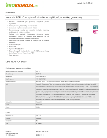 Izabelin 2017-03-02 Karta produktu: Notatnik SIGEL Conceptum® okładka w prążki, A6, w kratkę, granatowy Notatnik Conceptum® jest gwarancją najwyższej jakości wykonania Atrakcyjna kolorystyka nadaje nowoczesności Luksusowe, prążkowane wykończenie okładki Zaprojektowany z myślą, aby wszystkie niezbędne materiały znajdowały się w jednym miejscu Posiada dwie zakładki (wstążeczki), elastyczną gumkę zamykającą, miejsce na długopis oraz kieszonkę na 10 wizytówek lub inne karty o wymiarach 90x60mm Ilość kartek: 194 (papier chamois), w kratkę, w tym 20 kartek z perforacją Gramatura: 80gsm Format: A6 Wymiary: 95x150x20mm Otrzymał nagrodę "reddot design award" 2013 oraz nominację do konkursu "German Design Award" 2014 Kolor granatowy Cena 45,98 PLN brutto Podstawowe parametry produktu Numer produktu w systemie 19775 Nr dostawcy SCO566 Nr Celcen 2376-00019-22 Kod kreskowy 4004360857157 Nazwa produktu Notatnik SIGEL Conceptum® okładka w prążki, A6, w kratkę, granatowy Opis Notatnik Conceptum® jest gwarancją najwyższej jakości wykonania; atrakcyjna kolorystyka nadaje nowoczesności; luksusowe, prążkowane wykończenie okładki; zaprojektowany z myślą, aby wszystkie niezbędne materiały znajdowały się w jednym miejscu; posiada dwie zakładki (wstążeczki), elastyczną gumkę zamykającą, miejsce na długopis oraz kieszonkę na 10 wizytówek lub inne karty o wymiarach 90x60mm; ilość kartek: 194 (papier chamois), w kratkę, w tym 20 kartek z perforacją; gramatura: 80gsm; format: A6; wymiary: 95x150x20mm; otrzymał nagrodę "reddot design award" 2013 oraz nominację do konkursu "German Design Award" 2014; kolor granatowy Kategoria Notatniki Klasa Premium Marka SIGEL Cecha W ofercie od 2013-10 Produkt Notatnik Kieszenie B.d. Typ W kratkę Eko biuro ul Krasińskiego 23a 05-080 Izabelin NIP: 527-000-75-75 22 864 54 84 Izabelin 2017-03-02 Karta katalogowa produktu cd. Notatnik SIGEL Conceptum® okładka w prążki, A6, w kratkę, granatowy Materiał Papier Wymiary Format A6 Wymiary (mm) 95x150x20 Gramatura (g/m2) 80 Ilość Ilość kartek 194 Wspólny słownik zamówień CPV 22815000-6 Notatniki Certyfikaty Hit Hit Nowy produkt w ofercie Standard Kolor Kolor Granatowy Pozostałe zdjęcia produktu Serdecznie zapraszamy do współpracy Eko biuro zespół. Eko biuro ul Krasińskiego 23a 05-080 Izabelin NIP: 527-000-75-75 22 864 54 84