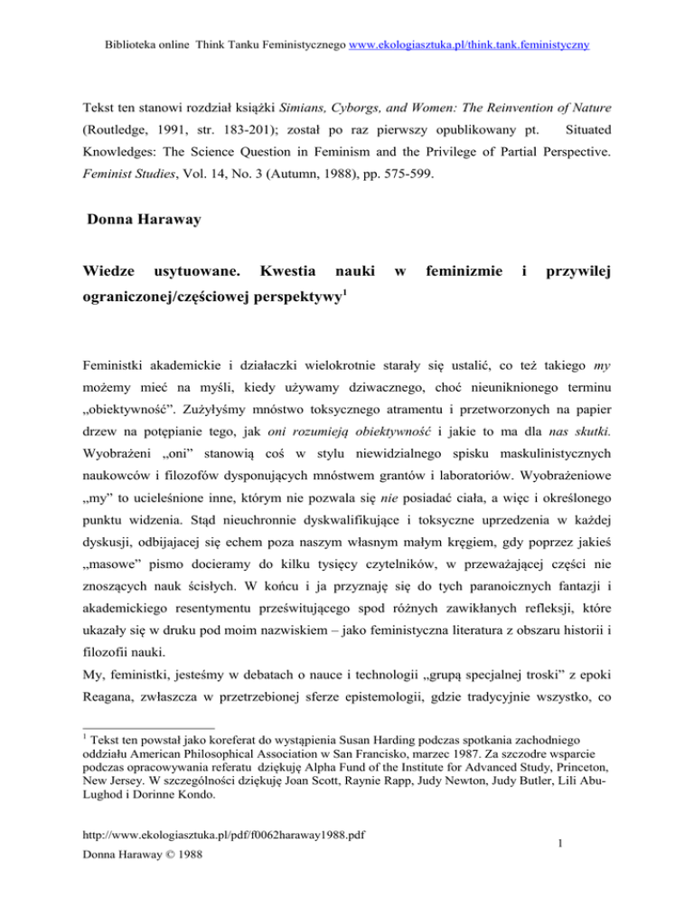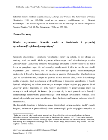 Biblioteka online Think Tanku Feministycznego www.ekologiasztuka.pl/think.tank.feministyczny Tekst ten stanowi rozdział książki Simians, Cyborgs, and Women: The Reinvention of Nature (Routledge, 1991, str. 183-201); został po raz pierwszy opublikowany pt. Situated Knowledges: The Science Question in Feminism and the Privilege of Partial Perspective. Feminist Studies, Vol. 14, No. 3 (Autumn, 1988), pp. 575-599. Donna Haraway Wiedze usytuowane. Kwestia nauki w feminizmie i przywilej ograniczonej/częściowej perspektywy1 Feministki akademickie i działaczki wielokrotnie starały się ustalić, co też takiego my możemy mieć na myśli, kiedy używamy dziwacznego, choć nieuniknionego terminu „obiektywność”. Zużyłyśmy mnóstwo toksycznego atramentu i przetworzonych na papier drzew na potępianie tego, jak oni rozumieją obiektywność i jakie to ma dla nas skutki. Wyobrażeni „oni” stanowią coś w stylu niewidzialnego spisku maskulinistycznych naukowców i filozofów dysponujących mnóstwem grantów i laboratoriów. Wyobrażeniowe „my” to ucieleśnione inne, którym nie pozwala się nie posiadać ciała, a więc i określonego punktu widzenia. Stąd nieuchronnie dyskwalifikujące i toksyczne uprzedzenia w każdej dyskusji, odbijajacej się echem poza naszym własnym małym kręgiem, gdy poprzez jakieś „masowe” pismo docieramy do kilku tysięcy czytelników, w przeważającej części nie znoszących nauk ścisłych. W końcu i ja przyznaję się do tych paranoicznych fantazji i akademickiego resentymentu prześwitującego spod różnych zawikłanych refleksji, które ukazały się w druku pod moim nazwiskiem – jako feministyczna literatura z obszaru historii i filozofii nauki. My, feministki, jesteśmy w debatach o nauce i technologii „grupą specjalnej troski” z epoki Reagana, zwłaszcza w przetrzebionej sferze epistemologii, gdzie tradycyjnie wszystko, co 1 Tekst ten powstał jako koreferat do wystąpienia Susan Harding podczas spotkania zachodniego oddziału American Philosophical Association w San Francisko, marzec 1987. Za szczodre wsparcie podczas opracowywania referatu dziękuję Alpha Fund of the Institute for Advanced Study, Princeton, New Jersey. W szczególności dziękuję Joan Scott, Raynie Rapp, Judy Newton, Judy Butler, Lili AbuLughod i Dorinne Kondo. http://www.ekologiasztuka.pl/pdf/f0062haraway1988.pdf Donna Haraway © 1988 1 Biblioteka online Think Tanku Feministycznego www.ekologiasztuka.pl/think.tank.feministyczny liczy się jako wiedza, nadzorowane jest przez filozofów opracowujących kanoniczne prawa poznawcze. Oczywiście grupa specjalnej troski to – korzystając z parareaganowskiej definicji – jakikolwiek historyczny podmiot zbiorowy, który ośmiela się opierać nieskrywanemu atomizmowi hipermarketowego, postmodernistycznego i symulowanego medialnie obywatelstwa ery Gwiezdnych Wojen. Max Headroom nie ma ciała – a zatem jedynie on widzi wszystko w wielkim komunikacyjnym imperium Globalnej Sieci. Nic dziwnego, że Max ma raczej naiwne poczucie humoru i radośnie regresywną, preedypalną seksualność, jaką zwykliśmy sobie – niebezpieczny błąd – wyobrażać jako zarezerwowaną dla dożywotnich mieszkańców kobiecych, skolonizowanych ciał – ewentualnie też dla białych mężczyzn-hakerów, spędzających życie w elektronicznym odosobnieniu. Wydaje mi się, że w kwestii obiektywności feministki wybiórczo i elastycznie używały pewnej kuszącej dychotomii (albo obiektywizm, albo społeczny konstrukcjonizm) i znalazły się w pułapce między tymi dwoma biegunami. Z całą pewnością mogę tu mówić o sobie, a sądzę, że dotyczy to również całego zbioru uczestniczących w tej debacie osób. Z jednej strony, najnowsze studia społeczne nad nauką i technologią umożliwiły wysunięcie mocnego argumentu o społecznej konstrukcji wszelkich roszczeń do wiedzy, z całą pewnością i w pierwszym rzędzie wiedzy naukowej.2 Ten kuszący pogląd mówi, iż żadna wewnętrzna perspektywa nie jest bardziej uprzywilejowana niż inne, gdyż w tej teorii zakreślanie granic wnętrza/zewnętrza wiedzy stanowi ruch władzy, a nie ruch w kierunku prawdy. A więc, z perspektywy mocnego konstrukcjonizmu społecznego – dlaczego mielibyśmy dawać się onieśmielić przez opisy działań i osiągnięć naukowców? I oni, i ich patroni mają dużo do zyskania przez mydlenie nam oczu. W ramach inicjacji opowiadają studentom pierwszych lat bajki o obiektywności i metodzie naukowej, ale żaden praktyk wysokiej sztuki naukowej nie 2 Por. np.: K. Knorr-Cetina, M. Mulkay, Science Observed: Perspectives on the Social Study of Science, Sage 1983; W. B. Blijker i in. (red.), The Social Construction of Technoological Systems, MIT Press, Cambridge 1987; oraz zwłaszcza B. Latour, Les Microbes: guerre et paix, suivi de Irréductions, A.-M. Métaillé, Paris 1984; oraz tłumaczenie angielskie: The Pasteurization of France, tłum. A. Sheridan et J. Law, Harvard University Press, Cambridge Mass. 1988. Latour, wykorzystując ustalenia Michela Tourniera z książki Vendredi (Gallimard, Paris 1967), przeprowadza błyskotliwą, aforystyczną polemikę przeciwko wszelkim formom redukcjonizmu, niezwykle użyteczną z feministycznego punktu widzenia: „Nie ufajcie czystości – to witriol dla duszy” (B. Latour, 1984, s. 171). Poza tym ustępem Latour nie jest teoretykiem feministycznym, ale mógłby zostać tak odczytany z perspektywy równie przewrotnej, z jakiej on sam odczytuje laboratorium – wielką machinę do robienia znaczących pomyłek szybciej niż ktokolwiek inny, dzięki czemu zyskać można władzę zmieniającą świat. Dla Latoura laboratorium stanowi taśmowy przemysł epistemologiczny, gdzie fakty mogą się przemieszczać jedynie po szynach prowadzących na zewnątrz. Kto kontroluje szyny, kontroluje całe okoliczne terytorium. Jak mogliśmy zapomnieć? Ale dziś potrzebujemy sieci satelitarnych bardziej niż bankrut