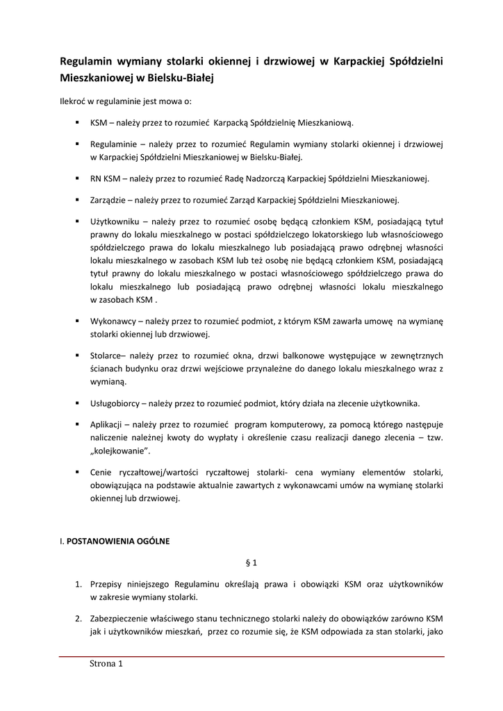 Regulamin wymiany stolarki okiennej i drzwiowej w Karpackiej Spółdzielni Mieszkaniowej w Bielsku-Białej Ilekroć w regulaminie jest mowa o: KSM – należy przez to rozumieć Karpacką Spółdzielnię Mieszkaniową. Regulaminie – należy przez to rozumieć Regulamin wymiany stolarki okiennej i drzwiowej w Karpackiej Spółdzielni Mieszkaniowej w Bielsku-Białej. RN KSM – należy przez to rozumieć Radę Nadzorczą Karpackiej Spółdzielni Mieszkaniowej. Zarządzie – należy przez to rozumieć Zarząd Karpackiej Spółdzielni Mieszkaniowej. Użytkowniku – należy przez to rozumieć osobę będącą członkiem KSM, posiadającą tytuł prawny do lokalu mieszkalnego w postaci spółdzielczego lokatorskiego lub własnościowego spółdzielczego prawa do lokalu mieszkalnego lub posiadającą prawo odrębnej własności lokalu mieszkalnego w zasobach KSM lub też osobę nie będącą członkiem KSM, posiadającą tytuł prawny do lokalu mieszkalnego w postaci własnościowego spółdzielczego prawa do lokalu mieszkalnego lub posiadającą prawo odrębnej własności lokalu mieszkalnego w zasobach KSM . Wykonawcy – należy przez to rozumieć podmiot, z którym KSM zawarła umowę na wymianę stolarki okiennej lub drzwiowej. Stolarce– należy przez to rozumieć okna, drzwi balkonowe występujące w zewnętrznych ścianach budynku oraz drzwi wejściowe przynależne do danego lokalu mieszkalnego wraz z wymianą. Usługobiorcy – należy przez to rozumieć podmiot, który działa na zlecenie użytkownika. Aplikacji – należy przez to rozumieć program komputerowy, za pomocą którego następuje naliczenie należnej kwoty do wypłaty i określenie czasu realizacji danego zlecenia – tzw. „kolejkowanie”. Cenie ryczałtowej/wartości ryczałtowej stolarki- cena wymiany elementów stolarki, obowiązująca na podstawie aktualnie zawartych z wykonawcami umów na wymianę stolarki okiennej lub drzwiowej. I. POSTANOWIENIA OGÓLNE §1 1. Przepisy niniejszego Regulaminu określają prawa i obowiązki KSM oraz użytkowników w zakresie wymiany stolarki. 2. Zabezpieczenie właściwego stanu technicznego stolarki należy do obowiązków zarówno KSM jak i użytkowników mieszkań, przez co rozumie się, że KSM odpowiada za stan stolarki, jako Strona 1 części składowej budynku, a Użytkownicy lokalu odpowiadają za prawidłową eksploatację, szczelność i estetykę stolarki. §2 1. Dofinansowanie wymiany stolarki dokonuje się w zasobach KSM w ramach wydatków finansowanych z funduszu remontowego KSM, w ramach corocznego limitu ustalanego przez RN KSM na wniosek Zarządu (wysokość limitu określona w planie gospodarczym na dany rok). 2. Wysokość limitu, określonego na podstawie ust.1, może ulec zmianie po przedstawieniu przez Zarząd i zatwierdzeniu przez RN KSM zmiany planu gospodarczego na dany rok. 3. Dofinansowaniu podlega wymiana stolarki tylko w lokalu mieszkalnym znajdującym się w zasobach KSM, należącym do Użytkownika. §3 1. Stolarka może być wymieniona zgodnie z postanowieniami niniejszego Regulaminu: 1.1 przez KSM na wniosek Użytkownika, 1.2 przez Użytkownika za zgodą KSM. 2. Wymiana stolarki, o której mowa w ust.1 możliwa jest jedynie pod warunkiem posiadania wymaganych atestów na stolarkę, i zachowania dotychczasowych gabarytów, podziałów kwater i kolorystyki oraz wyposażenia okien w nawiewniki – dobór ilości i rodzaju nawiewników należy skonsultować z działem techniczno- inwestycyjnym i uzyskać pisemną akceptację w tym zakresie. 2.1 okna, drzwi balkonowe występujące w zewnętrznych ścianach budynku – kolor biały. Wyjątkiem jest sytuacja, kiedy wcześniej wymienione okna w danym lokalu są w kolorze innym niż biały i w kosztach ich wymiany uczestniczyła już Spółdzielnia. 2.2 drzwi wejściowe do lokalu mieszkalnego – kolor biały lub brązowy. 2.3 okna muszą być wyposażone w nawiewniki, w zaakceptowanej przez Spółdzielnię ilości i rodzaju. 3. Do rozliczeń kosztów wymiany stolarki przyjmuje się jako standard : 3.1 okna, drzwi balkonowe występujące w zewnętrznych ścianach budynku – wykonanie w technologii z PCV lub drewna z funkcją rozszczelniania, 3.2 wraz z wymianą okna jest konieczna wymiana parapetu zewnętrznego, 3.3 drzwi wejściowe do lokalu mieszkalnego – wykonanie w technologii z drewna, lub metalowe z powłoką drewnopodobną (antywłamaniowe), Strona 2 3.4 wraz z wymianą okien i drzwi balkonowych, niezbędne jest uzupełnienie wyprawy tynkarskiej ościeży zewnętrznych wraz z malowaniem – dostosowanie do istniejącej kolorystyki, 3.5 wraz z wymianą drzwi wejściowych do mieszkania, niezbędne jest uzupełnienie wyprawy ościeży drzwiowych wraz z malowaniem, od strony klatki schodowej, korytarza, galerii, dostosowanie do istniejącej kolorystyki. 4. Standard stolarki określonej w ust.3 dotyczy wszystkich wniosków, związanych z dofinansowaniem, a skierowanych do KSM po wejściu w życie niniejszego Regulaminu. 5. Jakiekolwiek zmiany i odstępstwa od ustaleń z ust. 2 i 3 wymagają pisemnej zgody KSM. 6. Zarząd może odmówić dofinansowania kosztów związanych z wymianą stolarki, jeżeli nie spełnione są wymogi określone w ust.2 i 3. 7. Kolejność realizacji wymian i dofinansowania jest zależna od dat wniosków kwalifikujących, przy czym wymiany zakwalifikowane jako tryb awaryjny podlegają realizacji poza kolejnością. §4 1. Zwrot należności za stolarkę, wymienioną we własnym zakresie przez Użytkownika, przysługuje temu Użytkownikowi lub spadkobiercom Użytkownika, posiadającym tytuł prawny do lokalu mieszkalnego, stanowiącego masę spadkową w terminie zwrotu należności. 2. Zwrot należności za stolarkę przysługuje w wysokości 20% w przypadku zbycia lokalu mieszkalnego przez Użytkownika, który poniósł koszt wymiany, w szczególności poprzez darowiznę, sprzedaż lub zamianę przed terminem zwrotu należności, z zastrzeżeniem ust. 3, przy spełnieniu w