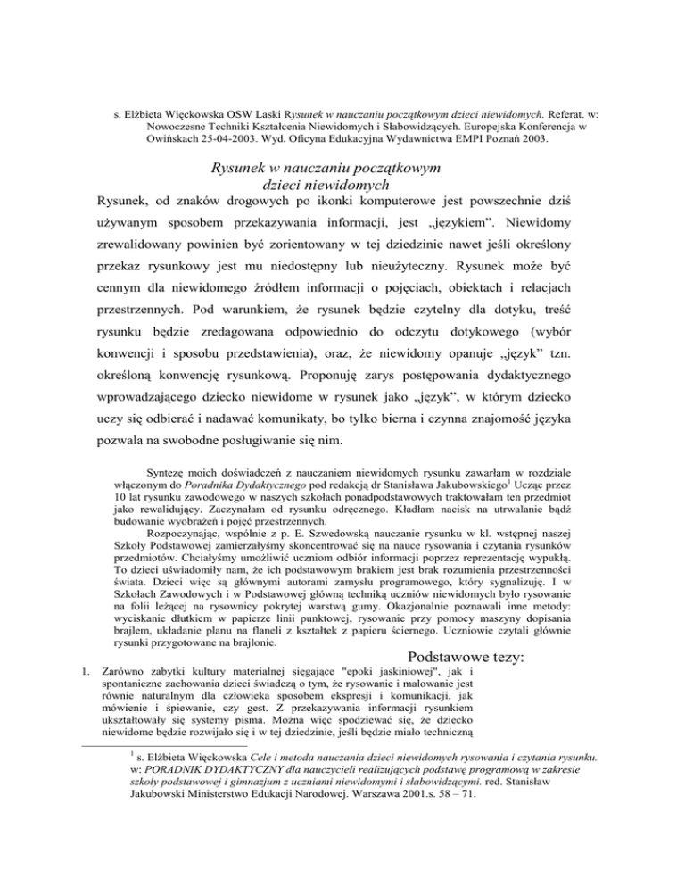 s. ElŜbieta Więckowska OSW Laski Rysunek w nauczaniu początkowym dzieci niewidomych. Referat. w: Nowoczesne Techniki Kształcenia Niewidomych i Słabowidzących. Europejska Konferencja w Owińskach 25-04-2003. Wyd. Oficyna Edukacyjna Wydawnictwa EMPI Poznań 2003. Rysunek w nauczaniu początkowym dzieci niewidomych Rysunek, od znaków drogowych po ikonki komputerowe jest powszechnie dziś uŜywanym sposobem przekazywania informacji, jest „językiem”. Niewidomy zrewalidowany powinien być zorientowany w tej dziedzinie nawet jeśli określony przekaz rysunkowy jest mu niedostępny lub nieuŜyteczny. Rysunek moŜe być cennym dla niewidomego źródłem informacji o pojęciach, obiektach i relacjach przestrzennych. Pod warunkiem, Ŝe rysunek będzie czytelny dla dotyku, treść rysunku będzie zredagowana odpowiednio do odczytu dotykowego (wybór konwencji i sposobu przedstawienia), oraz, Ŝe niewidomy opanuje „język” tzn. określoną konwencję rysunkową. Proponuję zarys postępowania dydaktycznego wprowadzającego dziecko niewidome w rysunek jako „język”, w którym dziecko uczy się odbierać i nadawać komunikaty, bo tylko bierna i czynna znajomość języka pozwala na swobodne posługiwanie się nim. Syntezę moich doświadczeń z nauczaniem niewidomych rysunku zawarłam w rozdziale włączonym do Poradnika Dydaktycznego pod redakcją dr Stanisława Jakubowskiego1 Ucząc przez 10 lat rysunku zawodowego w naszych szkołach ponadpodstawowych traktowałam ten przedmiot jako rewalidujący. Zaczynałam od rysunku odręcznego. Kładłam nacisk na utrwalanie bądź budowanie wyobraŜeń i pojęć przestrzennych. Rozpoczynając, wspólnie z p. E. Szwedowską nauczanie rysunku w kl. wstępnej naszej Szkoły Podstawowej zamierzałyśmy skoncentrować się na nauce rysowania i czytania rysunków przedmiotów. Chciałyśmy umoŜliwić uczniom odbiór informacji poprzez reprezentację wypukłą. To dzieci uświadomiły nam, Ŝe ich podstawowym brakiem jest brak rozumienia przestrzenności świata. Dzieci więc są głównymi autorami zamysłu programowego, który sygnalizuję. I w Szkołach Zawodowych i w Podstawowej główną techniką uczniów niewidomych było rysowanie na folii leŜącej na rysownicy pokrytej warstwą gumy. Okazjonalnie poznawali inne metody: wyciskanie dłutkiem w papierze linii punktowej, rysowanie przy pomocy maszyny dopisania brajlem, układanie planu na flaneli z kształtek z papieru ściernego. Uczniowie czytali głównie rysunki przygotowane na brajlonie. Podstawowe tezy: 1. Zarówno zabytki kultury materialnej sięgające "epoki jaskiniowej", jak i spontaniczne zachowania dzieci świadczą o tym, Ŝe rysowanie i malowanie jest równie naturalnym dla człowieka sposobem ekspresji i komunikacji, jak mówienie i śpiewanie, czy gest. Z przekazywania informacji rysunkiem ukształtowały się systemy pisma. MoŜna więc spodziewać się, Ŝe dziecko niewidome będzie rozwijało się i w tej dziedzinie, jeśli będzie miało techniczną 1 s. ElŜbieta Więckowska Cele i metoda nauczania dzieci niewidomych rysowania i czytania rysunku. w: PORADNIK DYDAKTYCZNY dla nauczycieli realizujących podstawę programową w zakresie szkoły podstawowej i gimnazjum z uczniami niewidomymi i słabowidzącymi. red. Stanisław Jakubowski Ministerstwo Edukacji Narodowej. Warszawa 2001.s. 58 – 71. 2. - - - moŜliwość rysowania i kontrolowania swej pracy dotykiem. Rozwój ten będzie prawidłowy, jeśli dziecko będzie miało moŜliwość i rysowania i czytania prawidłowo zredagowanych reprezentacji dotykowych. Dzieci, które uczyłam chętnie podejmowały rysowanie, ceniły sobie nie tylko zajęcia kierowane przez nauczycielki. Najcenniejszą nagrodą za dobre wykonanie zadania było pozwolenie na rysunek dowolny. Starannie zachowałam rysunek będący spontanicznie narysowaną ilustracją do pełnego ekspresji opowiadania o wycieczce „szukamy wiosny”. Nasza młoda pani Psycholog ceni sobie rysunek gdyŜ niejednokrotnie prośba o narysowanie pozwala jej nawiązać kontakt z dzieckiem zamkniętym. Dziecko zaczyna rysować, potem zaczyna opowiadać swój rysunek – zaczyna się rozmowa. Umiejętność czytania rysunku była niejednokrotnie przedmiotem badań i nauczania.2. Dotykowe czytanie rysunku jest działaniem złoŜonym i trudnym. Niewidomy nie tyle ogląda rysunek, co czyta go. Jeśli juŜ umie czytać rysunki, to stopniowo czytając rysunek rozpoznaje jego zasadniczy kształt oraz zaczyna rozumieć, jaki kształt przestrzenny przedstawiony został na dwuwymiarowym rysunkuWe “Wnioskach i zaleceniach Międzynarodowej Konferencji n.t. Rysunku Wypukłego dla Niewidomych” (25 –27 kwietnia 1984, Berlin) czytamy: “1.1 Relief jako specyficzny rysunek dla ludzi niewidomych jest waŜnym środkiem informacji o otaczającej rzeczywistości przyrodniczej, społecznej, technicznej, podobnie jak słowo mówione i brajl jest dobrym opisem naturalnych przedmiotów i modeli. Rysunki wypukłe dobrze słuŜą powiększaniu wiedzy ludzi niewidomych...” 3 A więc pierwszy wniosek: Nauczanie rysunku tzn. rysowania i czytania rysunku jako jednej z technik pracy szkolnej powinno być wkomponowane w program nauczania w odpowiednich działach i przedmiotach jak nauczanie początkowe, orientacja przestrzenna, matematyka, plastyka, nauka o przyrodzie, historia lub inne. RozwaŜając rysunek jako "język", czyli sposób przekazywania informacji trzeba zauwaŜyć, Ŝe: pełna znajomość języka ojczystego, obcego, lub innego sposobu przekazywania informacji to znajomość bierna i czynna. Tylko ten naprawdę rozumie język, kto umie nim mówić. Uczenie więc czytania rysunku i rysowania powinno przebiegać równolegle, choć nie synchronicznie; w rozwoju mowy dziecka słyszącego etap mówienia, czyli przekazywania informacji poprzedzony jest etapem gaworzenia, kiedy dziecko bawi się wydawaniem dźwięków i trenuje tę umiejętność, ale nie nadaje dźwiękom znaczeń. Podobnie