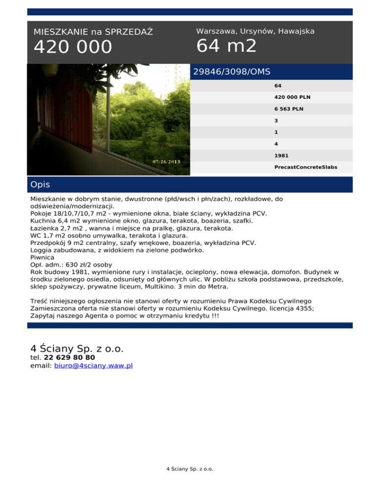 MIESZKANIE na SPRZEDAŻ 420 000 Warszawa, Ursynów, Hawajska 64 m2 29846/3098/OMS 64 420 000 PLN 6 563 PLN 3 1 4 1981 PrecastConcreteSlabs Opis Mieszkanie w dobrym stanie, dwustronne (płd/wsch i płn/zach), rozkładowe, do odświeżenia/modernizacji. Pokoje 18/10,7/10,7 m2 - wymienione okna, białe ściany, wykładzina PCV. Kuchnia 6,4 m2 wymienione okno, glazura, terakota, boazeria, szafki. Łazienka 2,7 m2 , wanna i miejsce na pralkę, glazura, terakota. WC 1,7 m2 osobno umywalka, terakota i glazura. Przedpokój 9 m2 centralny, szafy wnękowe, boazeria, wykładzina PCV. Loggia zabudowana, z widokiem na zielone podwórko. Piwnica Opł. adm.: 630 zł/2 osoby Rok budowy 1981, wymienione rury i instalacje, ocieplony, nowa elewacja, domofon. Budynek w środku zielonego osiedla, odsunięty od głównych ulic. W pobliżu szkoła podstawowa, przedszkole, sklep spożywczy, prywatne liceum, Multikino. 3 min do Metra. Treść niniejszego ogłoszenia nie stanowi oferty w rozumieniu Prawa Kodeksu Cywilnego Zamieszczona oferta nie stanowi oferty w rozumieniu Kodeksu Cywilnego. licencja 4355; Zapytaj naszego Agenta o pomoc w otrzymaniu kredytu !!! 4 Ściany Sp. z o.o. tel. 22 629 80 80 email: [email protected] 4 Ściany Sp. z o.o. Powered by TCPDF (www.tcpdf.org)