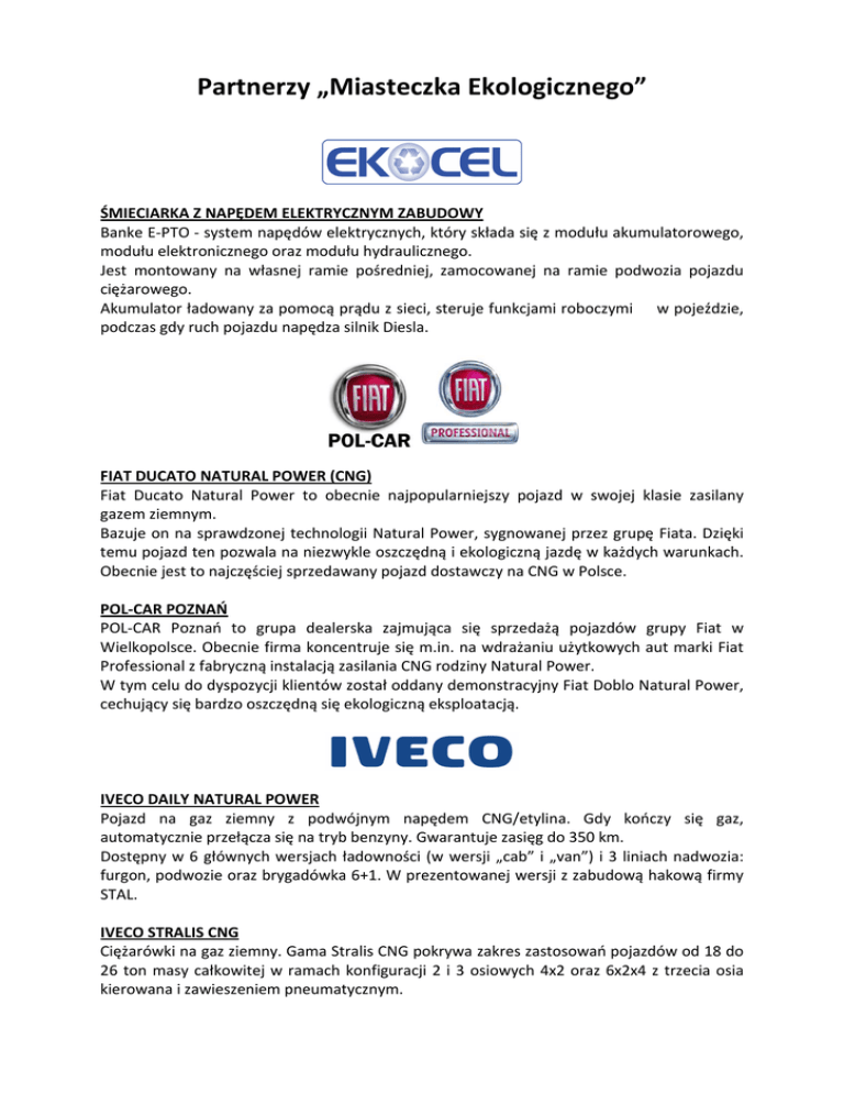 Partnerzy „Miasteczka Ekologicznego” ŚMIECIARKA Z NAPĘDEM ELEKTRYCZNYM ZABUDOWY Banke E-PTO - system napędów elektrycznych, który składa się z modułu akumulatorowego, modułu elektronicznego oraz modułu hydraulicznego. Jest montowany na własnej ramie pośredniej, zamocowanej na ramie podwozia pojazdu ciężarowego. Akumulator ładowany za pomocą prądu z sieci, steruje funkcjami roboczymi w pojeździe, podczas gdy ruch pojazdu napędza silnik Diesla. FIAT DUCATO NATURAL POWER (CNG) Fiat Ducato Natural Power to obecnie najpopularniejszy pojazd w swojej klasie zasilany gazem ziemnym. Bazuje on na sprawdzonej technologii Natural Power, sygnowanej przez grupę Fiata. Dzięki temu pojazd ten pozwala na niezwykle oszczędną i ekologiczną jazdę w każdych warunkach. Obecnie jest to najczęściej sprzedawany pojazd dostawczy na CNG w Polsce. POL-CAR POZNAŃ POL-CAR Poznań to grupa dealerska zajmująca się sprzedażą pojazdów grupy Fiat w Wielkopolsce. Obecnie firma koncentruje się m.in. na wdrażaniu użytkowych aut marki Fiat Professional z fabryczną instalacją zasilania CNG rodziny Natural Power. W tym celu do dyspozycji klientów został oddany demonstracyjny Fiat Doblo Natural Power, cechujący się bardzo oszczędną się ekologiczną eksploatacją. IVECO DAILY NATURAL POWER Pojazd na gaz ziemny z podwójnym napędem CNG/etylina. Gdy kończy się gaz, automatycznie przełącza się na tryb benzyny. Gwarantuje zasięg do 350 km. Dostępny w 6 głównych wersjach ładowności (w wersji „cab” i „van”) i 3 liniach nadwozia: furgon, podwozie oraz brygadówka 6+1. W prezentowanej wersji z zabudową hakową firmy STAL. IVECO STRALIS CNG Ciężarówki na gaz ziemny. Gama Stralis CNG pokrywa zakres zastosowań pojazdów od 18 do 26 ton masy całkowitej w ramach konfiguracji 2 i 3 osiowych 4x2 oraz 6x2x4 z trzecia osia kierowana i zawieszeniem pneumatycznym. IVECO EURO CARGO CNG Ciężarówka na gaz ziemny, głównie dla przewozów średniotonażowych oraz branży komunalnej. Łatwo się ją prowadzi, nawet w centrach miast dzięki kabinie o zwartej budowie i bardzo dużemu kątowi skrętu. Zasięg pracy na pełnej pojemności butli: 400-450km. Na wystawie pojazd prezentowany z zabudowa hakową firmy HYVA. ŁAWKI I KOSZE WYKONANE Z DREWNA TROPIKALNEGO Ich drewniane elementy wyprodukowane są z bardzo wytrzymałego drewna egzotycznego. Powierzchnie elementów metalowych otrzymały specjalne wykończenie, wyjątkowo odporne na trudne warunki atmosferyczne, jak deszcz, słońce, mróz, śnieg itd. Produkty są intensywnie testowane, m.in. w regionach nadmorskich. MERCEDES - BENZ SPRINTER NGT (CNG) Mercedes Sprinter NGT to ekologiczny i oszczędny pojazd dostawczy zasilany gazem ziemnym (CNG). Doskonale sprawdza się w środowisku miejskim, jak i na dłuższych trasach. Dzięki fabrycznej instalacji zasilania metanem właściciel może pokonać do 400 kilometrów na gazie, jednocześnie ciesząc się bardzo oszczędną jazdą. Swoich atutów Sprinter NGT dowiódł w prestiżowym Rajdzie Blue Corridor 2012. MB - POZNAŃ MB-Poznań to autoryzowany dealer użytkowych pojazdów marki Mercedes-Benz. W swojej ofercie posiada ekologiczne i oszczędne pojazdy zasilane sprężonym gazem ziemnym – dostawcze auto Sprinter NGT oraz ciągnik siodłowy Econic NGT. Oba gazowe modele znajdują się w parku demonstracyjne pojazdów dealera. W 2012 roku MB-Poznań aktywnie włączył się w organizację prestiżowego rajdu Blue Corridor 2012. ELEKTRYCZNY SAMOCHÓD I SKUTER Renault Twizy – model miejskiego, dwuosobowego auta elektrycznego produkowany przez koncern Renault od 2012 r. Prędkość do 80 km/h, dystans - do 100 km. Skuter elektryczny firmy Vectrix – prędkość do 100km/h, zasięg na jednym ładowaniu - do 100 km. WOLNOSTOJĄCA KONSTRUKCJA DO MONTAŻU PANELI FOTOWOLTAICZNYCH Opatentowana ocynkowana konstrukcja stalowa z elementami ze stali nierdzewnej. System jednopodporowy wbijany do ziemi przygotowany do montażu paneli fotowoltaicznych monokrystalicznych i polikrystalicznych. Konstrukcja została wykorzystana m. in.: przy budowie jednej z największych w Europie farm fotowoltaicznych o mocy 38 MW znajdującej się w Bautzen. WIATA GARAŻOWA ZE STACJĄ ŁADUJĄCĄ Wiata o wysokości: 4 m., szerokości: 5,25 m. i długości: 6,10 m., pod którą stoi stacja ładująca dla pojazdów elektrycznych fotowoltaiczne o mocy ok. 3,6 kW. SYSTEMY DO MONTAŻU PANELI FOTOWOLTAICZNYCH NA DACHACH ORAZ KONSTRUKCJE WYKORZYSTYWANE DO BUDOWY ELEKTROWNI SŁONECZNYCH Systemy montażu na dachy o różnym pokryciu (dachówki, blacha, papa), mała waga, duża wytrzymałość, łatwy i szybki montaż. Wykonane ze stopów aluminium oraz ze stali nierdzewnej. Konstrukcje wolnostojące dostosowane do różnego rodzaju podłoży, zbudowane ze stalowych elementów cynkowanych ogniowo, jak również z wykorzystaniem profili aluminiowych. COMPOSTAINER DWUKÓŁKOWE POJEMNIKI TYP GMT Intensywne napowietrzanie bio-odpadów podczas zbierania dzięki użebrowaniu, rusztowi ociekowemu oraz otworom wentylacyjnym na ścianach bocznych i w klapie pojemnika. Zapobieganie przedostawaniu się odpadów atmosferycznych do wnętrza dzięki daszkowi nad otworami wentylacyjnymi w klapie. DWUKÓŁKOWE POJEMNIKI TYP: GMT 120L wyciszenie otwierania pojemnika dzięki specjalnej konstrukcji klapy, stabilne mocowanie klapy, wysoka odporność mechaniczna, niezmienna barwa pojemników przez wiele lat dzięki domieszkom substancji uodparniających na działanie promieni UV. POJEMNIKI DEPOTCONTAINER GRUMBACH Przeznaczone są do centralnej zbiórki surowców wtórnych. Dzięki systemowi Grumbach można rozładować 20 pojemników w ciągu godziny (standardowo 12 szt/h). Możliwość obsługi poprzez jedna osobę, zwiększona ognioodporność i trwałość, możliwość zastosowania 2 lub 3 komór opróżnianych osobno, możliwość zbiórki odpadów nocą poprzez system wyciszenia hałasów. STOWARZYSZENIE NGV POLSKA Stowarzysze