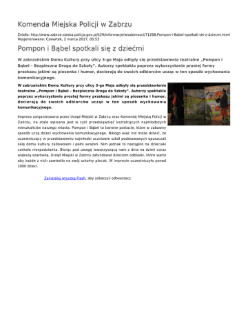 Komenda Miejska Policji w Zabrzu Źródło: http://www.zabrze.slaska.policja.gov.pl/k29/informacje/wiadomosci/71268,Pompon-i-Babel-spotkali-sie-z-dziecmi.html Wygenerowano: Czwartek, 2 marca 2017, 05:53 Pompon i Bąbel spotkali się z dziećmi W zabrzańskim Domu Kultury przy ulicy 3-go Maja odbyły się przedstawienia teatralne „Pompon i Bąbel – Bezpieczna Droga do Szkoły”. Autorzy spektaklu poprzez wykorzystanie prostej formy przekazu jakimi są piosenka i humor, docierają do swoich odbiorców ucząc w ten sposób wychowania komunikacyjnego. W zabrzańskim Domu Kultury przy ulicy 3-go Maja odbyły się przedstawienia teatralne „Pompon i Bąbel – Bezpieczna Droga do Szkoły”. Autorzy spektaklu poprzez wykorzystanie prostej formy przekazu jakimi są piosenka i humor, docierają do swoich odbiorców ucząc w ten sposób wychowania komunikacyjnego. Impreza zorganizowana przez Urząd Miejski w Zabrzu oraz Komendę Miejską Policji w Zabrzu, na stałe wpisana jest w cykl przedsięwzięć kształcących najmłodszych mieszkańców naszego miasta. Pompon i Bąbel to barwne postacie, które w zabawny sposób uczą dzieci wychowania komunikacyjnego. Nikogo więc nie może dziwić, że uczestniczący w przedstawieniu najmłodsi uczniowie szkół podstawowych opuszczali salę domu kultury zadowoleni i pełni wrażeń. Nim jednak to nastąpiło na dzieciaki czekała niespodzianka. Biorąc pod uwagę towarzyszącą nam z dnia na dzień coraz większą szarówkę, Urząd Miejski w Zabrzu zafundował dzieciom odblaski, które warto aby każde z nich zawiesiło na swój szkolny plecak. W imprezie uczestniczyło ponad 1000 dzieci. Zainstaluj wtyczkę Flash, aby zobaczyć odtwarzacz. pobierz film - 3.4 MB Ocena: 0/5 (0) Tweetnij