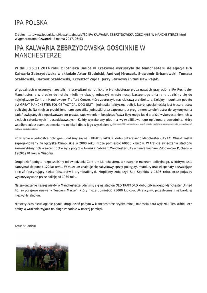 IPA POLSKA Źródło: http://www.ipapolska.pl/ipa/aktualnosci/750,IPA-KALWARIA-ZEBRZYDOWSKA-GOSCINNIE-W-MANCHESTERZE.html Wygenerowano: Czwartek, 2 marca 2017, 05:53 IPA KALWARIA ZEBRZYDOWSKA GOŚCINNIE W MANCHESTERZE W dniu 26.11.2014 roku z lotniska Balice w Krakowie wyruszyła do Manchesteru delegacja IPA Kalwaria Zebrzydowska w składzie Artur Studnicki, Andrzej Mruczek, Sławomir Urbanowski, Tomasz Szabłowski, Bartosz Szabłowski, Krzysztof Zajda, Jerzy Stawowy i Stanisław Pająk. W godzinach wieczornych zostaliśmy przywitani na lotnisku w Manchesterze przez naszych przyjaciół z IPA RochdaleManchester, a w drodze do hotelu mieliśmy okazję zobaczyć miasto nocą. Następnego dnia rano udaliśmy się do największego Centrum Handlowego- Trafford Centre, które zauroczyło nas ciekawą architekturą. Kolejnym punktem pobytu był GREAT MANCHESTER POLICE TACTICAL DOG UNIT – jednostka taktyczna policji, której specjalnością jest tresura psów policyjnych. Na miejscu przybliżono nam specyfikę jednostki oraz zapoznano z programem szkoleń psów do wykonywania zadań związanych z egzekwowaniem prawa, zapewnieniem bezpieczeństwa fizycznego ludzi a także wykorzystaniem ich w akcjach ratunkowych i poszukiwawczych. Każdy wyszkolony pies ma wykwalifikowanego opiekuna-przewodnika, który współpracuje z psem, zapewnia mu opiekę i dba o jego wyszkolenie.. Informacje, które usłyszeliśmy od swoich kolegów z policji oraz pokaz umiejętności psów policyjnych zrobiły na nas duże wrażenie. Po wizycie w jednostce policyjnej udaliśmy się na ETIHAD STADION klubu piłkarskiego Manchester City FC. Obiekt został zaprojektowany na Igrzyska Olimpijskie w 2000 roku, może pomieścić 60000 kibiców. W trakcie zwiedzania stadionu zauważyliśmy polski akcent dotyczący potyczki Górnika Zabrze z Manchester City w finale Pucharu Zdobywców Pucharu w 1969/1970 roku w Wiedniu. Drugi dzień pobytu rozpoczęliśmy od zwiedzenia Centrum Manchesteru, a następnie muzeum policyjnego, w którym czas zatrzymał się ponad 120 lat temu. W muzeum znajduje się zabytkowy sprzęt policyjny, mundury oraz eksponaty pozwalające odkryć fascynujący świat fałszerstw i kryminalistyki. Mogliśmy zobaczyć Sąd Sędziów z 1895 roku, oraz pojazdy wykorzystywane przez policję od 1950 roku. Na zakończenie naszej wizyty w Manchesterze udaliśmy się na stadion OLD TRAFFORD klubu piłkarskiego Manchester United FC, zwyczajowo nazwany Teatrem Marzeń, który może pomieścić 75000 kibiców. Atrakcyjny, przestronny i najbardziej niezwykły stadion. Niestety czas nieubłaganie płynie, drugi dzień pobytu w Manchesterze szybko minął, nadeszła pora wyjazdu. Ten krótki, lecz obfity w wrażenia wyjazd na długo zapadnie w naszej pamięci. Artur Studnicki Ocena: 1/5 (1) Tweetnij