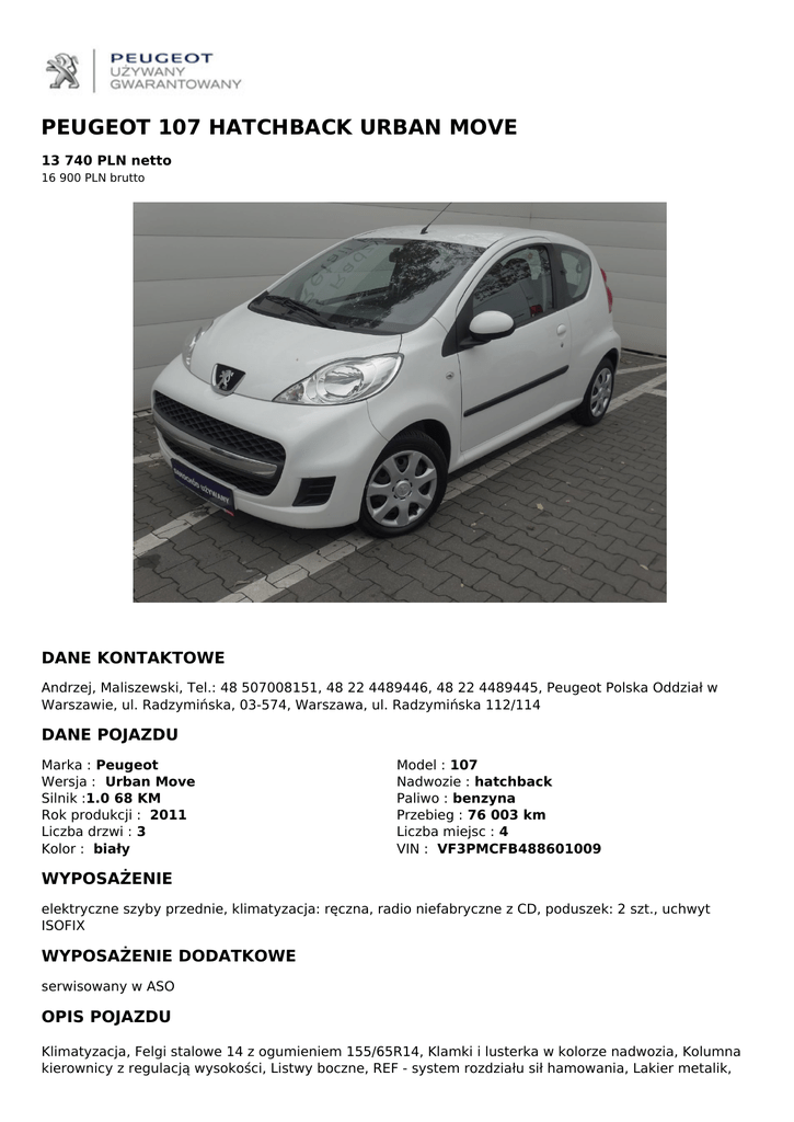 PEUGEOT 107 HATCHBACK URBAN MOVE 13 740 PLN netto 16 900 PLN brutto DANE KONTAKTOWE Andrzej, Maliszewski, Tel.: 48 507008151, 48 22 4489446, 48 22 4489445, Peugeot Polska Oddział w Warszawie, ul. Radzymińska, 03-574, Warszawa, ul. Radzymińska 112/114 DANE POJAZDU Marka : Peugeot Wersja : Urban Move Silnik :1.0 68 KM Rok produkcji : 2011 Liczba drzwi : 3 Kolor : biały Model : 107 Nadwozie : hatchback Paliwo : benzyna Przebieg : 76 003 km Liczba miejsc : 4 VIN : VF3PMCFB488601009 WYPOSAŻENIE elektryczne szyby przednie, klimatyzacja: ręczna, radio niefabryczne z CD, poduszek: 2 szt., uchwyt ISOFIX WYPOSAŻENIE DODATKOWE serwisowany w ASO OPIS POJAZDU Klimatyzacja, Felgi stalowe 14 z ogumieniem 155/65R14, Klamki i lusterka w kolorze nadwozia, Kolumna kierownicy z regulacją wysokości, Listwy boczne, REF - system rozdziału sił hamowania, Lakier metalik, Tapicerka materiałowa Stilada, Radio CD, Tylne oparcie składane, dzielone, Uchwyty ISOFIX do mocowania fotelika dziecięcego, Wspomaganie układu kierowniczego - progresywne, Wycieraczka szyby tylnej, CSC - system kontroli hamowania na zakrętach, Airbag kierowcy i pasażera, ABS, Zamek centralny z pilotem, Elektryczne podnoszenie szyb, przód Pierwszy właściciel, Pojazd regularnie serwisowany *Powyższa informacja nie stanowi oferty w myśl prawa handlowego (art. 66 § 1 k.c.), więcej informacji możecie Państwo uzyskać kontaktując się z naszym Działem Sprzedaży. *Samochód prezentowany na zdjęciu może różnić się od przedstawionego w opisie. QR CODE DLA OGŁOSZENIA W SERWISIE UZYWANYGWARANTOWANY.PL Powered by TCPDF (www.tcpdf.org)