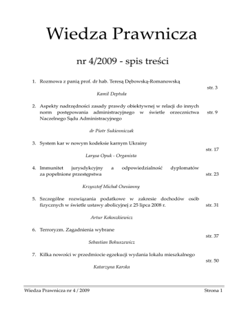 Wiedza Prawnicza nr 4/2009 - spis treści 1. Rozmowa z panią prof. dr hab. Teresą Dębowską-Romanowską str. 3 Kamil Deptuła 2. Aspekty nadrzędności zasady prawdy obiektywnej w relacji do innych norm postępowania administracyjnego w świetle orzecznictwa Naczelnego Sądu Administracyjnego str. 9 dr Piotr Sukienniczak 3. System kar w nowym kodeksie karnym Ukrainy str. 17 Larysa Opuk - Organista 4. Immunitet jurysdykcyjny za popełnione przestępstwa a odpowiedzialność dyplomatów str. 23 Krzysztof Michał Owsianny 5. Szczególne rozwiązania podatkowe w zakresie dochodów osób fizycznych w świetle ustawy abolicyjnej z 25 lipca 2008 r. str. 31 Artur Kokoszkiewicz 6. Terroryzm. Zagadnienia wybrane str. 37 Sebastian Bohuszewicz 7. Kilka nowości w przedmiocie egzekucji wydania lokalu mieszkalnego str. 50 Katarzyna Karska Wiedza Prawnicza nr 4 / 2009 Strona 1 REDAKCJA I WYDAWCA: 91-015 Łódź, ul. Gandhiego 20/29 REDAKTOR NACZELNY I WYDAWCA: Kamil Łukasz Deptuła (0-604959545) KIEROWNIK SEKCJI PUBLIKACJI: Magdalena Rzesiowska KIEROWNIK SEKCJI ORGANIZACYJNEJ: Weronika Drążkiewicz WSPÓŁPRACA: - Katarzyna Karska - Maciej Bratkowski - Szymon Drab - Mariusz Stobiecki MIEJSCE I DATA WYDANIA NUMERU 4/2009 : Łódź, 30 listopada 2009 DRUK: Centrum Nowoczesnej Poligrafii – Superdruki NUMER ISSN: 2080-4202 NUMER WPISU DO REJESTRU CZASOPISM: 1095 ADRES INTERNETOWY: www.wiedzaprawnicza.pl Wiedza Prawnicza nr 4 / 2009 Strona 2 Rozmowa z panią prof. dr hab. Teresą DębowskąRomanowską Kamil Deptuła we współpracy z Maciejem Bratkowskim ekspertem Sejmu i Senatu oraz Komisji Konstytucyjnej Zgromadzenia Narodowego, a także Związku Miast Polskich. W latach 1993-1997 była sędzią Naczelnego Sądu Administracyjnego. Jest autorką projektu ustawy o finansach gmin oraz ustawy o regionalnych izbach obrachunkowych. Była twórczynią konstrukcji subwencji ogólnej dla gmin. Jest autorką licznych publikacji z zakresu prawa finansowego. Sędzia Trybunału Konstytucyjnego w latach 1997-2006.1 Prof. dr hab. Teresa DębowskaRomanowska - ukończyła Wydział Prawa i Administracji Uniwersytetu Łódzkiego w 1964 roku. Stopień naukowy doktora nauk prawnych uzyskała w 1970 r., doktora habilitowanego w 1981 r. Od 1991 r. jest profesorem nauk prawnych, a od 1992 r. profesorem zwyczajnym w Katedrze Prawa Finansowego Uniwersytetu Łódzkiego. Od 1993 roku jest jej kierownikiem. W latach 1980-1981 była ekspertem organizujących się struktur NSZZ "Solidarność", a następnie ekspertem struktur podziemnych "Solidarności". Po roku 1989 była Wiedza Prawnicza nr 4 / 2009 Autorka licznych publikacji naukowych, w tym ostatniej - „Prawo finansowe część konstytucyjna wraz z częścią ogólną" (C.H. Beck 2009). ···§··· Kamil Deptuła: Pani profesor, ostatnio przez media przetacza się dyskusja na temat jakości polskiego aparatu skarbowego, dlatego w pierwszej kolejności chciałbym spytać o Pani zdanie na ten temat. Jak wygląda jakość kontroli realizacji zobowiązań podatkowych sprawowanej przez organy podatkowe? Prof. Teresa Dębowska-Romanowska: Otóż, mamy w tej chwili taką sytuację, 1 Za stroną internetową Trybunału Konstytucyjnego: www.trybunal.gov.pl/trybunal/sklad/debow.htm Strona 3 że sprawowana przez organy podatkowe kontrola prawidłowości wywiązywania się przez "nas" z zobowiązań podatkowych jest faktycznie bardzo słaba. Być może w przyszłości jej jakość wzrośnie, ale obecnie nie jest ona jeszcze na zadowalającym poziomie. Wśród istotnych kwestii wymagających poprawy bez wątpienia ważny jest sposób komunikowania się pomiędzy poszczególnymi organami podatkowymi i przesyłania informacji; a jest on w chwili obecnej niesłychanie słaby. Według mnie najwyższy czas wprowadzić wreszcie pewne rozwiązania o charakterze technicznym. Jeżeli, przykładowo mamy podatki od spadków czy darowizn, czy też od czynności cywilnoprawnych, które są sygnałem o objęciu jakiejś nieruchomości we władanie - to właśnie ta informacja powinna zostać od razu przekazana organowi w miejscu zamieszkania zbywcy lub nabywcy nieruchomości. To prosta informacja, która mogłaby wnieść wiele dobrego do kontroli podatników z punktu widzenia wykrywania dochodów z nieujawnionych lub nieznajdujących pokrycia w ujawnionych źródłach opodatkowania. Potrzebne są zatem mechanizmy, które pozwolą lepiej wykorzystać istniejącą bazę wiedzy i sam aparat skarbowy. W jednym zdaniu można powiedzieć, że nie po to mamy całą administrację podatkową, aby siedziała z założonymi rękami i od czasu do czasu sprawdzała niektóre deklaracje, tylko po to - abyśmy mieli świadomość, że nasze zeznania i deklaracje będą sprawdzone. Musimy się liczyć Wiedza Prawnicza nr 4 / 2009 z dużym prawdopodobieństwem sprawdzenia, aby całe społeczeństwo odczuwało nieuchronność płacenia podatków. K. D.: Czy nasz aparat skarbowy jest na to przygotowany, czy jest na tyle profesjonalny, że mógłby podołać temu zadaniu, a jedynie pewne bariery "techniczno-prawne", mu w obecnej sytuacji w tym przeszkadzają? Mówimy, że administracja skarbowa to profesjonaliści, ale czy tak jest w rzeczywistości? Prof. T. D.-R.: Kolego, wydziały prawa i administracji przygotowują pokolenia ludzi (i nie mówię tylko o mojej Katedrze, ale przede wszystkim o Katedrze Materialnego Prawa Podatkowego). Mamy również prywatne szkoły, o poziomie których trudno mi powiedzieć, które także przygotowują pokolenia potencjalnych pracowników urzędów i izb skarbowych. Niewątpliwie przy zachowaniu pewnego rodzaju aplikacji urzędniczej... K. D.: Właśnie! O to również chciałem zapytać Paną Profesor. Postulowała Pani w projekcie Karty Praw Uczciwego Podatnika w pkt 3 wprowadzenie albo „aplikacji skarbowej”, albo wymagania, aby stanowiska te były obejmowane przez doświadczonych prawników, bądź administratywistów. Uważam, że ten postulat jest naprawdę świetny, 