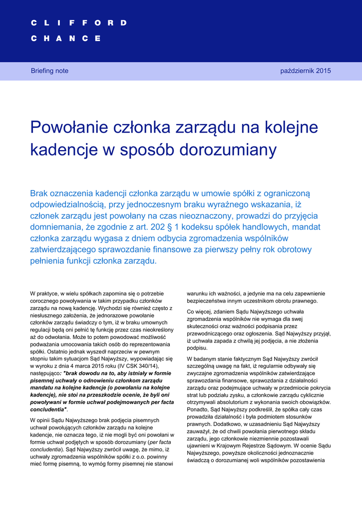 Powołanie członka zarządu na kolejne kadencje w sposób dorozumiany 1 Briefing note październik 2015 Powołanie członka zarządu na kolejne kadencje w sposób dorozumiany Brak oznaczenia kadencji członka zarządu w umowie spółki z ograniczoną odpowiedzialnością, przy jednoczesnym braku wyraźnego wskazania, iż członek zarządu jest powołany na czas nieoznaczony, prowadzi do przyjęcia domniemania, że zgodnie z art. 202 § 1 kodeksu spółek handlowych, mandat członka zarządu wygasa z dniem odbycia zgromadzenia wspólników zatwierdzającego sprawozdanie finansowe za pierwszy pełny rok obrotowy pełnienia funkcji członka zarządu. W praktyce, w wielu spółkach zapomina się o potrzebie corocznego powoływania w takim przypadku członków zarządu na nową kadencję. Wychodzi się również często z niesłusznego założenia, że jednorazowe powołanie członków zarządu świadczy o tym, iż w braku umownych regulacji będą oni pełnić tę funkcję przez czas nieokreślony aż do odwołania. Może to potem powodować możliwość podważania umocowania takich osób do reprezentowania spółki. Ostatnio jednak wyszedł naprzeciw w pewnym stopniu takim sytuacjom Sąd Najwyższy, wypowiadając się w wyroku z dnia 4 marca 2015 roku (IV CSK 340/14), następująco: "brak dowodu na to, aby istniały w formie pisemnej uchwały o odnowieniu członkom zarządu mandatu na kolejne kadencje (o powołaniu na kolejne kadencje), nie stoi na przeszkodzie ocenie, że byli oni powoływani w formie uchwał podejmowanych per facta concludentia". W opinii Sądu Najwyższego brak podjęcia pisemnych uchwał powołujących członków zarządu na kolejne kadencje, nie oznacza tego, iż nie mogli być oni powołani w formie uchwał podjętych w sposób dorozumiany (per facta concludentia). Sąd Najwyższy zwrócił uwagę, że mimo, iż uchwały zgromadzenia wspólników spółki z o.o. powinny mieć formę pisemną, to wymóg formy pisemnej nie stanowi warunku ich ważności, a jedynie ma na celu zapewnienie bezpieczeństwa innym uczestnikom obrotu prawnego. Co więcej, zdaniem Sądu Najwyższego uchwała zgromadzenia wspólników nie wymaga dla swej skuteczności oraz ważności podpisania przez przewodniczącego oraz ogłoszenia. Sąd Najwyższy przyjął, iż uchwała zapada z chwilą jej podjęcia, a nie złożenia podpisu. W badanym stanie faktycznym Sąd Najwyższy zwrócił szczególną uwagę na fakt, iż regularnie odbywały się zwyczajne zgromadzenia wspólników zatwierdzające sprawozdania finansowe, sprawozdania z działalności zarządu oraz podejmujące uchwały w przedmiocie pokrycia strat lub podziału zysku, a członkowie zarządu cyklicznie otrzymywali absolutorium z wykonania swoich obowiązków. Ponadto, Sąd Najwyższy podkreślił, że spółka cały czas prowadziła działalność i była podmiotem stosunków prawnych. Dodatkowo, w uzasadnieniu Sąd Najwyższy zauważył, że od chwili powołania pierwotnego składu zarządu, jego członkowie niezmiennie pozostawali ujawnieni w Krajowym Rejestrze Sądowym. W ocenie Sądu Najwyższego, powyższe okoliczności jednoznacznie świadczą o dorozumianej woli wspólników pozostawienia 2 Powołanie członka zarządu na kolejne kadencje w sposób dorozumiany zarządu w składzie pierwotnym i odnawiania mandatu jego członkom. Orzeczenie Sądu Najwyższego, które może być traktowane jako część szerszego nurtu orzecznictwa mającego na celu zawężenie ryzyka braku umocowania osoby wpisanej do rejestru jako członek zarządu, może zwiększyć bezpieczeństwo obrotu prawnego, i z tego względu należy ocenić go pozytywnie. Niemniej jednak pogląd ten może budzić kontrowersje, np. w zakresie możności zaskarżania uchwał i stwierdzenia ich nieważności. Należy zatem obserwować dalsze orzecznictwo w tym przedmiocie. Warto ponadto pamiętać o skutkach przyjęcia wykładni zastosowanej przez Sąd Najwyższy w powołanym orzeczeniu, dla oceny dorozumianej uchwały wspólników, wyłączającej domniemanie wygaśnięcia mandatu z dniem odbycia zgromadzenia wspólników zatwierdzającego sprawozdanie finansowe za pierwszy pełny rok obrotowy pełnienia funkcji członka zarządu. Oznacza ona bowiem, że należy każdorazowo dokonać wnikliwej analizy konkretnego stanu rzeczywistego oraz okoliczności faktycznych danej sprawy, żeby móc stwierdzić przyjęcie uchwały w sposób dorozumiany. To znaczy, że nie zawsze wykładnia taka będzie panaceum na zaniechania wspólników w tym zakresie. Kontakt Agnieszka Janicka Partner Tomasz Derda Counsel T: +48 22 627 11 77 E: [email protected] T: +48 22 627 11 77 E: [email protected] Sylwia Mizera Junior Associate Karolina Łasowska Junior Associate T: +48 22 627 11 77 E: [email protected] T: +48 22 627 11 77 E: [email protected] Powołanie członka zarządu na kolejne kadencje w sposób dorozumiany 3 Niniejszy Client Briefing nie omawia wszystkich aspektów przedstawianych zagadnień i nie stanowi porady prawnej ani porady innego rodzaju Norway House, ul. Lwowska 19, 00-660 Warsaw, Poland © Clifford Chance 2015 Clifford Chance, Janicka, Krużewski, Namiotkiewicz i wspólnicy spółka komandytowa www.cliffordchance.com Abu Dhabi ■ Amsterdam ■ Bangkok ■ Barcelona ■ Beijing ■ Brussels ■ Bucharest ■ Casablanca ■ Doha ■ Dubai ■ Düsseldorf ■ Frankfurt ■ Hong Kong ■ Istanbul ■ Jakarta* ■ Kyiv ■ London ■ Luxembourg ■ Madrid ■ Milan ■ Moscow ■ Munich ■ New York ■ Paris ■ Perth ■ Prague ■ Riyadh ■ Rome ■ São Paulo ■ Seoul ■ Shanghai ■ Singapore ■ Sydney ■ Tokyo ■ Warsaw ■ Washington, D.C. *Linda Widyati & Partners in association with Clifford Chance.