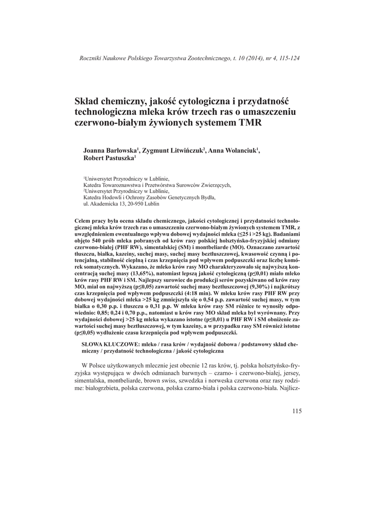 Roczniki Naukowe Polskiego Towarzystwa Zootechnicznego, t. 10 (2014), nr 4, 115-124 Skład chemiczny, jakość cytologiczna i przydatność technologiczna mleka krów trzech ras o umaszczeniu czerwono-białym żywionych systemem TMR Joanna Barłowska1, Zygmunt Litwińczuk2, Anna Wolanciuk1, Robert Pastuszka1 Uniwersytet Przyrodniczy w Lublinie, Katedra Towaroznawstwa i Przetwórstwa Surowców Zwierzęcych, 2 Uniwersytet Przyrodniczy w Lublinie, Katedra Hodowli i Ochrony Zasobów Genetycznych Bydła, ul. Akademicka 13, 20-950 Lublin 1 Celem pracy była ocena składu chemicznego, jakości cytologicznej i przydatności technologicznej mleka krów trzech ras o umaszczeniu czerwono-białym żywionych systemem TMR, z uwzględnieniem ewentualnego wpływu dobowej wydajności mleka (≤25 i >25 kg). Badaniami objęto 540 prób mleka pobranych od krów rasy polskiej holsztyńsko-fryzyjskiej odmiany czerwono-białej (PHF RW), simentalskiej (SM) i montbeliarde (MO). Oznaczano zawartość tłuszczu, białka, kazeiny, suchej masy, suchej masy beztłuszczowej, kwasowość czynną i potencjalną, stabilność cieplną i czas krzepnięcia pod wpływem podpuszczki oraz liczbę komórek somatycznych. Wykazano, że mleko krów rasy MO charakteryzowało się najwyższą koncentracją suchej masy (13,65%), natomiast lepszą jakość cytologiczną (p≤0,01) miało mleko krów rasy PHF RW i SM. Najlepszy surowiec do produkcji serów pozyskiwano od krów rasy MO, miał on najwyższą (p≤0,05) zawartość suchej masy beztłuszczowej (9,30%) i najkrótszy czas krzepnięcia pod wpływem podpuszczki (4:18 min). W mleku krów rasy PHF RW przy dobowej wydajności mleka >25 kg zmniejszyła się o 0,54 p.p. zawartość suchej masy, w tym białka o 0,30 p.p. i tłuszczu o 0,31 p.p. W mleku krów rasy SM różnice te wynosiły odpowiednio: 0,85; 0,24 i 0,70 p.p., natomiast u krów rasy MO skład mleka był wyrównany. Przy wydajności dobowej >25 kg mleka wykazano istotne (p≤0,01) u PHF RW i SM obniżenie zawartości suchej masy beztłuszczowej, w tym kazeiny, a w przypadku rasy SM również istotne (p≤0,05) wydłużenie czasu krzepnięcia pod wpływem podpuszczki. SŁOWA KLUCZOWE: mleko / rasa krów / wydajność dobowa / podstawowy skład chemiczny / przydatność technologiczna / jakość cytologiczna W Polsce użytkowanych mlecznie jest obecnie 12 ras krów, tj. polska holsztyńsko-fryzyjska występująca w dwóch odmianach barwnych – czarno- i czerwono-białej, jersey, simentalska, montbeliarde, brown swiss, szwedzka i norweska czerwona oraz rasy rodzime: białogrzbieta, polska czerwona, polska czarno-biała i polska czerwono-biała. Najlicz- 115 J. Barłowska i wsp. niejsza jest rasa polska holsztyńsko-fryzyjska odmiany czarno-białej (87,56% aktywnego pogłowia krów) [18]. Spośród ras kolorowych istotne znaczenie w produkcji mleka mają dwie: polska holsztyńsko-fryzyjska odmiany czerwono-białej i simentalska. Pierwsza z nich utrzymywana jest głównie na Śląsku i w Bieszczadach, a duży odsetek krów tej rasy użytkowany jest w intensywnych technologiach chowu. Krowy rasy simentalskiej można spotkać głównie w rejonie Bieszczad, chociaż stają się coraz bardziej popularne i w innych regionach, ze względu na stosunkowo wysoką wydajność mleka, zdolność przystosowania do trudnych warunków klimatycznych i bardzo dobre cechy mięsne [17]. Mleko tych krów jest uważane za doskonały surowiec do produkcji sera [13, 17, 20]. W intensywnych systemach użytkowania krowy tej rasy osiągają wyższą wydajność przy korzystniejszym składzie mleka, jednak jego czas krzepnięcia pod wpływem podpuszczki ulega wydłużeniu [3]. Trzecią rasą kolorową, która jest coraz bardziej ceniona w Polsce i dobrze sprawdza się w intensywnych technologiach chowu jest montbeliarde [10]. Zwierzęta tej rasy po raz pierwszy sprowadzono z Francji w 1995 roku, a w 2001 r. MRiRW zezwoliło na otwarcie i prowadzenie ksiąg hodowlanych [8]. W 2013 r. aktywna populacja liczyła 2428 krów, co stanowiło 0,36% całego pogłowia objętego oceną wartości użytkowej krów mlecznych [18]. Bydło montbeliarde reprezentuje dwukierunkowy typ użytkowy mięsno-mleczny. Najliczniejsza populacja utrzymywana jest we Francji, gdzie podobnie jak w Irlandii, stanowi drugą pod względem wielkości pogłowia rasę bydła [9, 21]. Mleko krów tej rasy charakteryzuje się korzystniejszym składem chemicznym w porównaniu do polskiej holsztyńsko-fryzyjskiej [11, 21]. We Francji mleko krów rasy montbeliarde uważane jest za doskonały surowiec do produkcji wysokiej jakości serów (Comté – obszar Montbéliarde, Cantal – centralna Francja, Reblochon – południowo-wschodnia Francja, Mont d’Or – obszar Montbéliarde, Abondance – południowo-wschodnia Francja), ze względu na wysoką częstotliwość występowania allelu B κ-kazeiny i dużą zawartość białka [16]. Zdaniem Treli [21], rasy montbeliarde nie należy traktować w Polsce jako konkurencyjnej dla innych utrzymywanych w kraju ras, ale jako jedną z wielu, produkującą mleko szczególnie cenione w przetwórstwie. Celem pracy była ocena składu chemicznego, jakości cytologicznej i przydatności technologicznej mleka krów 3 ras o umaszczeniu czerwono-białym (polskiej holsztyńsko-fryzyjskiej odmiany czerwono-białej, simentalskiej i montbeliarde) żywionych systemem TMR, z uwzględnieniem ewentualnego wpływu dobowej wydajności mleka. Materiał i metody Badania prowadzono w 3 gospodarstwach z regionu wschodniej Polski. W dwóch, w których utrzymywano krowy rasy polskiej holsztyńsko-fryzyjskiej odmiany czerwono-białej (PHF RW) i montbeliarde (MO) były to obory wolnostanowiskowe, bezściołowe, z wydzielonymi boksami legowiskowymi wyścielonymi matami. Krowy rasy simentalskiej (SM) utrzymywano natomiast w oborze płytkiej, wyściełanej słomą. Wszystkie obory wyposażone były w hale udojowe, przy czym w obiektach utrzymujących krowy ras PHF RW 116 Sk