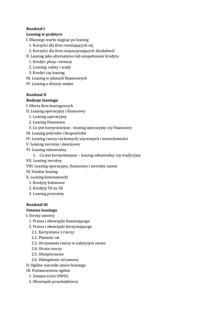 Rozdział I Leasing w praktyce I. Dlaczego warto sięgnąć po leasing 1. Korzyści dla firm rozwijających się 2. Korzyści dla firm rozpoczynających działalność II. Leasing jako alternatywa lub uzupełnienie kredytu 1. Kredyt: plusy i minusy 2. Leasing: zalety i wady 3. Kredyt czy leasing III. Leasing w planach finansowych IV. Leasing a dotacje unijne Rozdział II Rodzaje leasingu I. Oferta firm leasingowych II. Leasing operacyjny i finansowy 1. Leasing operacyjny 2. Leasing finansowy 3. Co jest korzystniejsze - leasing operacyjny czy finansowy III. Leasing pośredni i bezpośredni IV. Leasing rzeczy ruchomych, używanych i nieruchomości V. Leasing zwrotny i dewizowy VI. Leasing odnawialny 1. Co jest korzystniejsze – leasing odnawialny czy tradycyjny VII. Leasing zwrotny VIII. Leasing operacyjny, finansowy i zwrotny razem IX. Vendor leasing X. Leasing konsumencki 1. Kredyty balonowe 2. Kredyty 50 na 50 3. Leasing prywatny Rozdział III Umowa leasingu I. Strony umowy 1. Prawa i obowiązki finansującego 2. Prawa i obowiązki korzystającego 2.1. Korzystanie z rzeczy 2.2. Płatność rat 2.3. Utrzymanie rzeczy w należytym stanie 2.4. Utrata rzeczy 2.5. Ubezpieczenie 2.6. Odstąpienie od umowy II. Ogólne warunki umów leasingu III. Postanowienia ogólne 1. Zmiana treści OWUL 2. Obowiązki przedsiębiorcy 3. Rozstrzyganie sporów 4. Rozwiązanie umowy 5. Okres trwania umowy IV. Przedmiot leasingu 1. Obowiązki korzystającego 2. Dostarczenie przedmiotu leasingu V. Wynagrodzenie finansującego 1. Ustalanie wysokości opłat leasingowych 2. Zmiana wysokości opłat leasingowych 3. Terminy płatności 4. Opóźnienia płatności 5. Koszty dodatkowe VI. Obowiązek ubezpieczenia przedmiotu leasingu 1. Odpowiedzialność finansującego i korzystającego 2. Warunki ubezpieczenia 3. Zawarcie umowy ubezpieczenia 4. Obowiązki przedsiębiorcy w razie szkody VII. Wypowiedzenie umowy leasingu 1. Wada przedmiotu leasingu 2. Niewywiązywanie się z obowiązków 3. Opóźnienia w płatnościach VIII. Wygaśnięcie umowy leasingu z powodu zniszczenia lub utraty przedmiotu leasingu IX. Wady przedmiotu leasingu, naprawy i konserwacja X. Zakończenie umowy leasingu Rozdział IV Wybór firmy leasingowej I. Czym się kierować przy wyborze firmy leasingowej 1. Opinia na rynku 2. Branża 3. Pozycja finansującego II. Negocjacje warunków finansowych 1. Zachowanie w sytuacjach kryzysowych 2. Działania w przypadku szkody III. Leasing w pakiecie IV. Cesja zobowiązania leasingowego V. Specjalizacje na rynku leasingu VI. Własny plan finansowy VII. Dedykowany doradca leasingowy VIII. Pośrednictwo leasingowe Rozdział V Leasing nieruchomości I. Standardowa oferta rynkowa 1. Leasing operacyjny nieruchomości 2. Leasing finansowy nieruchomości 3. Leasing zwrotny II. Ryzyko w leasingu nieruchomości III. Kiedy i dla kogo leasing nieruchomości jest najkorzystniejszy Rozdział VI Leasing samochodów i innych pojazdów I. Oferta rynkowa II. Leasing samochodów osobowych 1. Leasing odnawialny a operacyjny 3. Leasing z wysokim wykupem 4. Leasing konsumencki 5. Wynajem długoterminowy III. Leasing samochodów ciężarowych IV. Leasing ąuadów i motocykli V. Leasing jachtów i łodzi Rozdział VII Leasing maszyn i urządzeń I. Jak korzystnie leasingować maszyny oraz urządzenia II. Leasing maszyn drogowych i budowlanych 1. Produkty ubezpieczeniowe 2. Polisy pomocy prawnej III. Leasing innych maszyn i urządzeń 1. Maszyny i urządzenia stosowane w branży piekarniczej oraz cukierniczej 2. Maszyny i urządzenia poligraficzne 3. Maszyny do obróbki metalu 4. Maszyny do obróbki drewna IV. Leasing sprzętu komputerowego i biurowego Rozdział VIII Ubezpieczenia I. Leasing assistance II. Ubezpieczenia straty finansowej GAP 1. Ochrona ubezpieczeniowa 2. Składka ubezpieczeniowa 3. Wyłączenia 4. Wypłata odszkodowania III. Ubezpieczenie ochrony prawnej dla leasingobiorców 1. Przedmiot i zakres ubezpieczenia 2. Wyłączenia IV. Ubezpieczenie typu bezpieczna rata Rozdział IX Leasing dla wybranych grup biznesowych I. Leasing dla małych i średnich firm II. Leasing dla prawników i księgowych III. Leasing dla medyków IV. Leasing dla rolników Rozdział X Leasing w praktyce I. Orzecznictwo sądów i interpretacje organów podatkowych 1. Wycena wartości przedmiotu leasingu należy do biegłego Stan faktyczny Stanowisko sądu Komentarz eksperta 2. Pełne odliczenie VAT przy leasingu możliwe przez 6 miesięcy Stan faktyczny Stanowisko sądu Komentarz eksperta 3. Po cesji leasingu nowy korzystający ma prawo zaliczyć raty leasingowe w koszty podatkowe Stan faktyczny Stanowisko sądu 4. Wydatki związane z wcześniejszym rozwiązaniem leasingu firma zaliczy do kosztów Stan faktyczny Stanowisko organu podatkowego 5. Opłata wstępna w leasingu jest pośrednim kosztem podatkowym Stan faktyczny Stanowisko organu podatkowego Komentarz eksperta II. Pytania przedsiębiorców i odpowiedzi ekspertów 1. Opłata manipulacyjna w leasingu jest kosztem pośrednim 2. Samochód wykupiony z leasingu a likwidacja spółki cywilnej 3. Wykup mebli z leasingu 4. Opłata manipulacyjna w leasingu jest kosztem pośrednim 5. Podnajem samochodów wziętych w leasing 6. Auto z leasingu jako koszt uzyskania przychodu