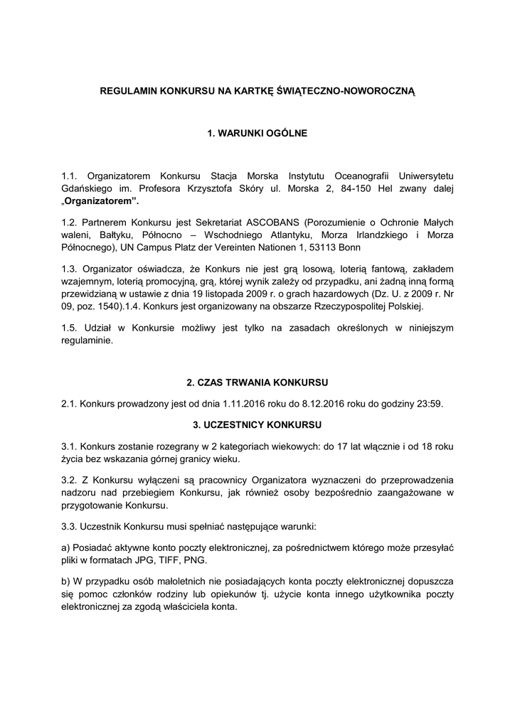 REGULAMIN KONKURSU NA KARTKĘ ŚWIĄTECZNO-NOWOROCZNĄ 1. WARUNKI OGÓLNE 1.1. Organizatorem Konkursu Stacja Morska Instytutu Oceanografii Uniwersytetu Gdańskiego im. Profesora Krzysztofa Skóry ul. Morska 2, 84-150 Hel zwany dalej „Organizatorem”. 1.2. Partnerem Konkursu jest Sekretariat ASCOBANS (Porozumienie o Ochronie Małych waleni, Bałtyku, Północno – Wschodniego Atlantyku, Morza Irlandzkiego i Morza Północnego), UN Campus Platz der Vereinten Nationen 1, 53113 Bonn 1.3. Organizator oświadcza, że Konkurs nie jest grą losową, loterią fantową, zakładem wzajemnym, loterią promocyjną, grą, której wynik zależy od przypadku, ani żadną inną formą przewidzianą w ustawie z dnia 19 listopada 2009 r. o grach hazardowych (Dz. U. z 2009 r. Nr 09, poz. 1540).1.4. Konkurs jest organizowany na obszarze Rzeczypospolitej Polskiej. 1.5. Udział w Konkursie możliwy jest tylko na zasadach określonych w niniejszym regulaminie. 2. CZAS TRWANIA KONKURSU 2.1. Konkurs prowadzony jest od dnia 1.11.2016 roku do 8.12.2016 roku do godziny 23:59. 3. UCZESTNICY KONKURSU 3.1. Konkurs zostanie rozegrany w 2 kategoriach wiekowych: do 17 lat włącznie i od 18 roku życia bez wskazania górnej granicy wieku. 3.2. Z Konkursu wyłączeni są pracownicy Organizatora wyznaczeni do przeprowadzenia nadzoru nad przebiegiem Konkursu, jak również osoby bezpośrednio zaangażowane w przygotowanie Konkursu. 3.3. Uczestnik Konkursu musi spełniać następujące warunki: a) Posiadać aktywne konto poczty elektronicznej, za pośrednictwem którego może przesyłać pliki w formatach JPG, TIFF, PNG. b) W przypadku osób małoletnich nie posiadających konta poczty elektronicznej dopuszcza się pomoc członków rodziny lub opiekunów tj. użycie konta innego użytkownika poczty elektronicznej za zgodą właściciela konta. 4. ZASADY KONKURSU 4.1. Konkurs polega na wykonaniu dowolną techniką projektu graficznego kartki świątecznonoworocznej, której motywem przewodnim jest morświn i przesłaniu go do oceny jury. 4.2. Wykonane projekty należy wysłać za pomocą poczty elektronicznej na adres e-mail: [email protected] lub [email protected] . Pliki mogą być w formacie jpg, png lub tiff. Mogą być to skany obrazów (prac), zdjęcia cyfrowe prac wykonane aparatem fotograficznym lub pliki sporządzone za pomocą programu graficznego. W temacie wiadomości, do której załączone są pliki musi się znaleźć sformułowanie: ,,Kartka świąteczna, konkurs, zgłoszenie”. 4.3. Każdy uczestnik może wysłać tylko jeden graficzny projekt (plik). Zwycięzców wyłoni Komisja złożona z pracowników Stacji Morskiej. 4.4 Uczestnicy, przesyłając projekt, zachowują wszelkie prawa autorskie, a jednocześnie wyrażają zgodę na jego nieodpłatne wykorzystanie przez Sekretariat ASCOBANS i Stację Morską do stworzenia karty pocztowej i umieszczenia na stronie internetowej z dodatkowym tekstem. 4.5. Komisja konkursowa wyłania 2 zwycięzców, po jednym w każdej kategorii wiekowej (do 17 lat i od 18 lat). 4.6. Lista zwycięzców zostanie ogłoszona najpóźniej dnia 12.12.2016 roku za pomocą dedykowanego wpisu konkursowego na stronach internetowych: http://www.hel.ug.edu.pl/, http://www.fokarium.pl/, https://www.facebook.com/Fokarium/?fref=ts i https://www.facebook.com/dommorswina/?fref=ts. 4.7. Zwycięzca zobowiązany jest w ciągu 3 dni od dnia ogłoszenia wyników przesłać zwrotną wiadomość e-mail z danymi niezbędnymi do przekazania nagrody wraz z oświadczeniem zgody na przetwarzanie danych osobowych zgodnie z pkt 5.5, o które zostanie poproszony w otrzymanym e-mailu. Niezachowanie tego terminu, podanie nieprawidłowego adresu lub danych, o których mowa w zdaniu poprzednim, brak oświadczenia zgody, a także inne uchybienia z winy Uczestnika powodujące niemożliwość doręczenia nagrody skutkują utratą prawa do niej, a nagroda pozostaje wówczas do wyłącznej dyspozycji Organizatora. 5. PRZETWARZANIE DANYCH OSOBOWYCH 5.1. Administratorem danych osobowych przetwarzanych na podstawie niniejszego regulaminu jest Organizator. 5.2. Dane osobowe Uczestników Konkursu są przetwarzane jedynie w zakresie niezbędnym w celu przeprowadzenia Konkursu, komunikowania się z Uczestnikami, wydania Nagród oraz obsługi reklamacji. Dane osobowe Uczestników będą przetwarzane nie dłużej niż to będzie konieczne do należytego przeprowadzenia Konkursu. Po upływie tego okresu dane osobowe Uczestników zostaną usunięte. 5.3. Podanie danych osobowych jest dobrowolne, ale niezbędne do wzięcia udziału w Konkursie oraz otrzymania nagrody lub rozpatrzenia ewentualnych reklamacji. Uczestnikom przysługuje prawo dostępu do treści swoich danych i ich poprawiania. W tym celu należy skontaktować się z Organizatorem za pośrednictwem adresów podanych wcześniej w niniejszym regulaminie. 5.4. W związku z prowadzeniem Konkursu, od Uczestników zbierane będą następujące dane osobowe Uczestników: adres e-mail, imię i nazwisko, adres, miejscowość zamieszkania, telefon kontaktowy. 6. NAGRODY 6.1. Nagrodzone prace zostaną wykorzystane do projektu kartek świątecznych, które będą użyte następnie przez Sekretariat ASCOBANS i Stację Morską. Dla zwycięzców przewidziano pakiet nagród rzeczowych niespodzianek od Sekretariatu ASCOBANS i Stacji Morskiej. 6.2. Nagrody nie podlegają wymianie na inne nagrody lub ekwiwalent pieniężny. 7. WYDAWANIE NAGRÓD 7.1. Nagrody rzeczowe zostaną wysłane za pośrednictwem poczty na adresy wskazane przez zwycięzców. 7.2. Przed odbiorem Nagrody Zwycięzca zobowiązany jest potwierdzić odbiór Nagrody w ciągu 3 dni od momentu otrzymania powiadomienia o wygranej, pod rygorem utraty prawa do Nagrody. 8. INNE POSTANOWIENIA 8.1. Uczestnictwo w Konkursie jest dobrowolne. 8.2. W przypadku stwierdzenia nieprawidłowości w czasie trwania Konkursu wynikających z nadużyć ze strony Uczestnika, w tym w szczególności złamania przez Uczestnika zasad Regulaminu