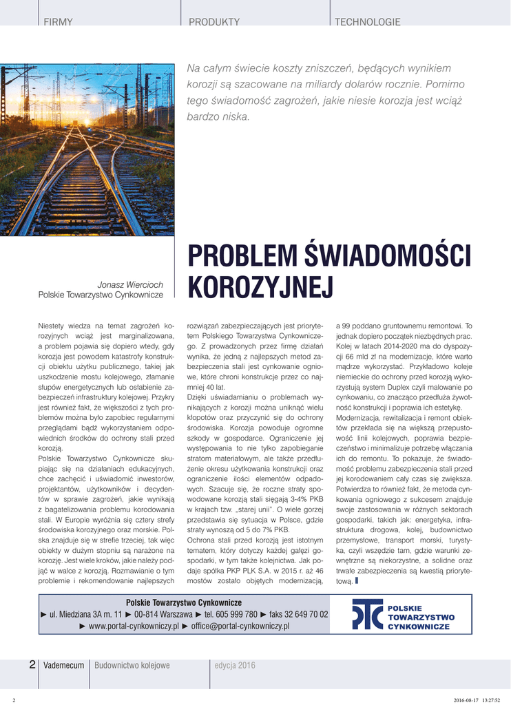 FIRMY PRODUKTY TECHNOLOGIE Na całym świecie koszty zniszczeń, będących wynikiem korozji są szacowane na miliardy dolarów rocznie. Pomimo tego świadomość zagrożeń, jakie niesie korozja jest wciąż bardzo niska. Jonasz Wiercioch Polskie Towarzystwo Cynkownicze PROBLEM ŚWIADOMOŚCI KOROZYJNEJ Niestety wiedza na temat zagrożeń ko- rozwiązań zabezpieczających jest prioryte- a 99 poddano gruntownemu remontowi. To rozyjnych marginalizowana, tem Polskiego Towarzystwa Cynkownicze- jednak dopiero początek niezbędnych prac. a problem pojawia się dopiero wtedy, gdy go. Z prowadzonych przez firmę działań Kolej w latach 2014-2020 ma do dyspozy- korozja jest powodem katastrofy konstruk- wynika, że jedną z najlepszych metod za- cji 66 mld zł na modernizacje, które warto cji obiektu użytku publicznego, takiej jak bezpieczenia stali jest cynkowanie ognio- mądrze wykorzystać. Przykładowo koleje uszkodzenie mostu kolejowego, złamanie we, które chroni konstrukcje przez co naj- niemieckie do ochrony przed korozją wyko- słupów energetycznych lub osłabienie za- mniej 40 lat. rzystują system Duplex czyli malowanie po bezpieczeń infrastruktury kolejowej. Przykry Dzięki uświadamianiu o problemach wy- cynkowaniu, co znacząco przedłuża żywot- jest również fakt, że większości z tych pro- nikających z korozji można uniknąć wielu ność konstrukcji i poprawia ich estetykę. blemów można było zapobiec regularnymi kłopotów oraz przyczynić się do ochrony Modernizacja, rewitalizacja i remont obiek- przeglądami bądź wykorzystaniem odpo- środowiska. Korozja powoduje ogromne tów przekłada się na większą przepusto- wiednich środków do ochrony stali przed szkody w gospodarce. Ograniczenie jej wość linii kolejowych, poprawia bezpie- korozją. występowania to nie tylko zapobieganie czeństwo i minimalizuje potrzebę włączania Polskie Towarzystwo Cynkownicze sku- stratom materiałowym, ale także przedłu- ich do remontu. To pokazuje, że świado- piając się na działaniach edukacyjnych, żenie okresu użytkowania konstrukcji oraz mość problemu zabezpieczenia stali przed chce zachęcić i uświadomić inwestorów, ograniczenie ilości elementów odpado- jej korodowaniem cały czas się zwiększa. projektantów, użytkowników i decyden- wych. Szacuje się, że roczne straty spo- Potwierdza to również fakt, że metoda cyn- tów w sprawie zagrożeń, jakie wynikają wodowane korozją stali sięgają 3-4% PKB kowania ogniowego z sukcesem znajduje z bagatelizowania problemu korodowania w krajach tzw. „starej unii”. O wiele gorzej swoje zastosowania w różnych sektorach stali. W Europie wyróżnia się cztery strefy przedstawia się sytuacja w Polsce, gdzie gospodarki, takich jak: energetyka, infra- środowiska korozyjnego oraz morskie. Pol- straty wynoszą od 5 do 7% PKB. struktura drogowa, kolej, budownictwo ska znajduje się w strefie trzeciej, tak więc Ochrona stali przed korozją jest istotnym przemysłowe, transport morski, turysty- obiekty w dużym stopniu są narażone na tematem, który dotyczy każdej gałęzi go- ka, czyli wszędzie tam, gdzie warunki ze- korozję. Jest wiele kroków, jakie należy pod- spodarki, w tym także kolejnictwa. Jak po- wnętrzne są niekorzystne, a solidne oraz jąć w walce z korozją. Rozmawianie o tym daje spółka PKP PLK S.A. w 2015 r. aż 46 trwałe zabezpieczenia są kwestią prioryte- problemie i rekomendowanie najlepszych mostów zostało objętych modernizacją, tową. wciąż jest Polskie Towarzystwo Cynkownicze ► ul. Miedziana 3A m. 11 ► 00-814 Warszawa ► tel. 605 999 780 ► faks 32 649 70 02 ► www.portal-cynkowniczy.pl ► [email protected] 2 2 Vademecum Budownictwo kolejowe edycja 2016 2016-08-17 13:27:52 PRZEGLĄD PRODUKTÓW PRZEGLĄD REALIZACJI Wypowiedź eksperta Jacek Zasada Prezes zarządu Polskie Towarzystwo Cynkownicze Na czym polega proces cynkowania ogniowego? Przemysłowe zastosowanie metody Malouin’a nie było możliwe, aż do 1836 roku, kiedy wynaleziono sposób czyszczenia powierzchni 4 4 Vademecum Budownictwo kolejowe WYPOWIEDZI EKSPERTÓW żelaza przez trawienie. Odkrycie to pozwoliło wykorzystać cynkowanie ogniowe na szerszą skalę. Obecnie proces cynkowania składa się z kilku technologicznie zaawansowanych etapów wstępnych, które przygotowują materiał do zanurzenia w kąpieli cynkowej. Głównym ich celem jest mechaniczne usunięciu niejednorodności przylegających do powierzchni cynkowanego przedmiotu (piasek, rdza czy pozostałości starej warstwy ochronnej), odtłuszczenie powłoki z substancji woskowatych lub oleju oraz zanurzeniu elementów stalowych w roztworze wodnym chlorku cynku i chlorku amonu. Ostatni etap procesu cynkowania polega na zanurzeniu uprzednio przygotowanego podłoża stalowego w kąpieli stopionego cynku o temperaturze 445-455°C. W tych warunkach cynk i żelazo ulegają bardzo szybkiej reakcji chemicznej, co skraca czas zanurzenia powierzchni stalowych w ciekłym cynku do kilku minut. Na drodze dyfuzji czyli przenikania atomów cynku w zewnętrzną warstwę stali, powstaje powierzchniowy stop żelazo-cynk zawierający różny stosunek obydwu składników. W konsekwencji otrzymuje się powłokę stopową trwale związaną ze stalą, która chroni konstrukcję przed działaniami mechanicznymi i chemicznymi. Prawidłowo wykonana powłoka cynkowa w zależności od jej grubości, agresywności środowiska i erozji mechanicznej wytrzymuje od 40 do 100 lat. edycja 2015 2016-08-17 13:27:52