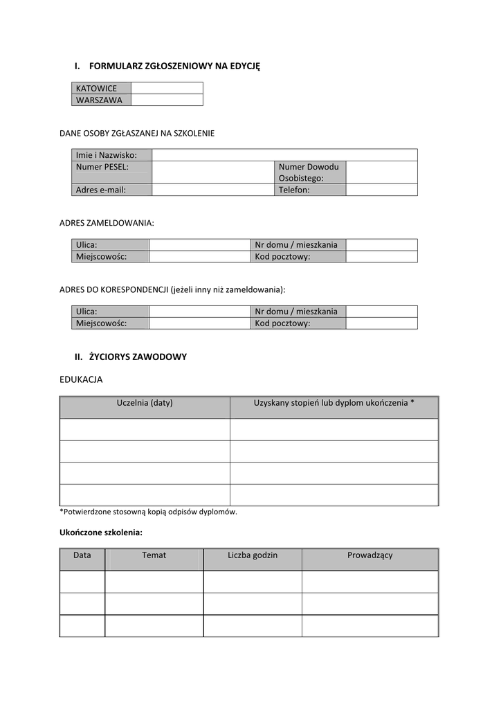 I. FORMULARZ ZGŁOSZENIOWY NA EDYCJĘ KATOWICE WARSZAWA DANE OSOBY ZGŁASZANEJ NA SZKOLENIE Imie i Nazwisko: Numer PESEL: Numer Dowodu Osobistego: Telefon: Adres e-mail: ADRES ZAMELDOWANIA: Ulica: Miejscowośc: Nr domu / mieszkania Kod pocztowy: ADRES DO KORESPONDENCJI (jeżeli inny niż zameldowania): Ulica: Miejscowośc: Nr domu / mieszkania Kod pocztowy: II. ŻYCIORYS ZAWODOWY EDUKACJA Uczelnia (daty) Uzyskany stopień lub dyplom ukończenia * *Potwierdzone stosowną kopią odpisów dyplomów. Ukończone szkolenia: Data Temat Liczba godzin Prowadzący Doświadczenie zawodowe: Data Miejscowość Firma Stanowisko Miejscowość Firma Stanowisko Miejscowość Firma Stanowisko Miejscowość Firma Stanowisko Miejscowość Firma Stanowisko Zakres obowiązków: Data Zakres obowiązków: Data Zakres obowiązków: Data Zakres obowiązków: Data Zakres obowiązków: Przeprowadzone szkolenia*: Data Miejscowość Firma zlecająca Temat Liczba godzin *potwierdzone zaświadczeniami/referencjami zleceniodawcy POTWIERDZENIE UCZESTNICTWA: Rezerwacja miejsca następuje po dokonaniu wpłaty …. PLN tytułem zaliczki na poczet szkolenia. Wpłatę należy dokonać na konto w ………………………………., numer konta: ……………………………………., tytuł przelewu: imię i nazwisko, adres zameldowania, zaliczka na poczet szkolenia, edycja. Wyrażam zgodę na gromadzenie, przetwarzanie oraz wykorzystanie podanych informacji przez firmę Otawa Group sp.j. w celu przygotowania i przeprowadzenia powyższego szkolenia oraz w celach marketingowych zgodnie z ustawą o ochronie danych osobowych z dn. 29.08.1997 r. (Dz. Ust Nr 133 poz. 883)