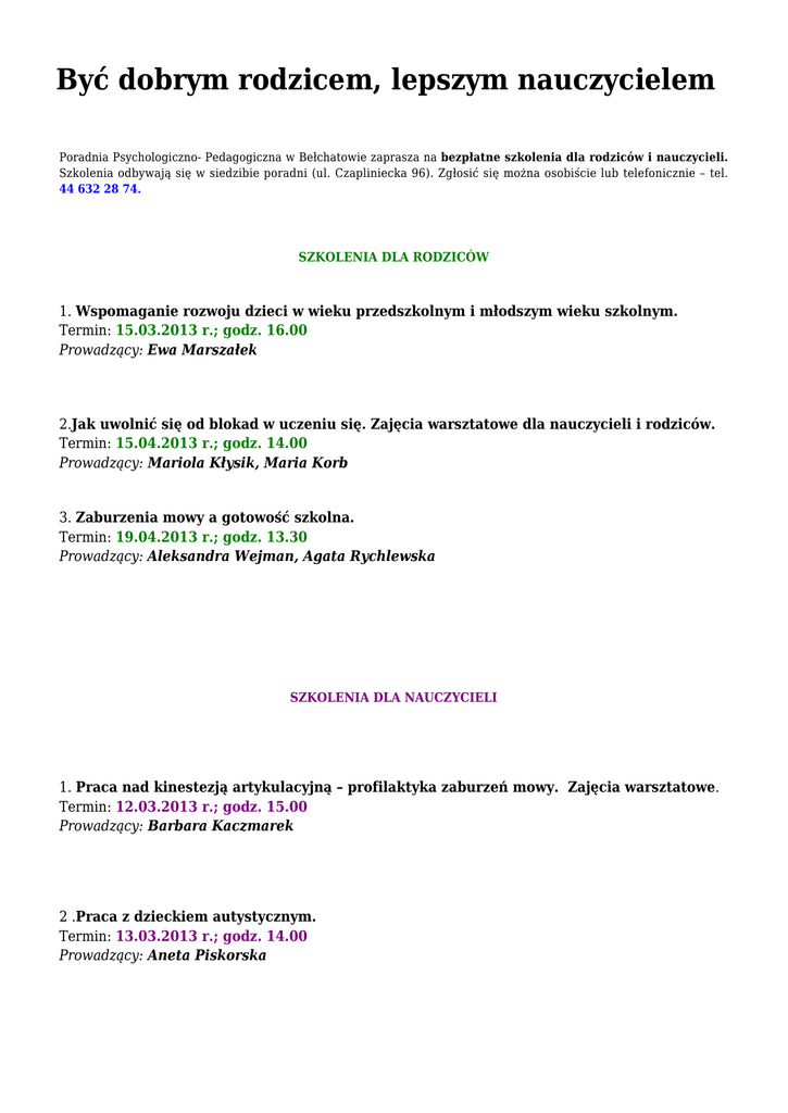 Być dobrym rodzicem, lepszym nauczycielem Poradnia Psychologiczno- Pedagogiczna w Bełchatowie zaprasza na bezpłatne szkolenia dla rodziców i nauczycieli. Szkolenia odbywają się w siedzibie poradni (ul. Czapliniecka 96). Zgłosić się można osobiście lub telefonicznie – tel. 44 632 28 74. SZKOLENIA DLA RODZICÓW 1. Wspomaganie rozwoju dzieci w wieku przedszkolnym i młodszym wieku szkolnym. Termin: 15.03.2013 r.; godz. 16.00 Prowadzący: Ewa Marszałek 2.Jak uwolnić się od blokad w uczeniu się. Zajęcia warsztatowe dla nauczycieli i rodziców. Termin: 15.04.2013 r.; godz. 14.00 Prowadzący: Mariola Kłysik, Maria Korb 3. Zaburzenia mowy a gotowość szkolna. Termin: 19.04.2013 r.; godz. 13.30 Prowadzący: Aleksandra Wejman, Agata Rychlewska SZKOLENIA DLA NAUCZYCIELI 1. Praca nad kinestezją artykulacyjną – profilaktyka zaburzeń mowy. Zajęcia warsztatowe. Termin: 12.03.2013 r.; godz. 15.00 Prowadzący: Barbara Kaczmarek 2 .Praca z dzieckiem autystycznym. Termin: 13.03.2013 r.; godz. 14.00 Prowadzący: Aneta Piskorska 3. Metody pracy korekcyjnej z dzieckiem mającym trudności w nauce czytania i pisania. Termin: 15.03.2013 r.; godz. 14.00 Prowadzący: Barbara Łucka 4. Zastosowanie czytania globalnego w pracy z uczniem z zaburzoną analizą i syntezą głoskowo – literową. Termin: 09.04.2013 r.; godz. 16.00 Prowadzący: Ewa Dzika 5. Jak uwolnić się od blokad w uczeniu się. Zajęcia warsztatowe dla nauczycieli i rodziców. Termin: 15.04.2013 r.; godz. 14.00 Prowadzący: Mariola Kłysik, Maria Korb 6.Zaburzenia mowy a gotowość szkolna. Termin: 19.04.2013 r.; godz. 13.30 Prowadzący: Agata Rychlewska, Aleksandra Wejman 7. Dyslektyk na różnych przedmiotach nauczania – specyficzne trudności i zachowania, metody pracy na lekcji. Szkolenie dla nauczycieli. Termin: 27.02.2013 r.; godz. 16.30 Prowadzący: Joanna Jaworska – Bielaś Krzysztof Borowski, rzecznik prasowy Starostwa Powiatowego w Bełchatowie