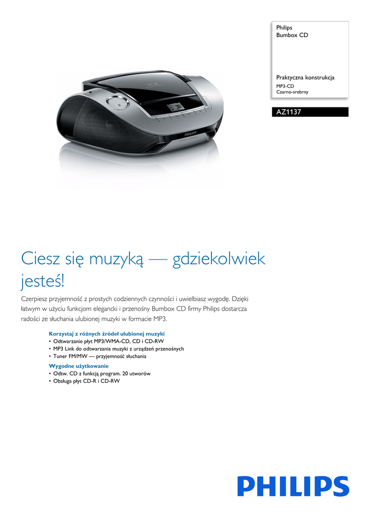 Philips Bumbox CD Praktyczna konstrukcja MP3-CD Czarno-srebrny AZ1137 Ciesz się muzyką — gdziekolwiek jesteś! Czerpiesz przyjemność z prostych codziennych czynności i uwielbiasz wygodę. Dzięki łatwym w użyciu funkcjom elegancki i przenośny Bumbox CD firmy Philips dostarcza radości ze słuchania ulubionej muzyki w formacie MP3. Korzystaj z różnych źródeł ulubionej muzyki • Odtwarzanie płyt MP3/WMA-CD, CD i CD-RW • MP3 Link do odtwarzania muzyki z urządzeń przenośnych • Tuner FM/MW — przyjemność słuchania Wygodne użytkowanie • Odtw. CD z funkcją program. 20 utworów • Obsługa płyt CD-R i CD-RW AZ1137/12 Bumbox CD Praktyczna konstrukcja MP3-CD, Czarno-srebrny Zalety Dane techniczne Odtwarzanie płyt MP3/WMA-CD, CD i CD-RW jakości zapewnionej przez zestaw audio to zaledwie jedna z jego zalet. Złącze MP3 jest niezwykle wygodne – wystarczy podłączyć przenośny odtwarzacz MP3 do zestawu audio. Odtw. CD z funkcją program. 20 utworów Funkcja programowania odtwarzania CD pozwala ustalić kolejność słuchania ulubionych utworów. Obsługa płyt CD-R/RW Technika automatycznej kompresji pozwala 10krotnie zmniejszyć rozmiar dużych plików muzycznych, nie tracąc prawie nic na jakości dźwięku. Odtwarzacz Philips umożliwia słuchanie muzyki cyfrowej w formacie MP3 i WMA. Pobierz utwory MP3 i WMA z autoryzowanych stron internetowych z muzyką albo zgraj płyty audio CD do plików MP3 lub WMA i przenieś je do odtwarzacza. MP3 Link Kompatybilny z CD-RW oznacza, że w sprzęcie audio można odtwarzać płyty CD-R i CD-RW. CDR to płyty jednokrotnego zapisu, które można odtwarzać w dowolnym odtwarzaczu CD, podczas gdy CD-RW to płyty wielokrotnego zapisu i kasowania, które można odtwarzać tylko w kompatybilnych odtwarzaczach CD. Promień lasera i układ dekodera CD w odtwarzaczach kompatybilnych z CD-RW są specjalnie dostosowane do odczytu specjalnej warstwy, na której zapisana jest muzyka na płytach CD-RW, dzięki czemu na takim sprzęcie audio można odtwarzać płyty nagrane w domu. Tuner FM/MW Odtwarzanie dźwięku • Odtwarzane nośniki: MP3-CD, CD, CD-R, CDRW, WMA-CD • Tryby odtwarzania płyt: szybkie odtwarzanie do przodu/do tyłu, wyszukiwanie następnej/ poprzedniej ścieżki, odtwarzanie wielokrotne/ losowe/zaprogramowane Tuner/Odbiór/Transmisja • Antena: Antena FM • Pasma tunera: FM, ŚR. Dźwięk • System dźwięku: stereo • Regulacja głośności: obrotowy (analogowy) • Moc wyjściowa: 2 x 1 W RMS Głośniki • Liczba wbudowanych głośników: 2 • Wykończenie osłony głośnika: metal Udogodnienia • Typ wyświetlacza: Wyświetlacz LCD • Liczba wyświetlanych cyfr: 3 • Sposób ładowania: góra Połączenia • MP3 Link: Wejście liniowe stereo 3,5 mm Moc • • • • Rodzaj baterii/akumulatora: Rozmiar C (LR14) Napięcie baterii: 1,5 V Źródło zasilania: 220–240 V Liczba baterii lub akumulatorów: 6 Akcesoria MP3 Link umożliwia bezpośrednie odtwarzanie zawartości MP3 z przenośnych odtwarzaczy multimedialnych. Słuchanie muzyki w doskonałej Tuner stereo FM/MW (AM) • Przewody/podłączenie: Przewód stereo z wtykami 3,5 mm, przewód zasilający • Instrukcja obsługi: wielojęzyczna • Gwarancja: Broszura ogólnoświatowej gwarancji Wymiary • • • • • • • • • Data wydania 2015-06-11 © 2015 Koninklijke Philips N.V. Wszelkie prawa zastrzeżone. Wersja: 2.0.5 Dane techniczne mogą ulec zmianie bez powiadomienia. Znaki towarowe są własnością Koninklijke Philips N.V. lub własnością odpowiednich firm. 12 NC: 8670 000 62123 EAN: 87 12581 53761 6 www.philips.com Waga brutto: 2,4 kg Głębokość opakowania: 139 mm Wysokość opakowania: 262 mm Szerokość opakowania: 371 mm Waga: 1,9 kg Głębokość jednostki centralnej: 236 mm Wysokość jednostki centralnej: 122 mm Szerokość jednostki centralnej: 341 mm