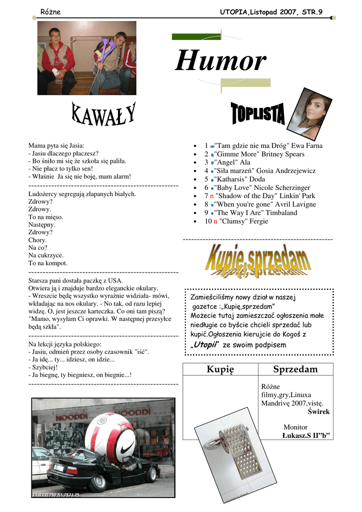 Różne UTOPIA,Listopad 2007, STR.9 Humor Mama pyta się Jasia: - Jasiu dlaczego płaczesz? - Bo śniło mi się że szkoła się paliła. - Nie płacz to tylko sen! - Właśnie Ja się nie boję, mam alarm! ----------------------------------------------------Ludożercy segregują złapanych białych. Zdrowy? Zdrowy. To na mięso. Następny. Zdrowy? Chory. Na co? Na cukrzyce. To na kompot. • • • • • • • • • • 1 "Tam gdzie nie ma Dróg" Ewa Farna 2 "Gimme More" Britney Spears 3 "Angel" Ala 4 "Siła marzeń" Gosia Andrzejewicz 5 "Katharsis" Doda 6 "Baby Love" Nicole Scherzinger 7 n "Shadow of the Day" Linkin' Park 8 "When you're gone" Avril Lavigne 9 "The Way I Are" Timbaland 10 n "Clumsy" Fergie ----------------------------------------------------- ----------------------------------------------------Starsza pani dostała paczkę z USA. Otwiera ją i znajduje bardzo eleganckie okulary. - Wreszcie będę wszystko wyraźnie widziała- mówi, wkładając na nos okulary. - No tak, od razu lepiej widzę. O, jest jeszcze karteczka. Co oni tam piszą? "Mamo, wysyłam Ci oprawki. W następnej przesyłce będą szkła". ----------------------------------------------------Na lekcji języka polskiego: - Jasiu, odmień przez osoby czasownik "iść". - Ja idę... ty... idziesz, on idzie... - Szybciej! - Ja biegnę, ty biegniesz, on biegnie...! ----------------------------------------------------- Zamieściliśmy nowy dział w naszej gazetce :„Kupię,sprzedam” Możecie tutaj zamieszczać ogłoszenia małe niedługie co byście chcieli sprzedać lub kupić.Ogłoszenia kierujcie do Kogoś z „Utopii” ze swoim podpisem Kupię Sprzedam Różne filmy,gry,Linuxa Mandrivę 2007,vistę. Świrek Monitor Łukasz.S II”b”