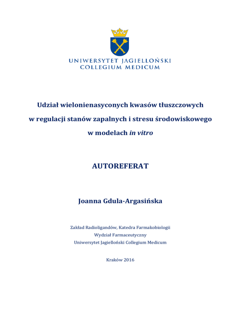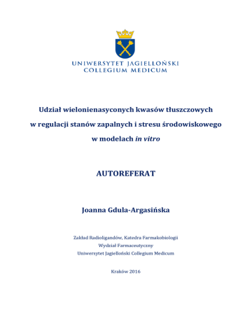 Udział wielonienasyconych kwasów tłuszczowych w regulacji stanów zapalnych i stresu środowiskowego w modelach in vitro AUTOREFERAT Joanna Gdula-Argasińska Zakład Radioligandów, Katedra Farmakobiologii Wydział Farmaceutyczny Uniwersytet Jagielloński Collegium Medicum Kraków 2016 Spis treści 1. INFORMACJE PODSTAWOWE ............................................................................................... 3 1.1. Imię i Nazwisko. ........................................................................................................................................................................... 3 1.2. Posiadane dyplomy, stopnie naukowe - podanie nazwy, miejsca i roku ich uzyskania oraz tytuł rozprawy doktorskiej. ........................................................................................................................................................................ 3 1.3. Informacje o dotychczasowym zatrudnieniu w jednostkach naukowych ............................................................. 3 1.4. Wskazanie osiągnięcia naukowego, wynikającego z art. 16 ust. 2 Ustawy z dnia 14.03.2003r. o stopniach naukowych i tytule naukowym oraz o stopniach i tytule w zakresie sztuki. ........................................ 4 2. OSIĄGNIĘCIA NAUKOWE STANOWIĄCE PODSTAWĘ HABILITACJI .................................... 5 2.1. Wykaz publikacji będących podstawą rozprawy habilitacyjnej ............................................................................... 5 2.2. Prezentacja wyników i streszczenia prac stanowiących podstawę habilitacji ................................................... 7 3. POZOSTAŁE OSIĄGNIĘCIA NAUKOWE ................................................................................ 26 3.1. Działalność naukowa oraz wykaz publikacji przed uzyskaniem stopnia doktora .......................................... 26 3.2. Udział w projektach badawczych ....................................................................................................................................... 35 3.3. Promotor pomocniczy w przewodach doktorskich ...................................................................................................... 36 3.4. Udział w szkoleniach, konferencjach krajowych i międzynarodowych, w tym spis komunikatów zjazdowych ........................................................................................................................................................................................... 36 3.5. Recenzje prac naukowych ...................................................................................................................................................... 42 3.6. Recenzje projektów badawczych......................................................................................................................................... 42 3.7. Organizacje naukowe .............................................................................................................................................................. 42 3.8. Kolegia redakcyjne .................................................................................................................................................................... 43 3.9. Staże naukowe ............................................................................................................................................................................ 43 3.10. Współpraca naukowa ........................................................................................................................................................... 43 4. NAGRODY I WYRÓŻNIENIA ................................................................................................ 44 5. DZIAŁALNOŚĆ DYDAKTYCZNA I ORGANIZACYJNA ............................................................ 44 6. PLANY NAUKOWE................................................................................................................ 46 2 1. INFORMACJE PODSTAWOWE 1.1. Imię i Nazwisko. Joanna Gdula-Argasińska 1.2. Posiadane dyplomy, stopnie naukowe - podanie nazwy, miejsca i roku ich uzyskania oraz tytuł rozprawy doktorskiej. doktor nauk biologicznych Uniwersytet Jagielloński, Wydział o Ziemi, Kraków, 25 listopada 2003r. Biologii i Nauk Rozprawa doktorska w zakresie biologii, specjalność: ekotoksykologia. „Wpływ zanieczyszczeń pyłowych na poziom metali ciężkich w tkankach, zmiany histologiczne, wskaźniki krwi, niektóre biomarkery oraz parametry populacyjne drobnych ssaków z wybranych terenów leśnych województwa małopolskiego”. Promotor: prof. dr hab. Katarzyna Sawicka-Kapusta magister ochrony środowiska Uniwersytet Jagielloński, Wydział Chemii UJ, Kraków 1998r. Specjalność: biologia środowiska. licencjat ochrony środowiska Uniwersytet Jagielloński, Wydział Chemii UJ, Kraków 1996r. Specjalność: chemia środowiska. 1.3. Informacje o dotychczasowym zatrudnieniu w jednostkach naukowych 01.10.2011 i nadal adiunkt w Zakładzie Radioligandów, Katedra Farmakobiologii, Wydział Farmaceutyczny UJ CM 01.02.2006-30.09.2011 adiunkt w Zakładzie Analityki Biochemicznej, Wydział Farmaceutyczny UJ CM 15.01.2004-31.01.2006 asystent w Zakładzie Monitoringu Środowiska, Instytut Nauk o Środowisku UJ 01.10.1998-30.09.1999 asystent w Zespole Fizykochemii Związków i Chemii Bionieorganicznej, Wydział Chemii UJ 3 Koordynacyjnych 1.4. Wskazanie osiągnięcia naukowego, wynikającego z art. 16 ust. 2 Ustawy z dnia 14.03.2003r. o stopniach naukowych i tytule naukowym oraz o stopniach i tytule w zakresie sztuki. Podstawę niniejszej habilitacji stanowi cykl 7 publikacji oryginalnych, powiązanych tematycznie, przedstawionych jako osiągnięcie naukowe w punkcie 2.1. (P-1 – P-7) o wspólnym tytule: „Udział wielonienasyconych kwasów tłuszczowych w regulacji stanów zapalnych i stresu środowiskowego w modelach in vitro”. 4 2. OSIĄGNIĘCIA NAUKOWE STA