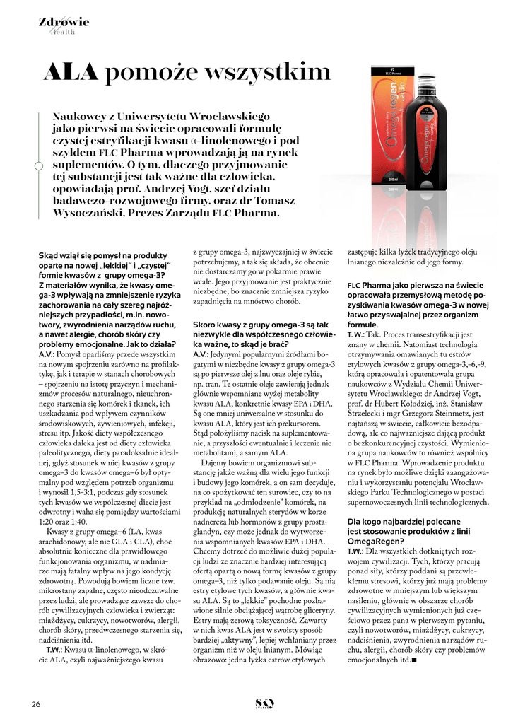 Zdrowie Hea lt h ALA pomoże wszystkim Naukowcy z Uniwersytetu Wrocławskiego jako pierwsi na świecie opracowali formułę czystej estryfikacji kwasu α-linolenowego i pod szyldem FLC Pharma wprowadzają ją na rynek suplementów. O tym, dlaczego przyjmowanie tej substancji jest tak ważne dla człowieka, opowiadają prof. Andrzej Vogt, szef działu badawczo-rozwojowego firmy, oraz dr Tomasz Wysoczański, Prezes Zarządu FLC Pharma. Skąd wziął się pomysł na produkty oparte na nowej „lekkiej” i „czystej” formie kwasów z grupy omega-3? Z materiałów wynika, że kwasy omega-3 wpływają na zmniejszenie ryzyka zachorowania na cały szereg najróżniejszych przypadłości, m.in. nowotwory, zwyrodnienia narządów ruchu, a nawet alergie, chorób skóry czy problemy emocjonalne. Jak to działa? A.V.: Pomysł oparliśmy przede wszystkim na nowym spojrzeniu zarówno na profilaktykę, jak i terapie w stanach chorobowych – spojrzeniu na istotę przyczyn i mechanizmów procesów naturalnego, nieuchronnego starzenia się komórek i tkanek, ich uszkadzania pod wpływem czynników środowiskowych, żywieniowych, infekcji, stresu itp. Jakość diety współczesnego człowieka daleka jest od diety człowieka paleolitycznego, diety paradoksalnie idealnej, gdyż stosunek w niej kwasów z grupy omega–3 do kwasów omega–6 był optymalny pod względem potrzeb organizmu i wynosił 1,5-3:1, podczas gdy stosunek tych kwasów we współczesnej diecie jest odwrotny i waha się pomiędzy wartościami 1:20 oraz 1:40. Kwasy z grupy omega–6 (LA, kwas arachidonowy, ale nie GLA i CLA), choć absolutnie konieczne dla prawidłowego funkcjonowania organizmu, w nadmiarze mają fatalny wpływ na jego kondycję zdrowotną. Powodują bowiem liczne tzw. mikrostany zapalne, często nieodczuwalne przez ludzi, ale prowadzące zawsze do chorób cywilizacyjnych człowieka i zwierząt: miażdżycy, cukrzycy, nowotworów, alergii, chorób skóry, przedwczesnego starzenia się, nadciśnienia itd. T.W.: Kwasu α-linolenowego, w skrócie ALA, czyli najważniejszego kwasu 26 z grupy omega-3, najzwyczajniej w świecie potrzebujemy, a tak się składa, że obecnie nie dostarczamy go w pokarmie prawie wcale. Jego przyjmowanie jest praktycznie niezbędne, bo znacznie zmniejsza ryzyko zapadnięcia na mnóstwo chorób. Skoro kwasy z grupy omega-3 są tak niezwykle dla współczesnego człowieka ważne, to skąd je brać? A.V.: Jedynymi popularnymi źródłami bogatymi w niezbędne kwasy z grupy omega-3 są po pierwsze olej z lnu oraz oleje rybie, np. tran. Te ostatnie oleje zawierają jednak głównie wspomniane wyżej metabolity kwasu ALA, konkretnie kwasy EPA i DHA. Są one mniej uniwersalne w stosunku do kwasu ALA, który jest ich prekursorem. Stąd położyliśmy nacisk na suplementowanie, a przyszłości ewentualnie i leczenie nie metabolitami, a samym ALA. Dajemy bowiem organizmowi substancję jakże ważną dla wielu jego funkcji i budowy jego komórek, a on sam decyduje, na co spożytkować ten surowiec, czy to na przykład na „odmłodzenie” komórek, na produkcję naturalnych sterydów w korze nadnercza lub hormonów z grupy prostaglandyn, czy może jednak do wytworzenia wspomnianych kwasów EPA i DHA. Chcemy dotrzeć do możliwie dużej populacji ludzi ze znacznie bardziej interesującą ofertą opartą o nową formę kwasów z grupy omega–3, niż tylko podawanie oleju. Są nią estry etylowe tych kwasów, a głównie kwasu ALA. Są to „lekkie” pochodne pozbawione silnie obciążającej wątrobę gliceryny. Estry mają zerową toksyczność. Zawarty w nich kwas ALA jest w swoisty sposób bardziej „aktywny”, lepiej wchłaniany przez organizm niż w oleju lnianym. Mówiąc obrazowo: jedna łyżka estrów etylowych zastępuje kilka łyżek tradycyjnego oleju lnianego niezależnie od jego formy. FLC Pharma jako pierwsza na świecie opracowała przemysłową metodę pozyskiwania kwasów omega-3 w nowej łatwo przyswajalnej przez organizm formule. T. W.: Tak. Proces transestryfikacji jest znany w chemii. Natomiast technologia otrzymywania omawianych tu estrów etylowych kwasów z grupy omega-3,-6,-9, którą opracowała i opatentowała grupa naukowców z Wydziału Chemii Uniwersytetu Wrocławskiego: dr Andrzej Vogt, prof. dr Hubert Kołodziej, inż. Stanisław Strzelecki i mgr Grzegorz Steinmetz, jest najtańszą w świecie, całkowicie bezodpadową, ale co najważniejsze dającą produkt o bezkonkurencyjnej czystości. Wymieniona grupa naukowców to również wspólnicy w FLC Pharma. Wprowadzenie produktu na rynek było możliwe dzięki zaangażowaniu i wykorzystaniu potencjału Wrocławskiego Parku Technologicznego w postaci supernowoczesnych linii technologicznych. Dla kogo najbardziej polecane jest stosowanie produktów z linii OmegaRegen? T.W.: Dla wszystkich dotkniętych rozwojem cywilizacji. Tych, którzy pracują ponad siły, którzy poddani są przewlekłemu stresowi, którzy już mają problemy zdrowotne w mniejszym lub większym nasileniu, głównie w obszarze chorób cywilizacyjnych wymienionych już częściowo przez pana w pierwszym pytaniu, czyli nowotworów, miażdżycy, cukrzycy, nadciśnienia, zwyrodnienia narządów ruchu, alergii, chorób skóry czy problemów emocjonalnych itd.■ Zdrowie Hea lt h • Apteka Mediq, szpital MSWiA, ul Wołoska 137,Warszawa • Apteka, ul Klimczaka 17, Warszawa • Miasteczko Wilanów, Zielarnia, ul. Hoża 5/7, Warszawa • ProHealth Clinic, ul. Lwowska 10, Warszawa • Gabinet Medycyny Niekonwencjonalnej, ul. Białobrzeska 2 m 16, Warszawa EN ALA TO HELP EVERYONE Scientists from the University of Wroclaw were the first in the world to devise the formula of pure esterification of α-Linolenic acid. Now, under the aegis of FLC Pharma, they release it on the market of supplements. Prof. Andrzej Vogt, the head of the research and development department of the company, and Dr. Tomasz Wysoczański, President of the Management Board of FLC Pharma, talk about